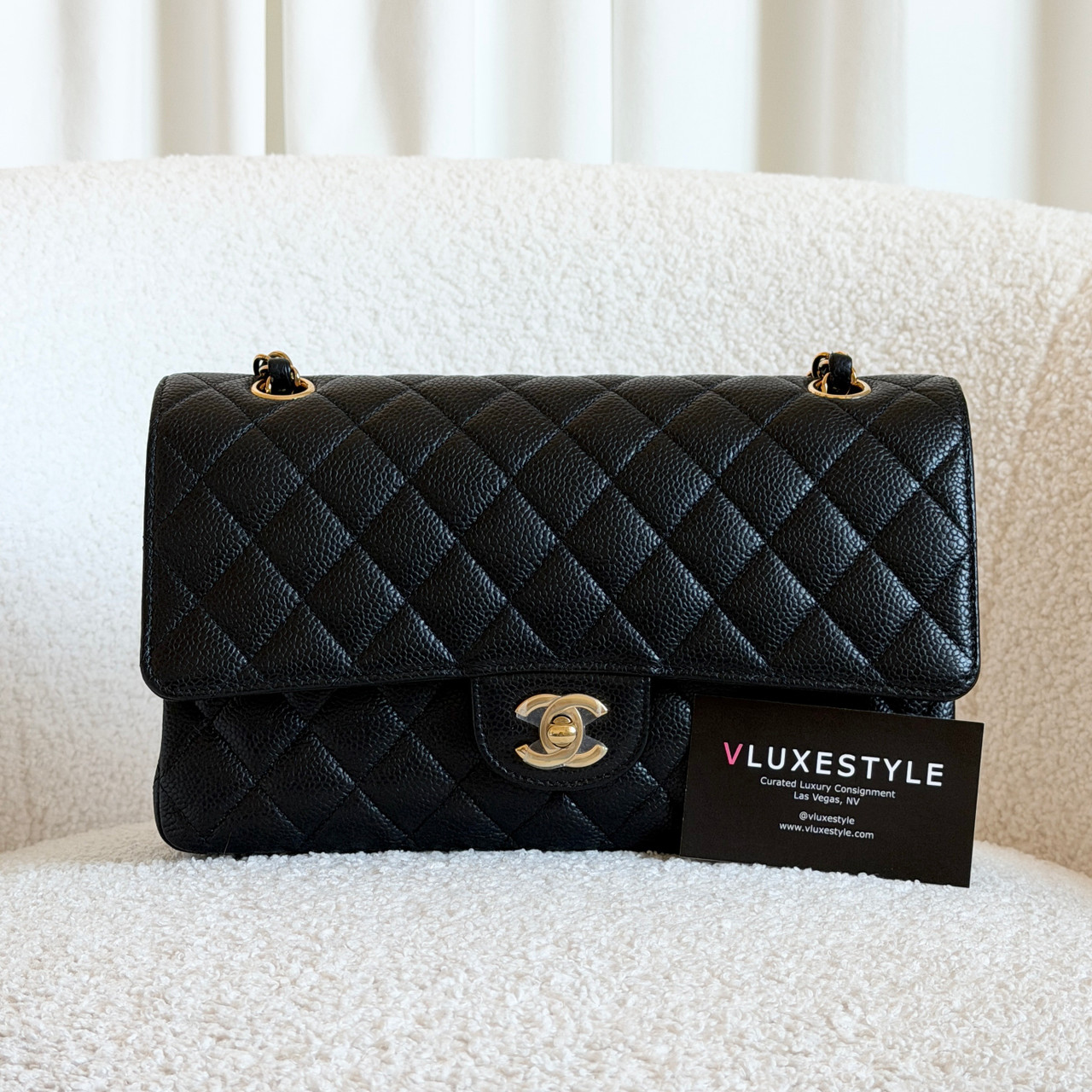 The Authentic Chanel Classic Medium Double Flap is a stunning shoulder bag crafted from luxurious, durable caviar leather in classic black. It is a versatile accessory that can elevate any outfit. The gold hardware adds a touch of glamour and luxury to the overall design.