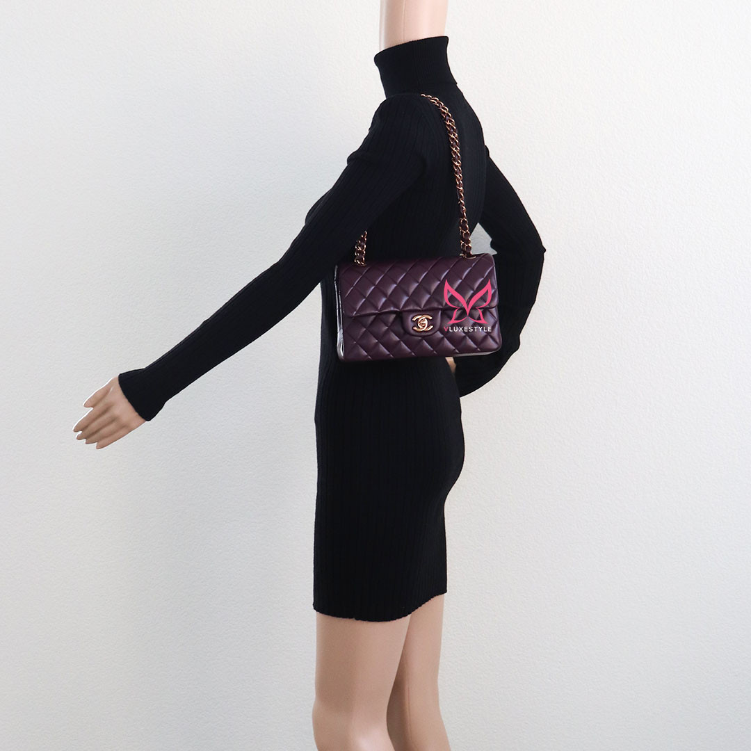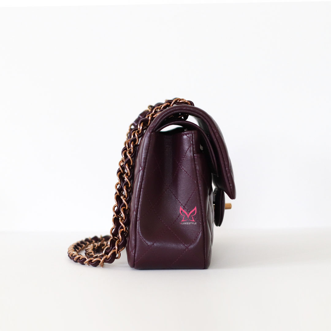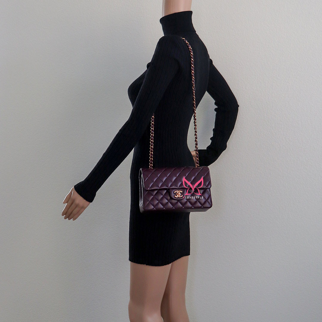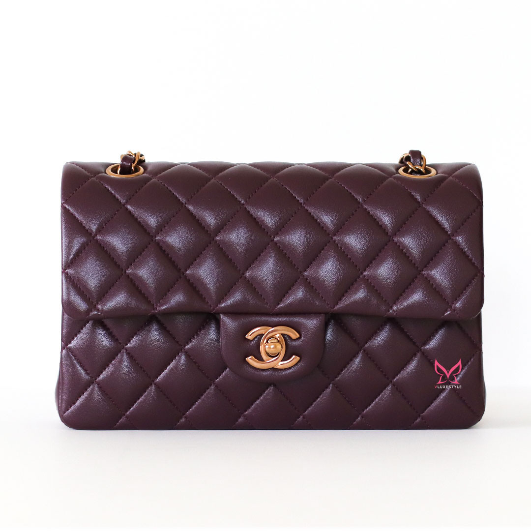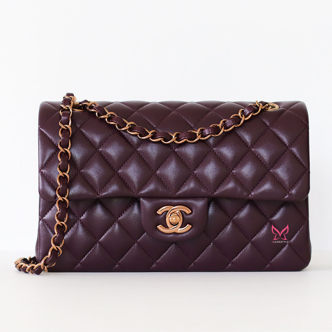 Introducing timeless elegance with the Chanel Classic Small Flap 24B in Burgundy Quilted Lambskin with Rose Gold Hardware. This exquisite handbag is crafted from luxurious lambskin leather in a deep, rich burgundy color that perfectly complements the limited-release rose gold hardware, making it a true collector's item.