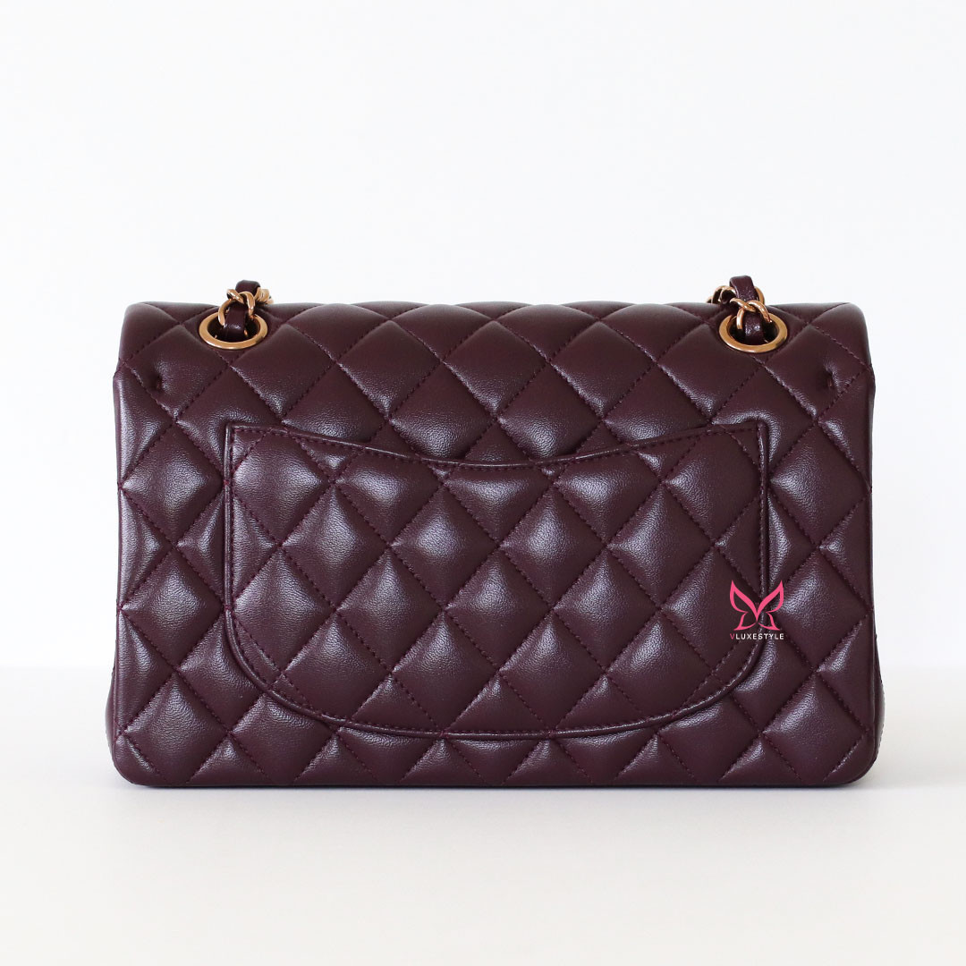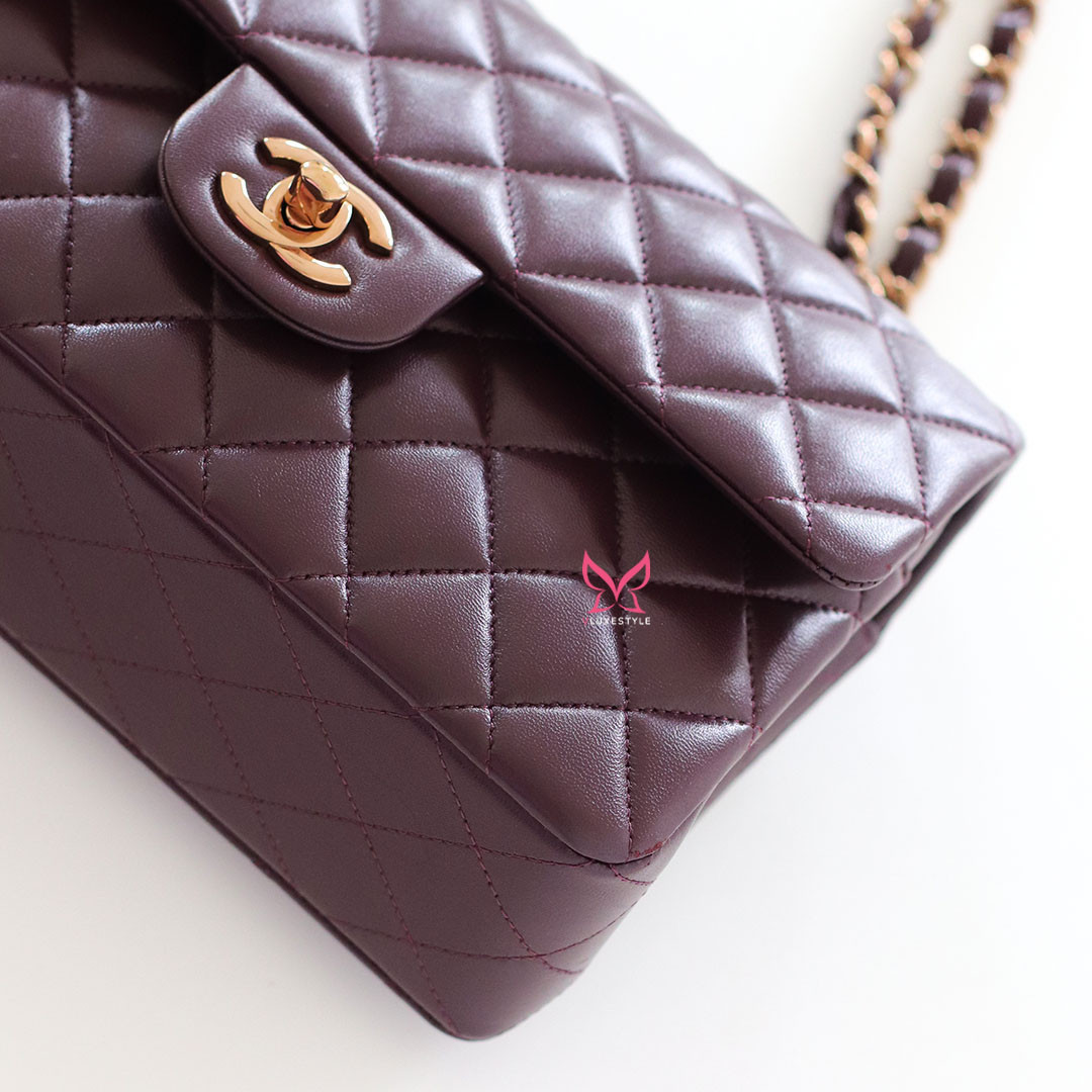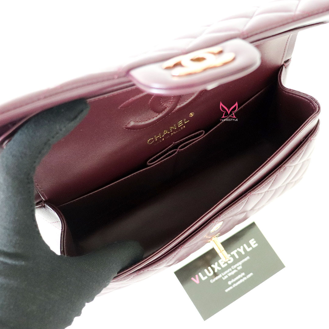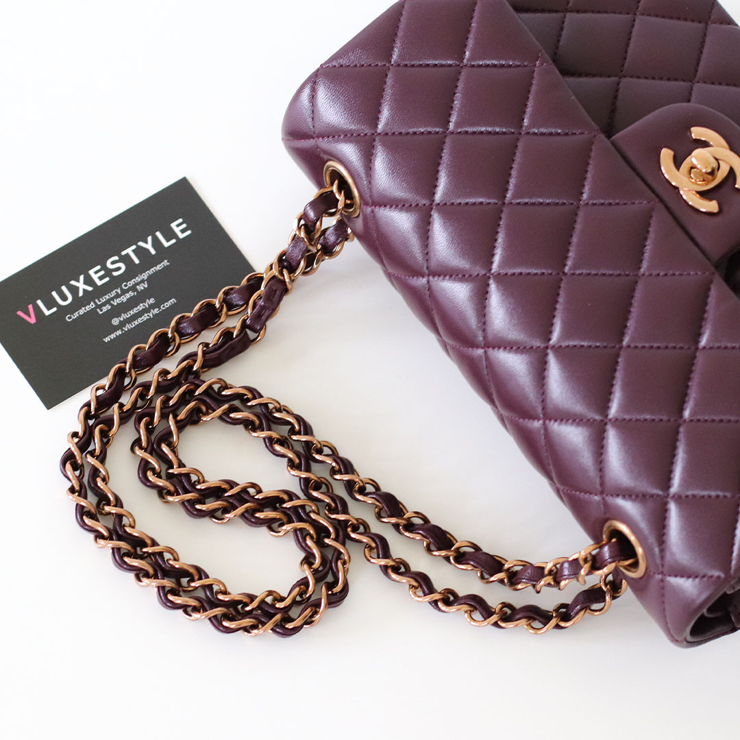 Introducing timeless elegance with the Chanel Classic Small Flap 24B in Burgundy Quilted Lambskin with Rose Gold Hardware. This exquisite handbag is crafted from luxurious lambskin leather in a deep, rich burgundy color that perfectly complements the limited-release rose gold hardware, making it a true collector's item.