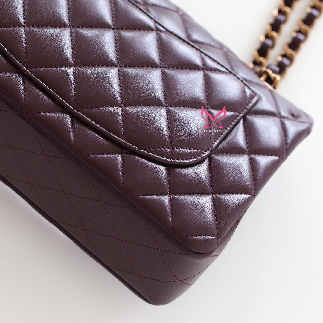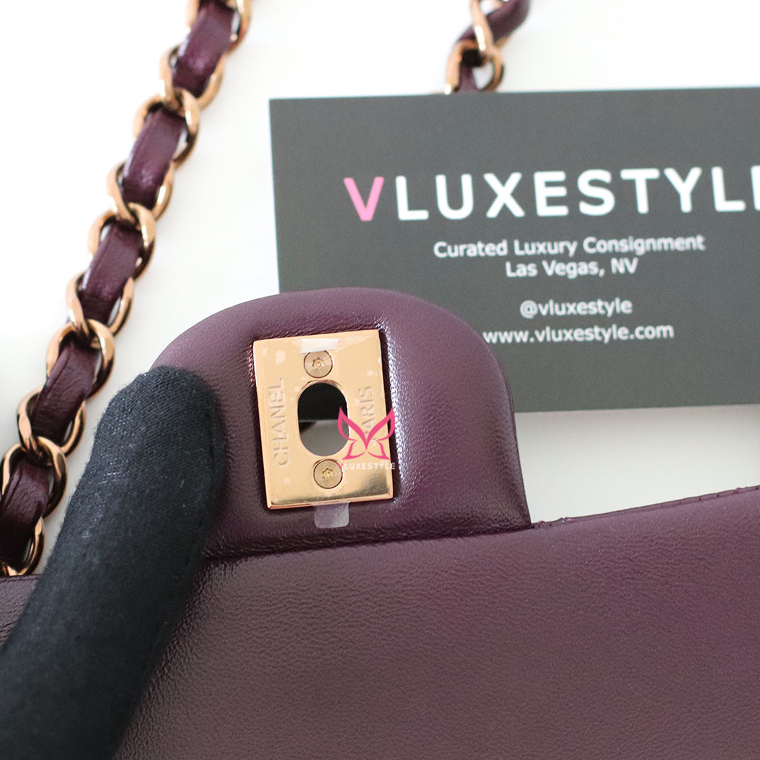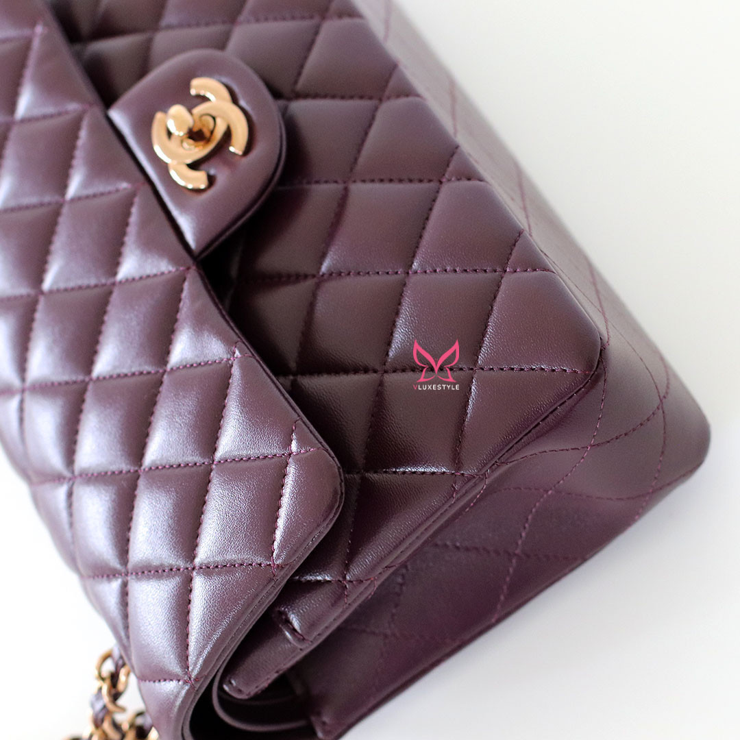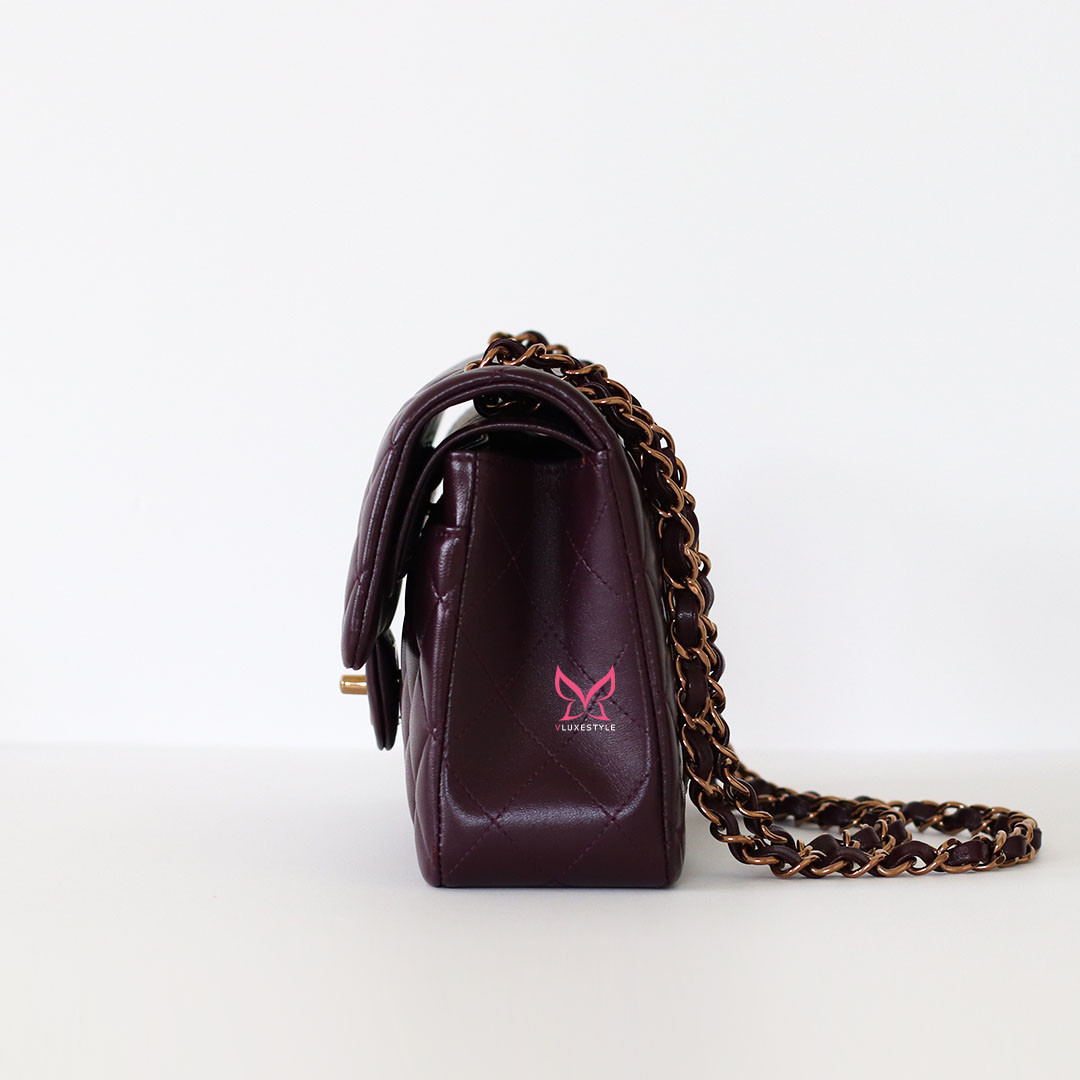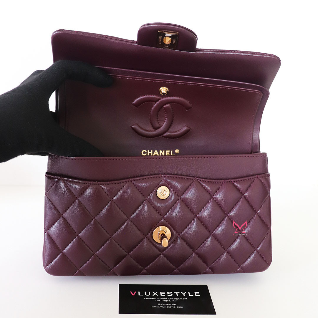 Introducing timeless elegance with the Chanel Classic Small Flap 24B in Burgundy Quilted Lambskin with Rose Gold Hardware. This exquisite handbag is crafted from luxurious lambskin leather in a deep, rich burgundy color that perfectly complements the limited-release rose gold hardware, making it a true collector's item.