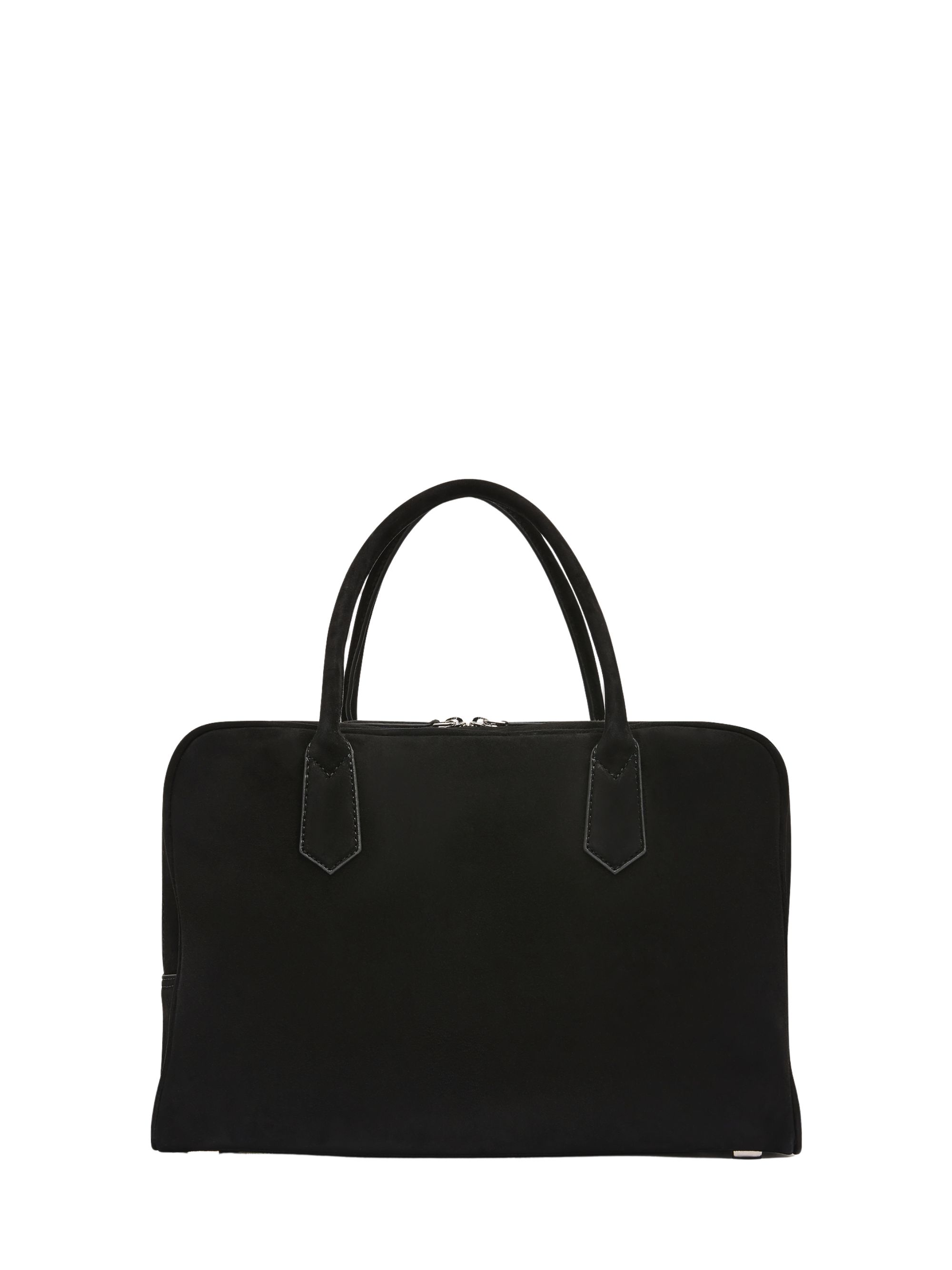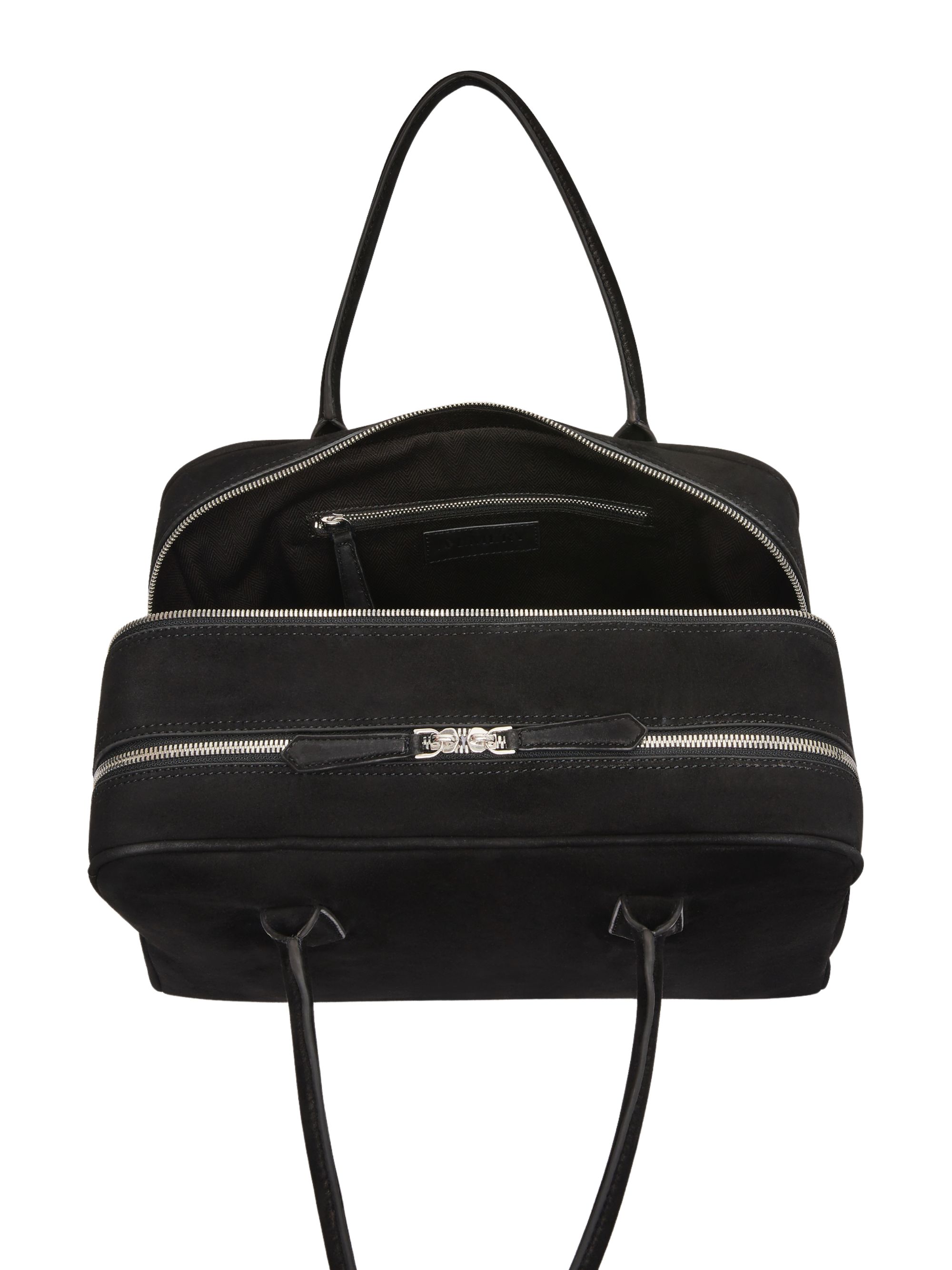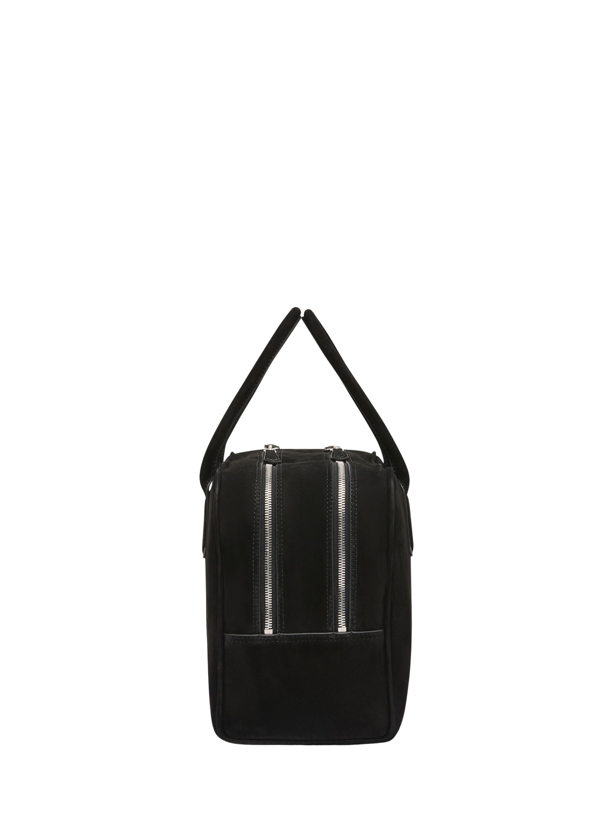Talbot bag by A.EMERY in black suede featuring a square silhouette, two internal compartments, a tubular shoulder strap, lining in fine cotton twill, and a zip closure. Dimensions: 38x24x16 cm.