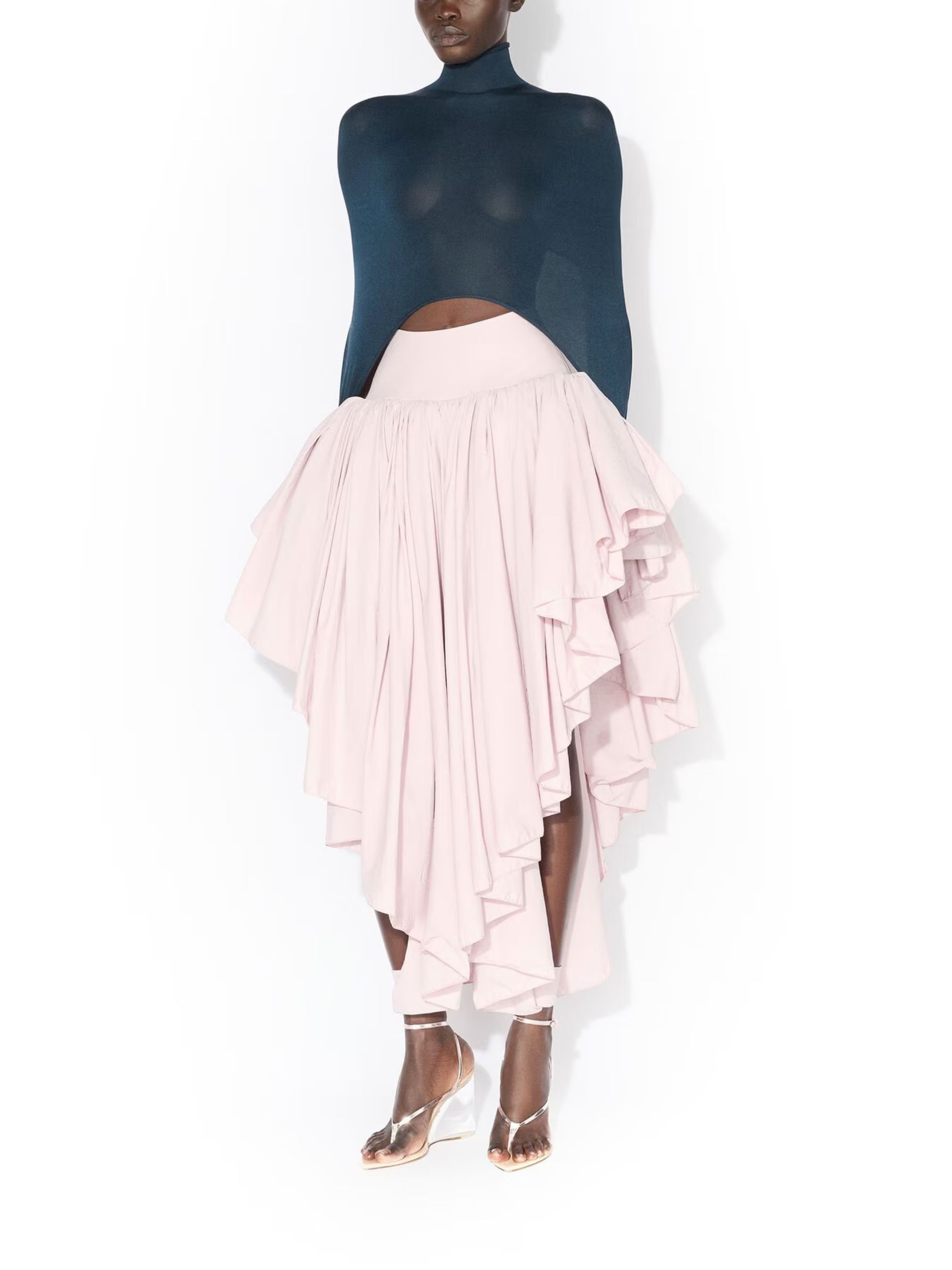 ALAIA pink maxi skirt in lightweight nylon featuring a high waist, side openings, an asymmetric hem, a loose fit and a zip fastening.