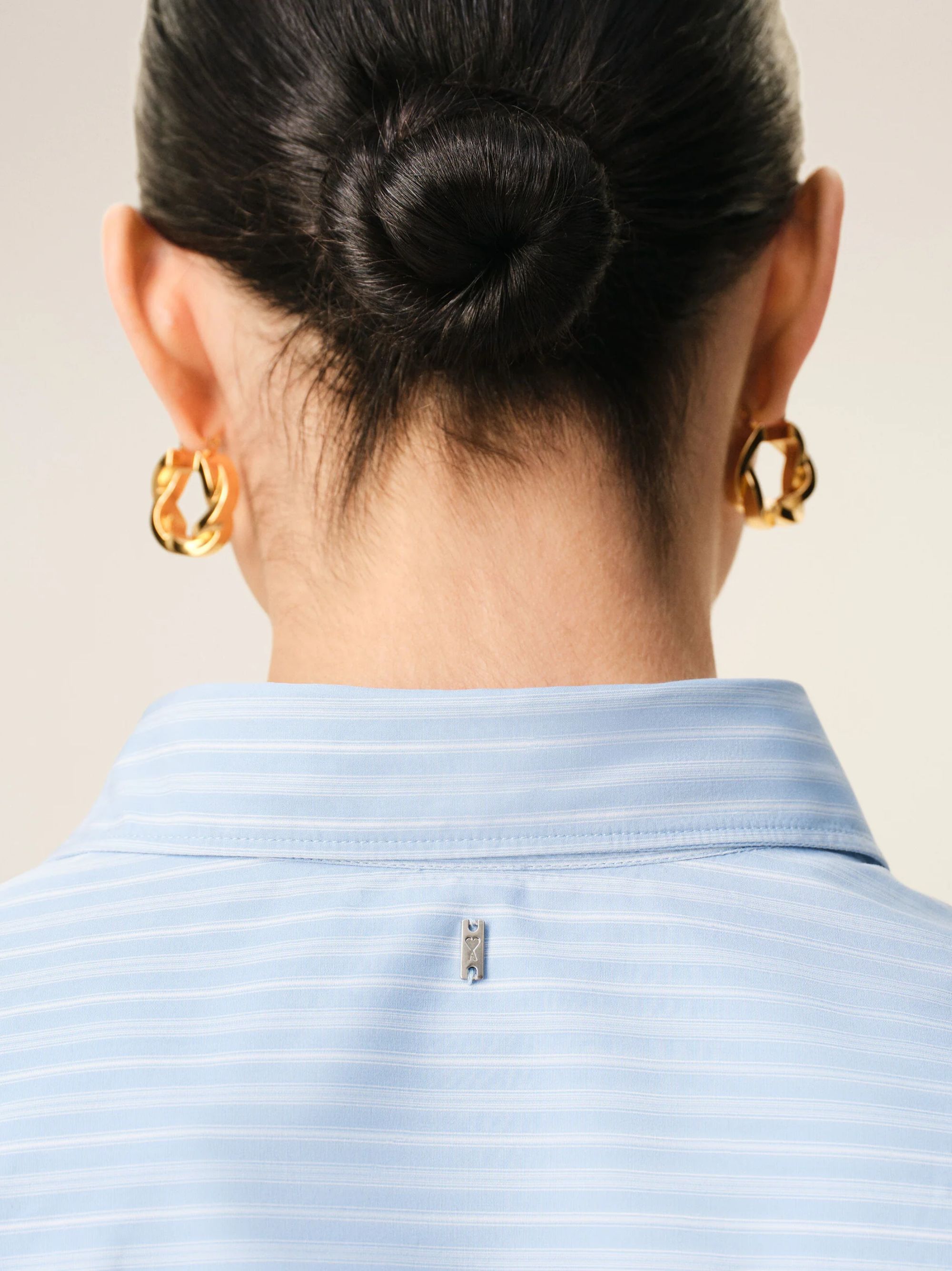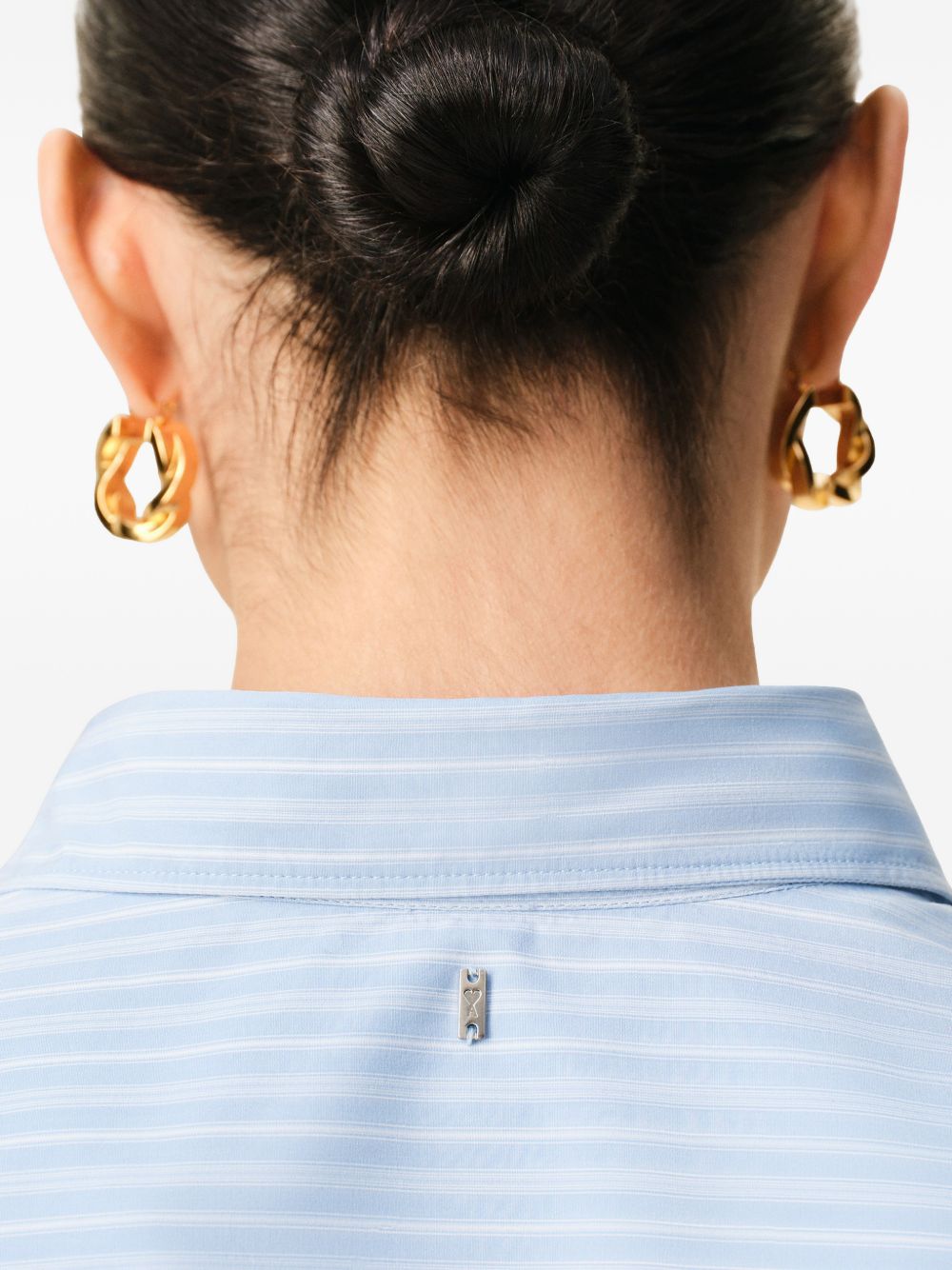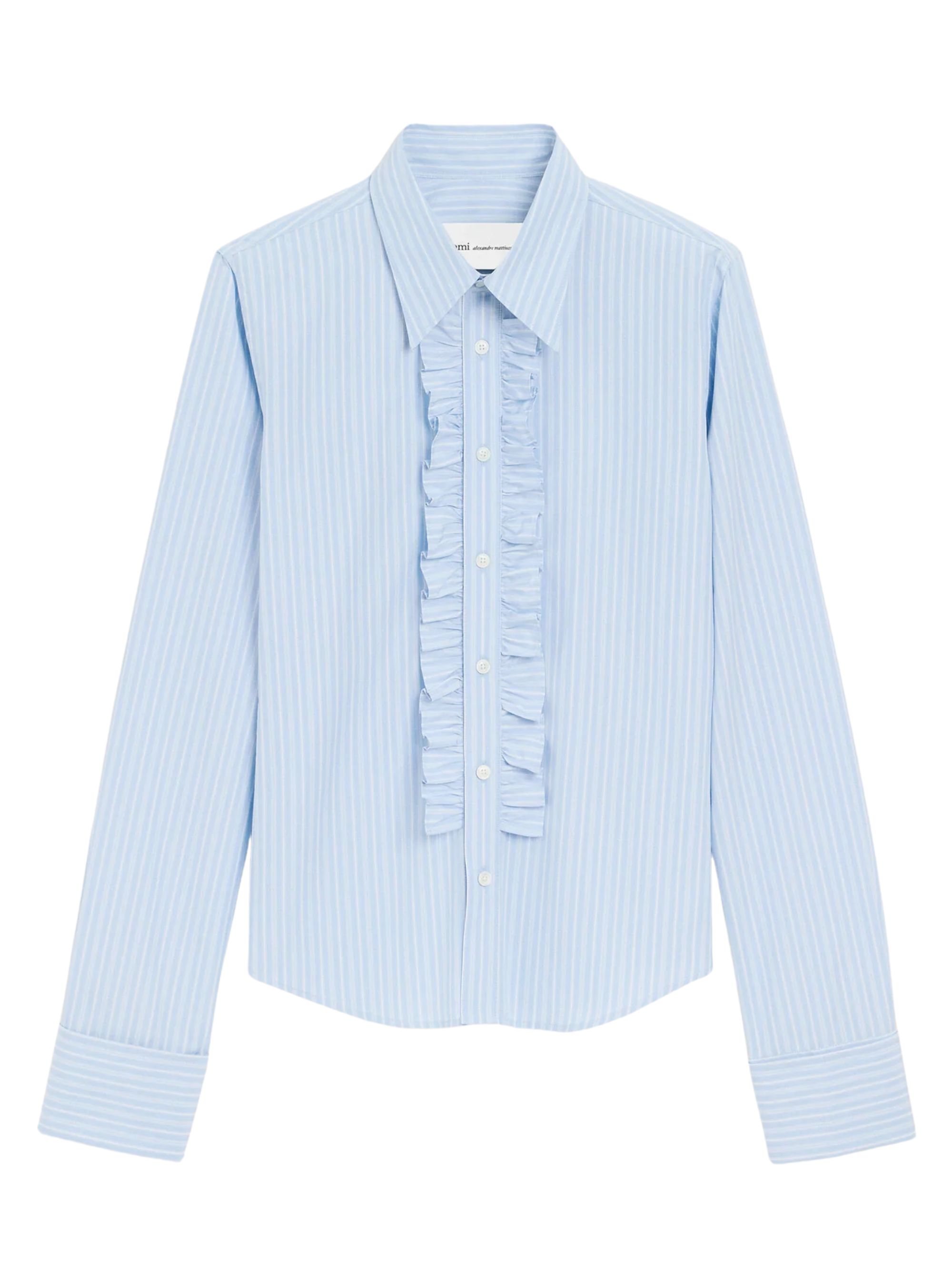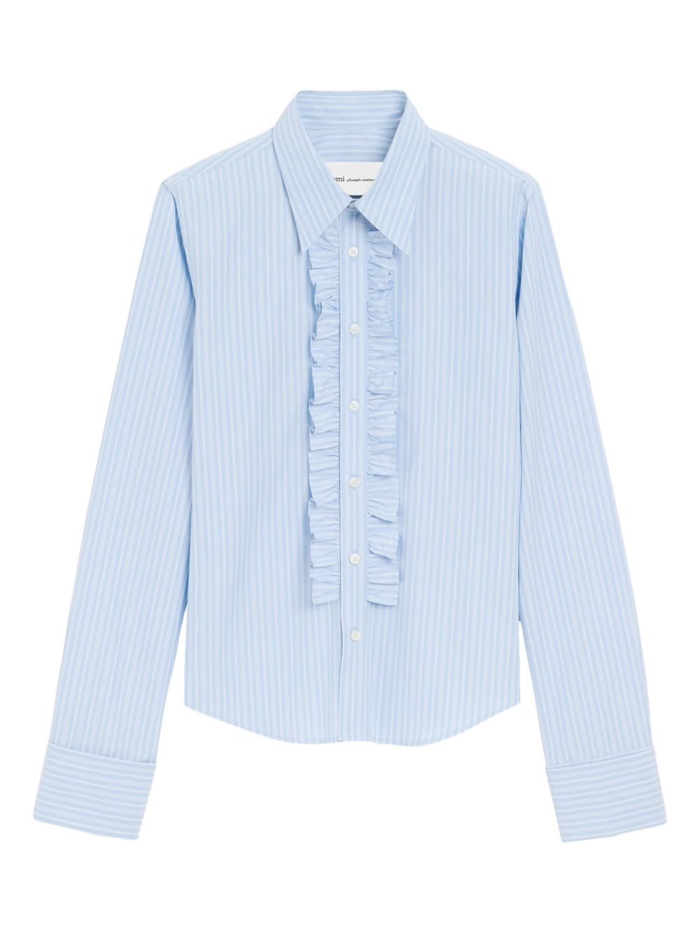 AMI PARIS blue cotton fitted jabot shirt featuring a fitted cut, classic collar, Ami de Coeur plaque at the center back, mother-of-pearl buttons and cufflinks.