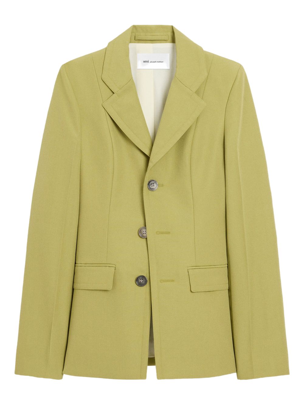 AMI PARIS green single-breasted fitted wool jacket featuring a fitted cut, single-breasted button fastening, Ami horn buttons, flap pockets, central vent on the back, 1 functional buttonhole and 2 decorative ones.
