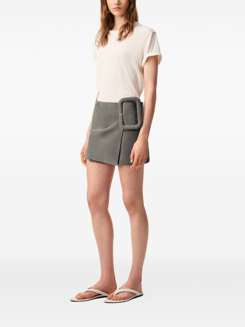 AMI PARIS grey suede belted mini skirt featuring nappa leather interior trim, maxi covered buckle and Ami galatite buttons inside the belt.