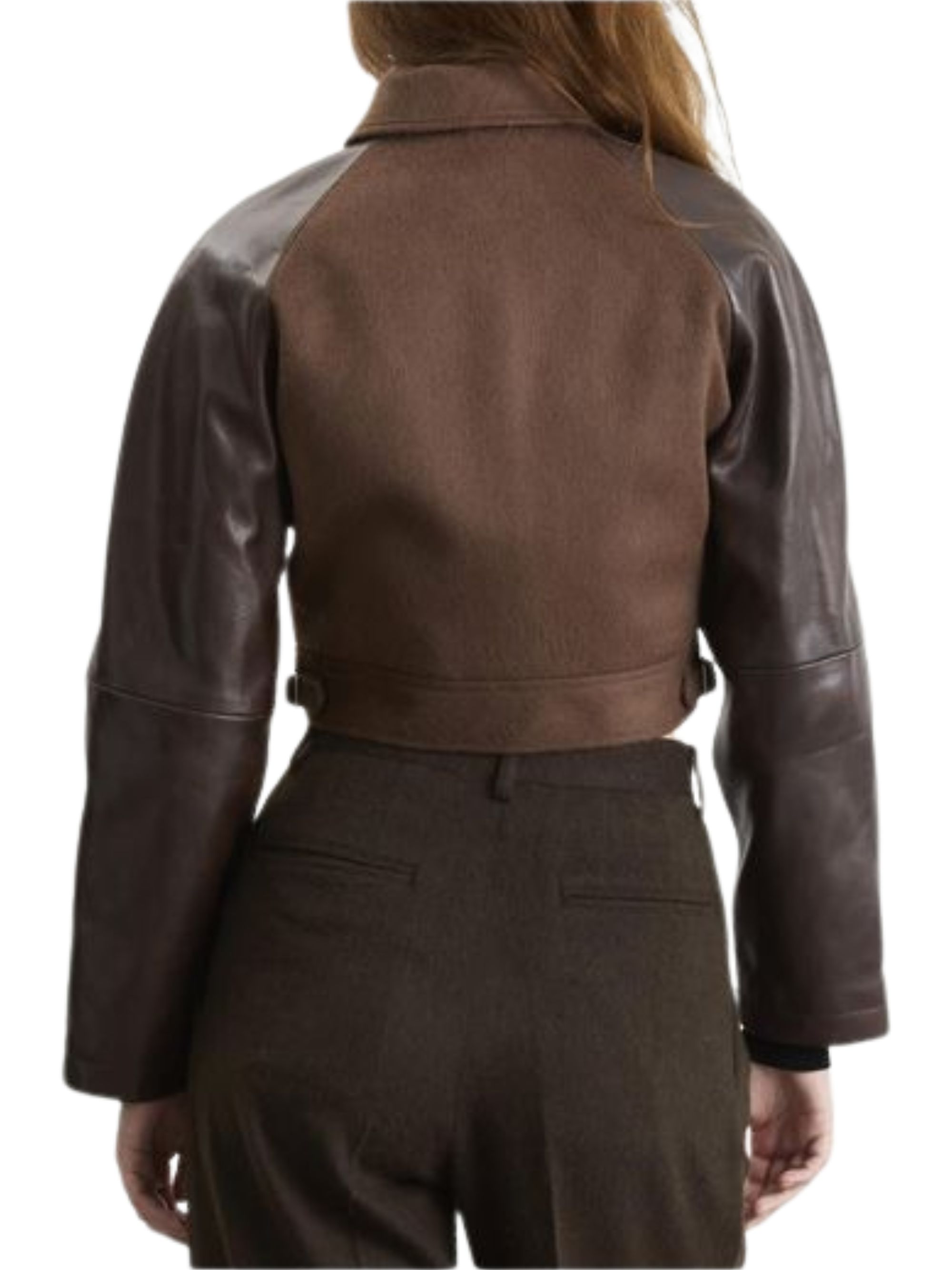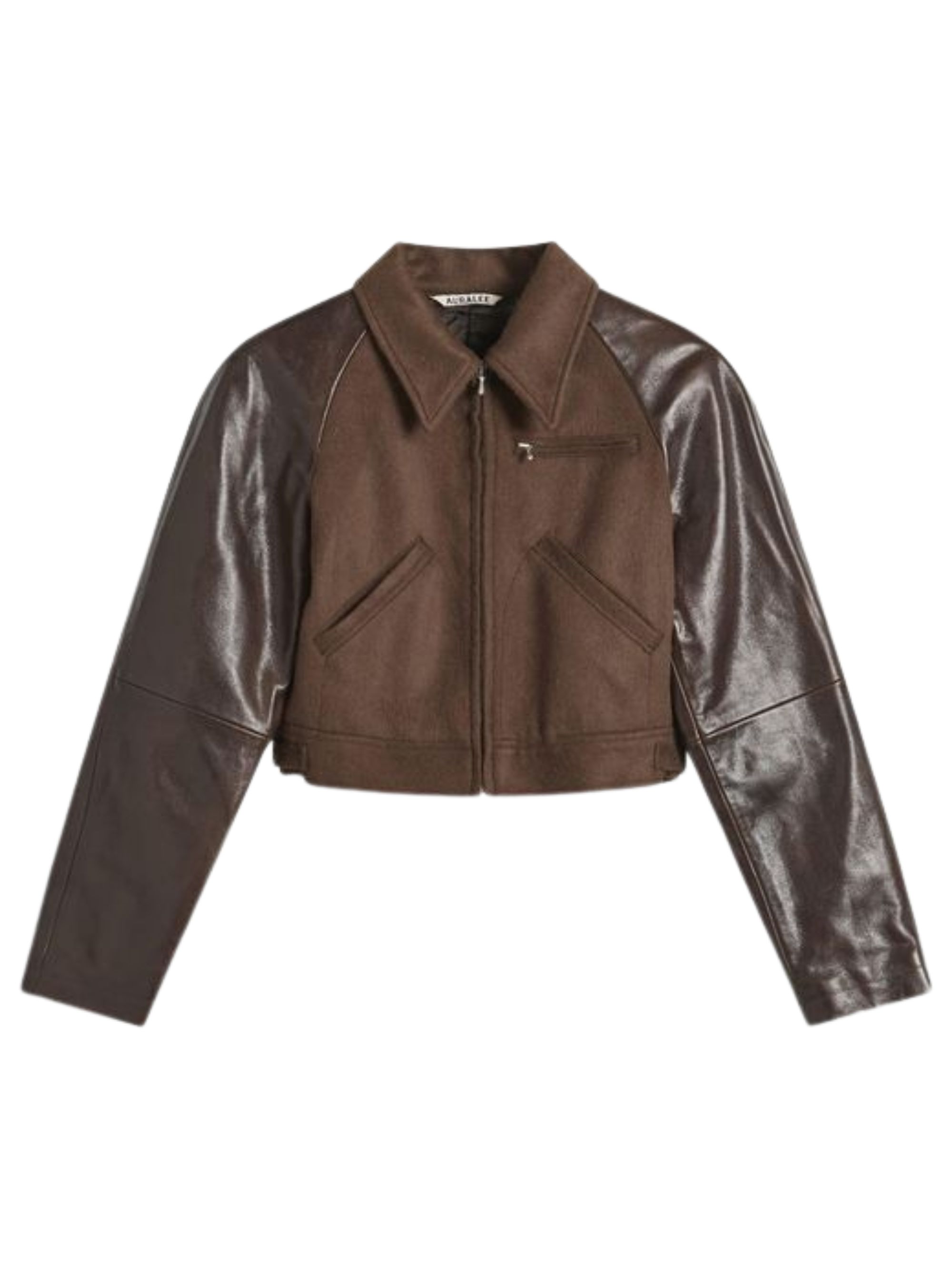 AURALEE brown wool cloth crop jacket with leather details, collar, pockets, and zip closure.