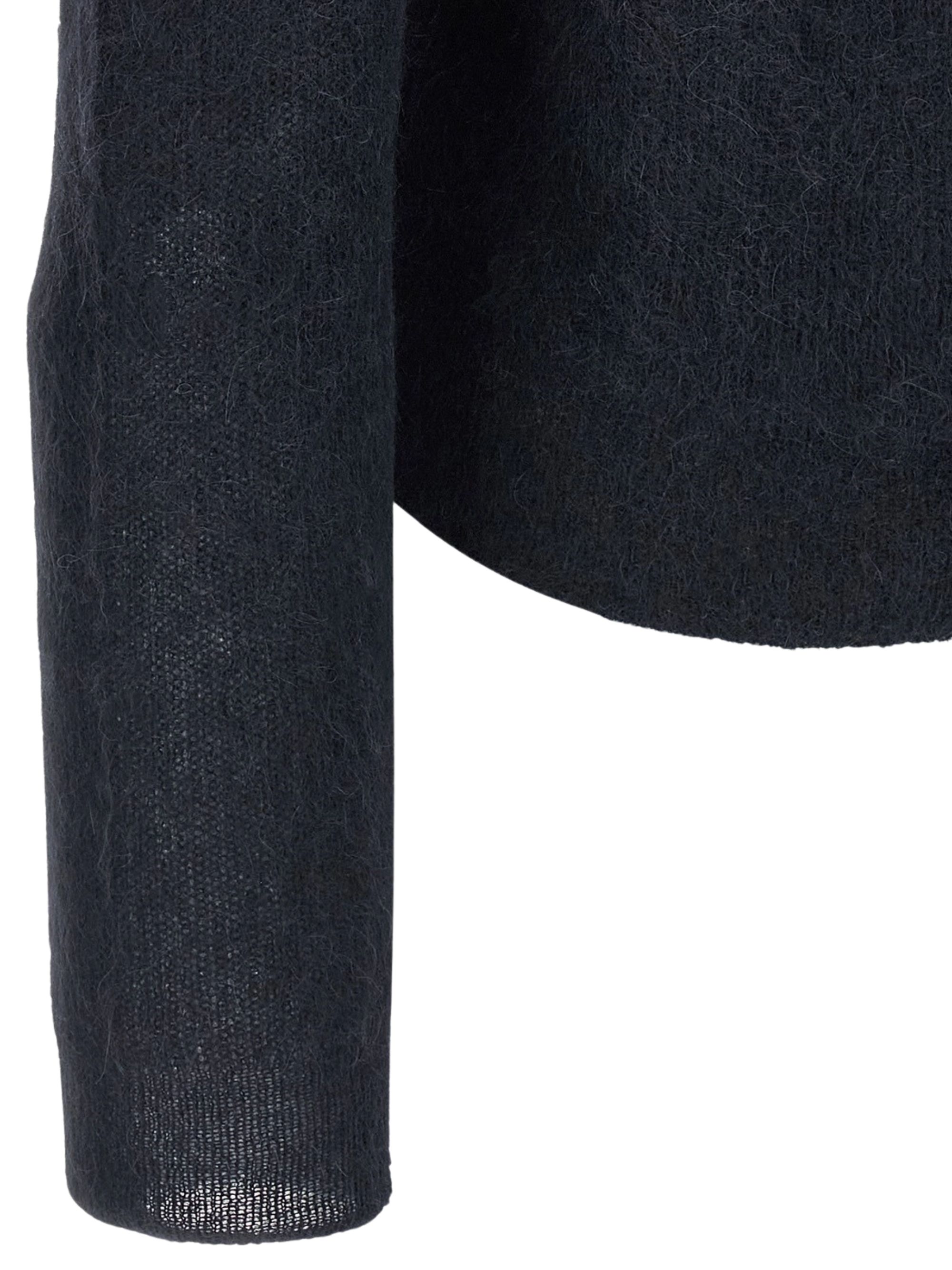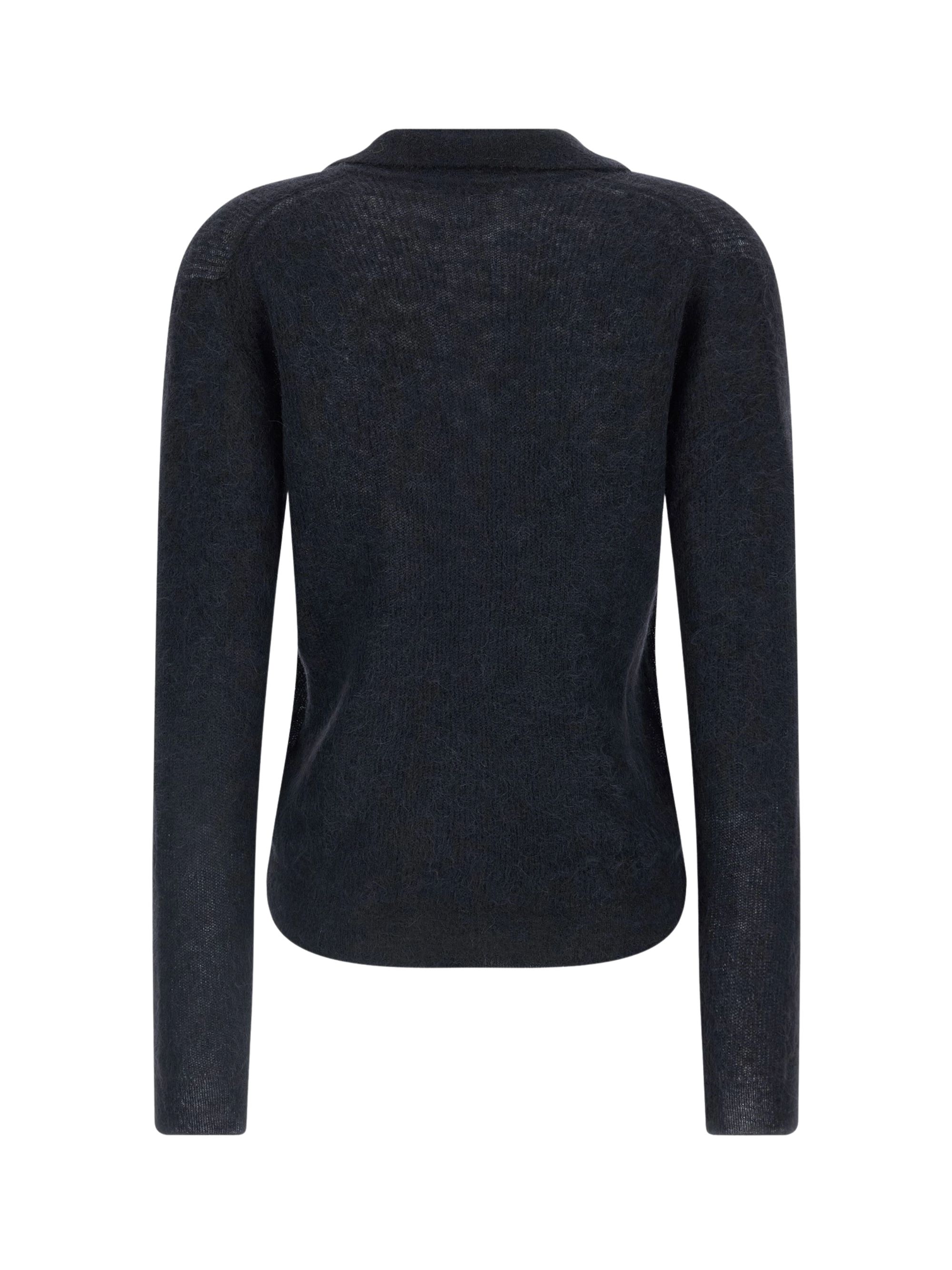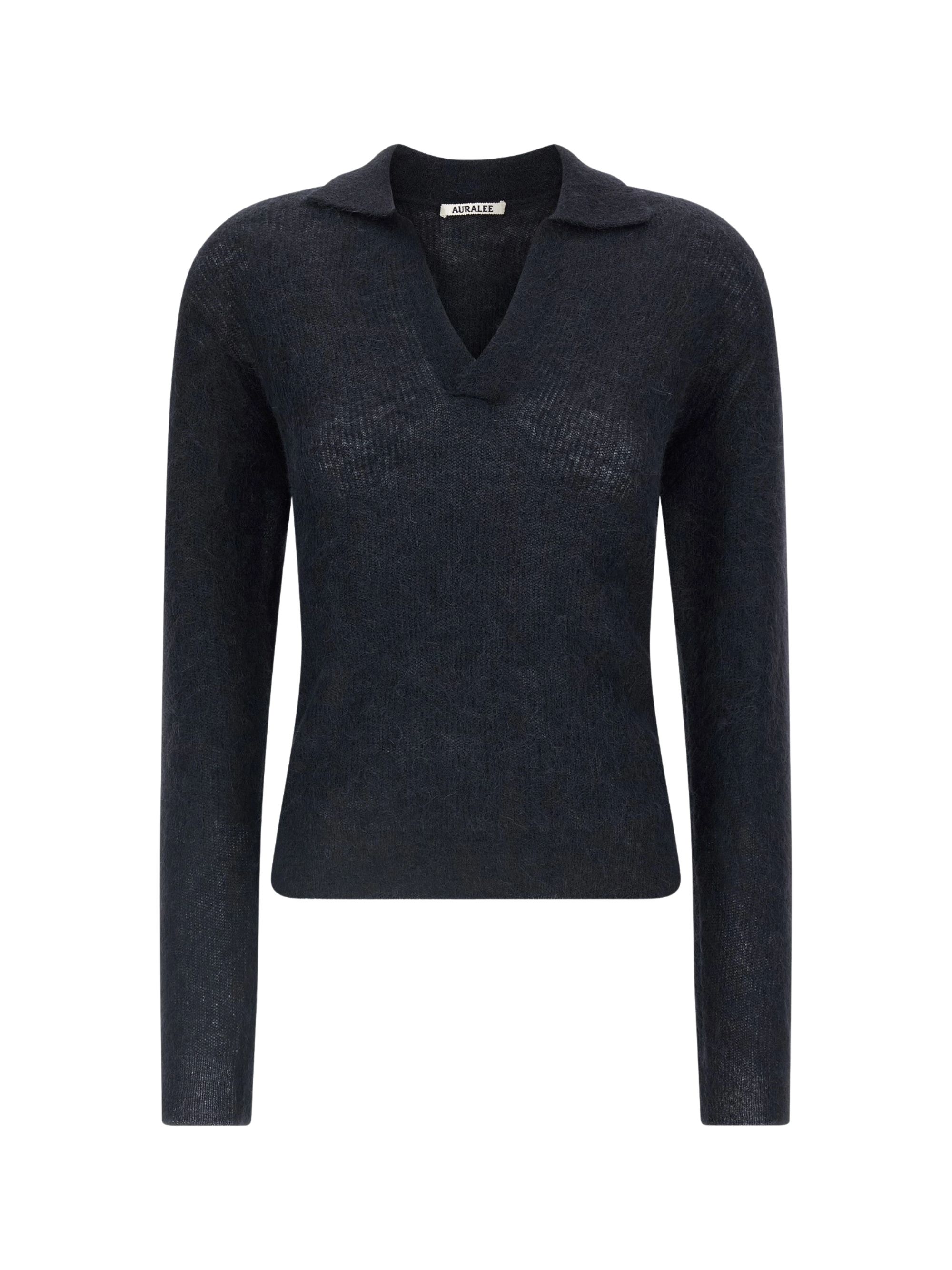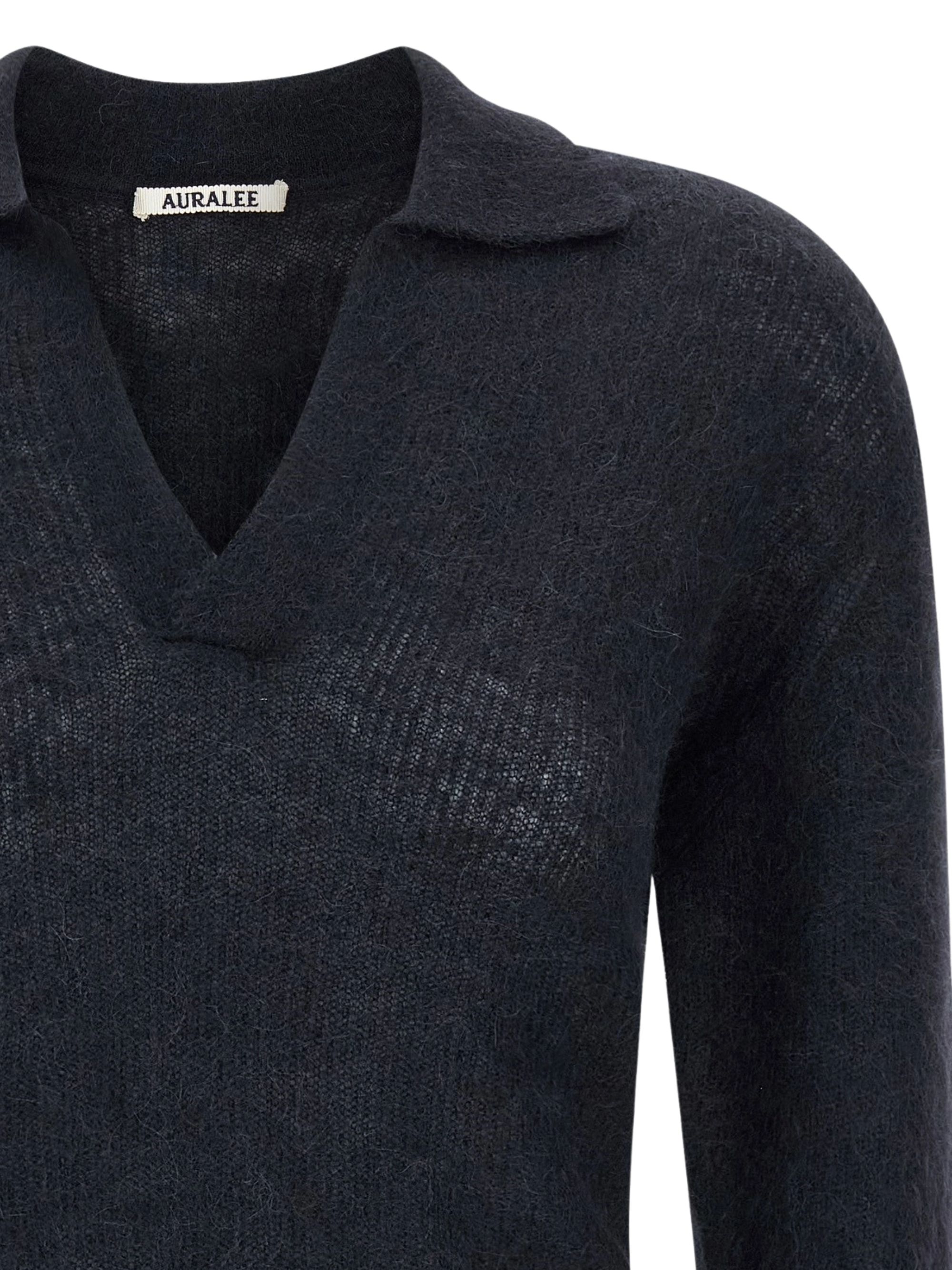 AURALEE blue brushed alpaca wool Skipper sweater with ribbed trim, collar, and V-neck.