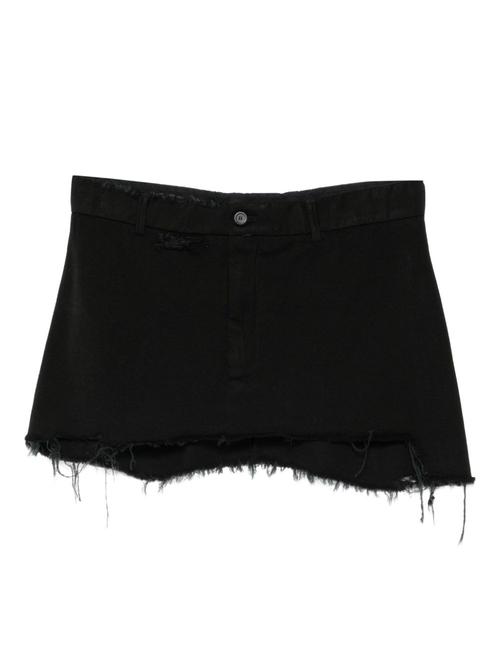 BALENCIAGA black cotton cargo miniskirt with belt loops, an asymmetrical frayed hem, and a zip and button closure.