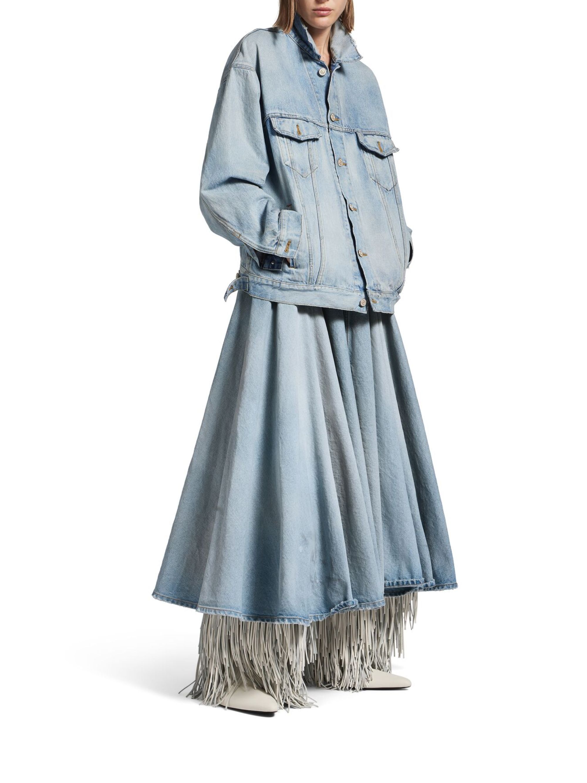 Godet skirt by BALENCIAGA in light blue cotton denim, featuring a faded and worn effect, mid-rise, concealed zip fly, 5 belt loops, 5 pockets, godet hem and Balenciaga applique on the back.