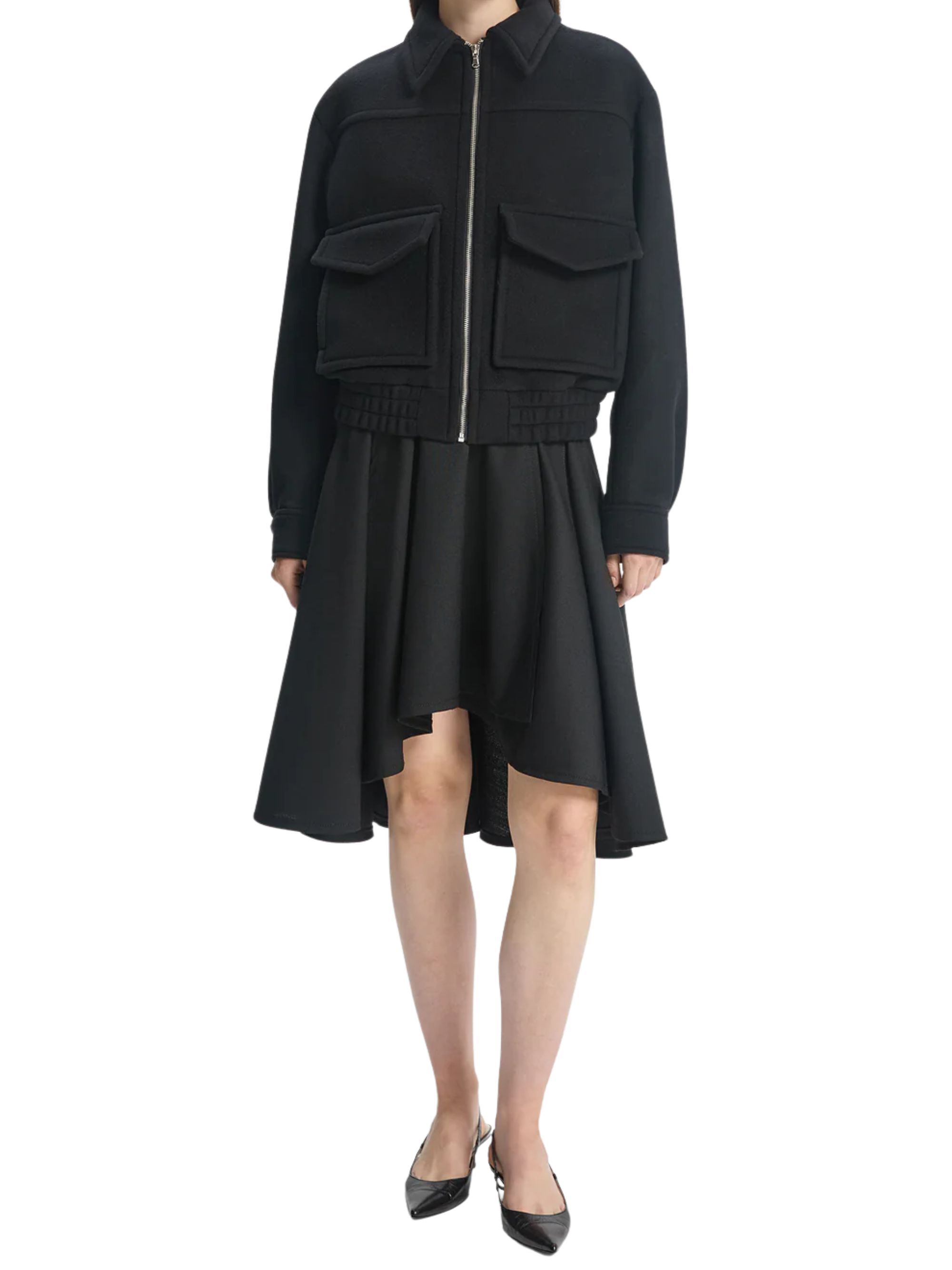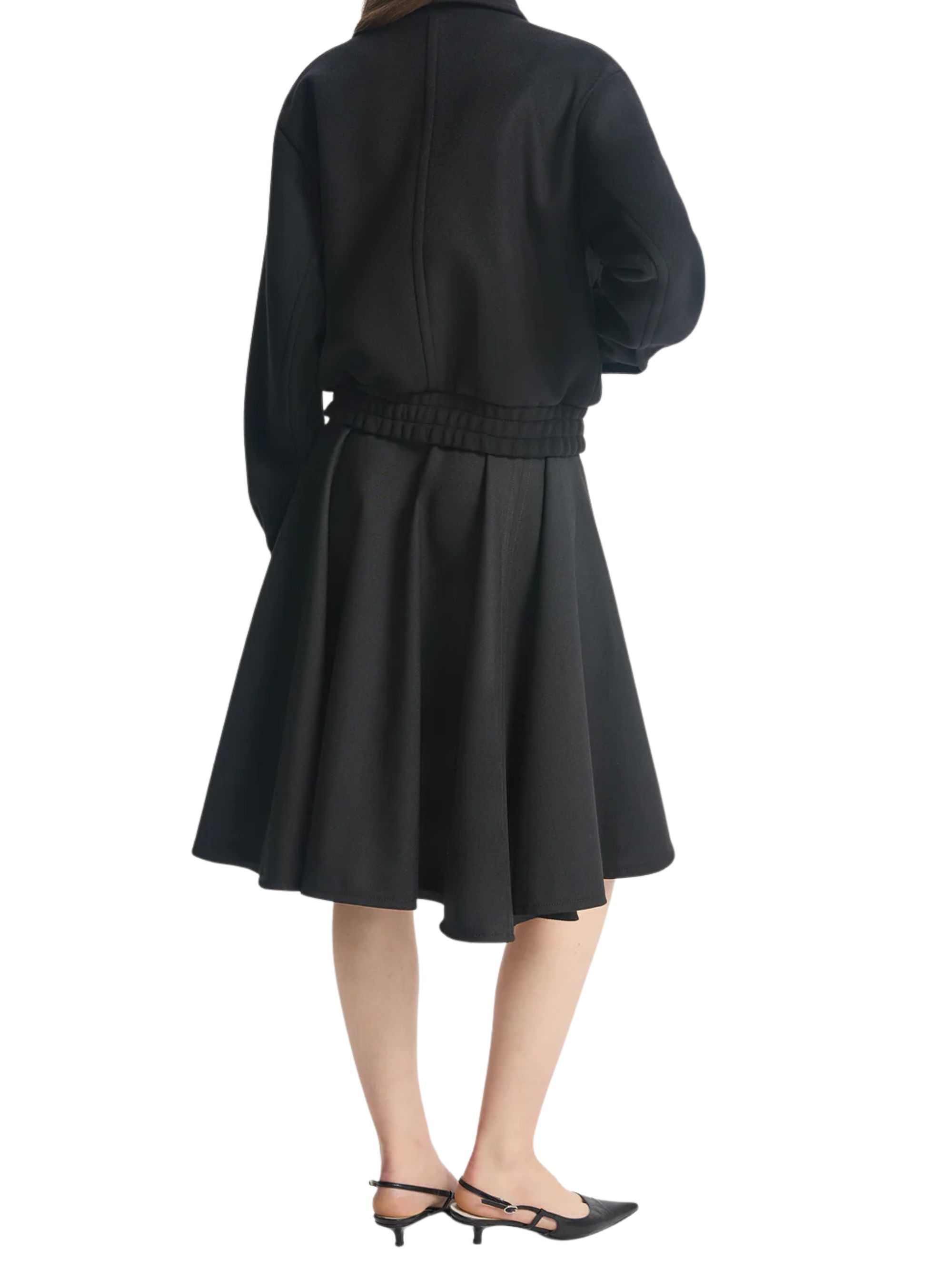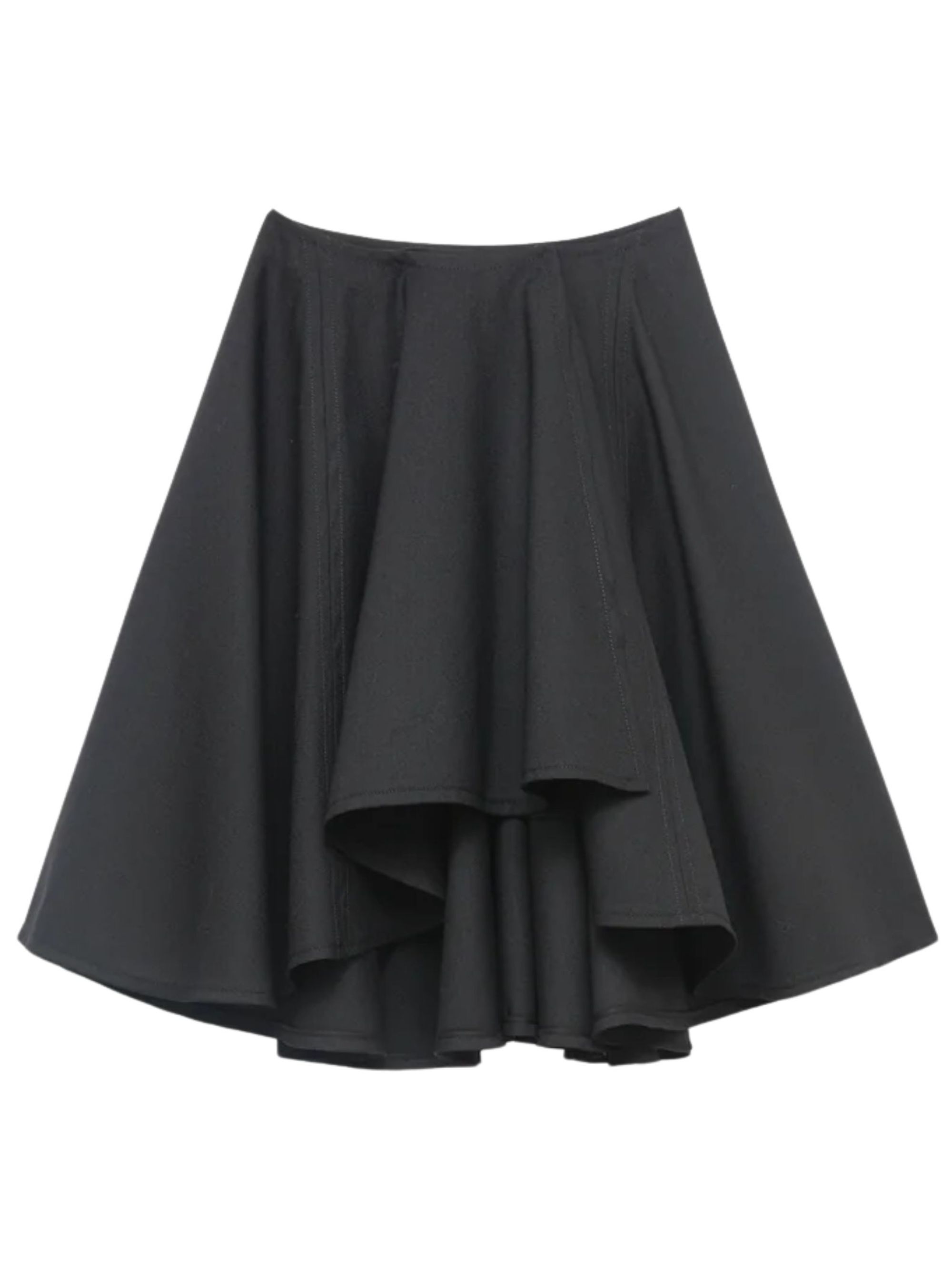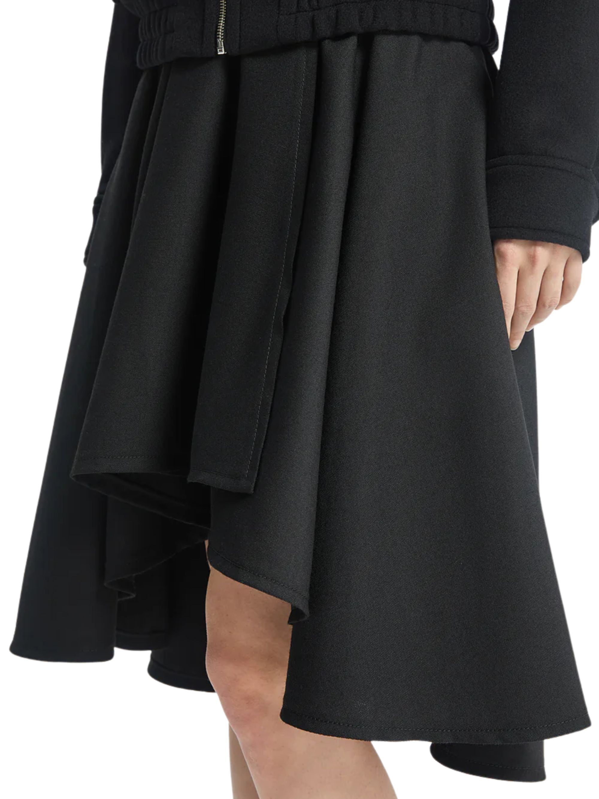 Voluminous tailored skirt from BITE STUDIOS in black wool, featuring a curved hem, a voluminous, draped silhouette and a hook and button fastening.