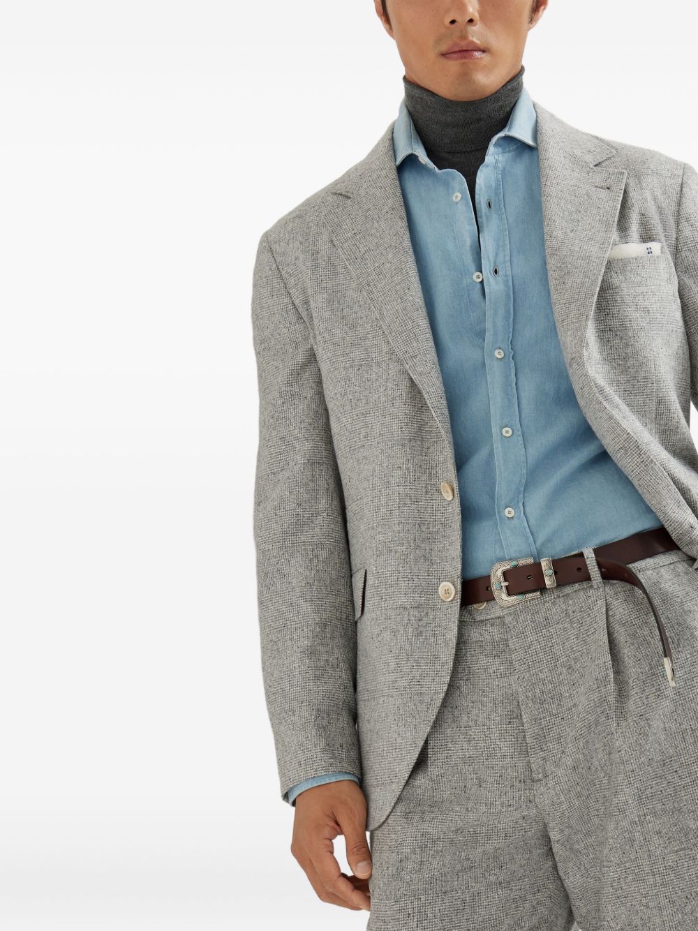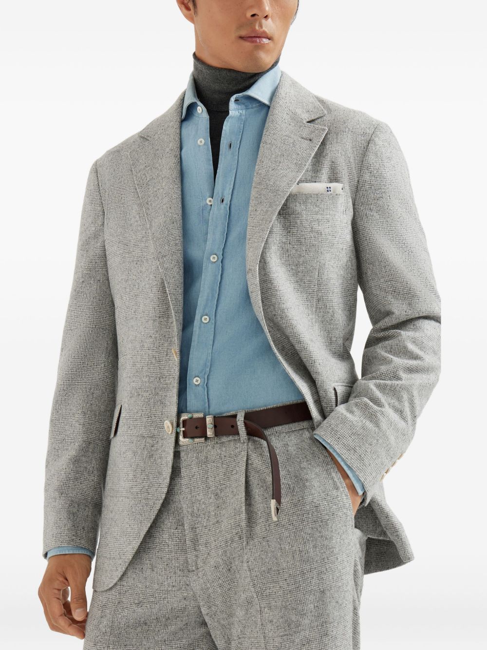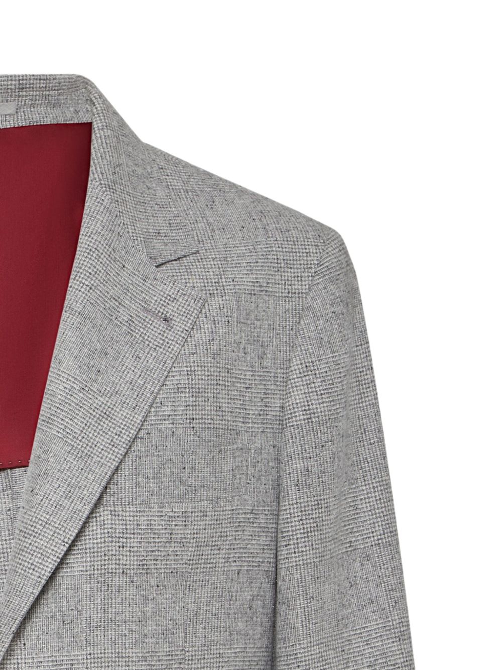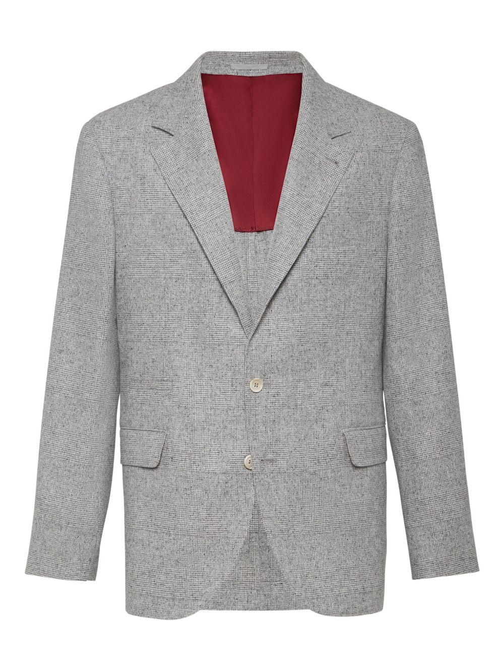 Giacca decostruita di BRUNELLO CUCINELLI grigia in misto lana, seta e cashmere con motivo a quadri Principe di Galles, revers classici, tasche ad aletta, retro semplice e chiusura con tre bottoni.
