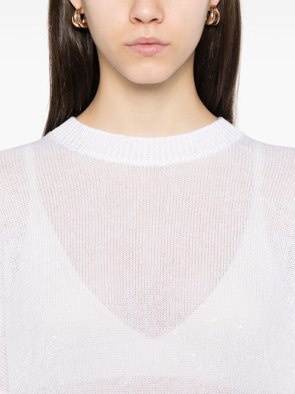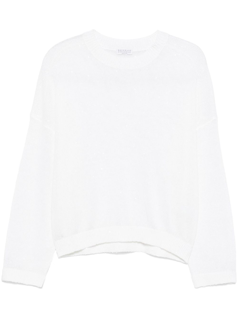BRUNELLO CUCCINELLI white linen and silk sequin sweater featuring ribbed trims, a dropped shoulder design, long sleeves and all-over sequins.