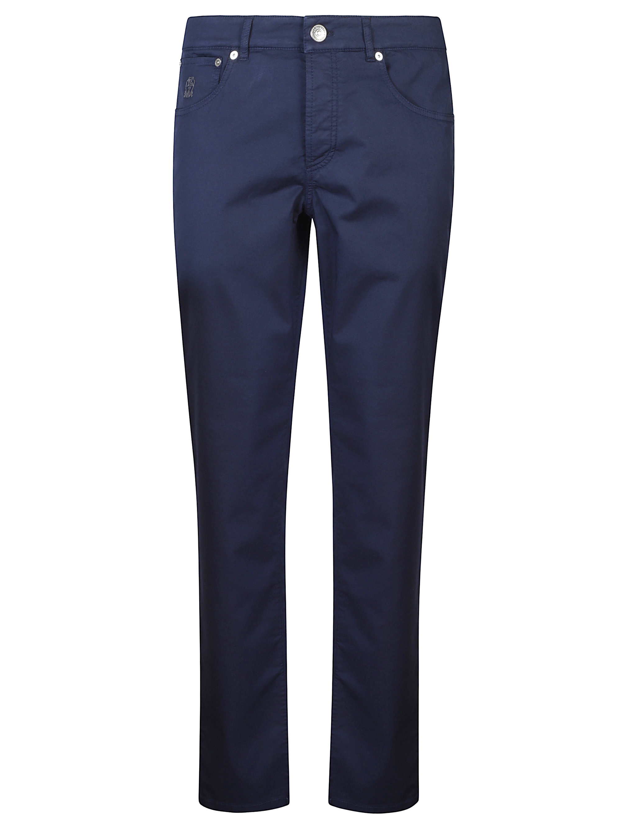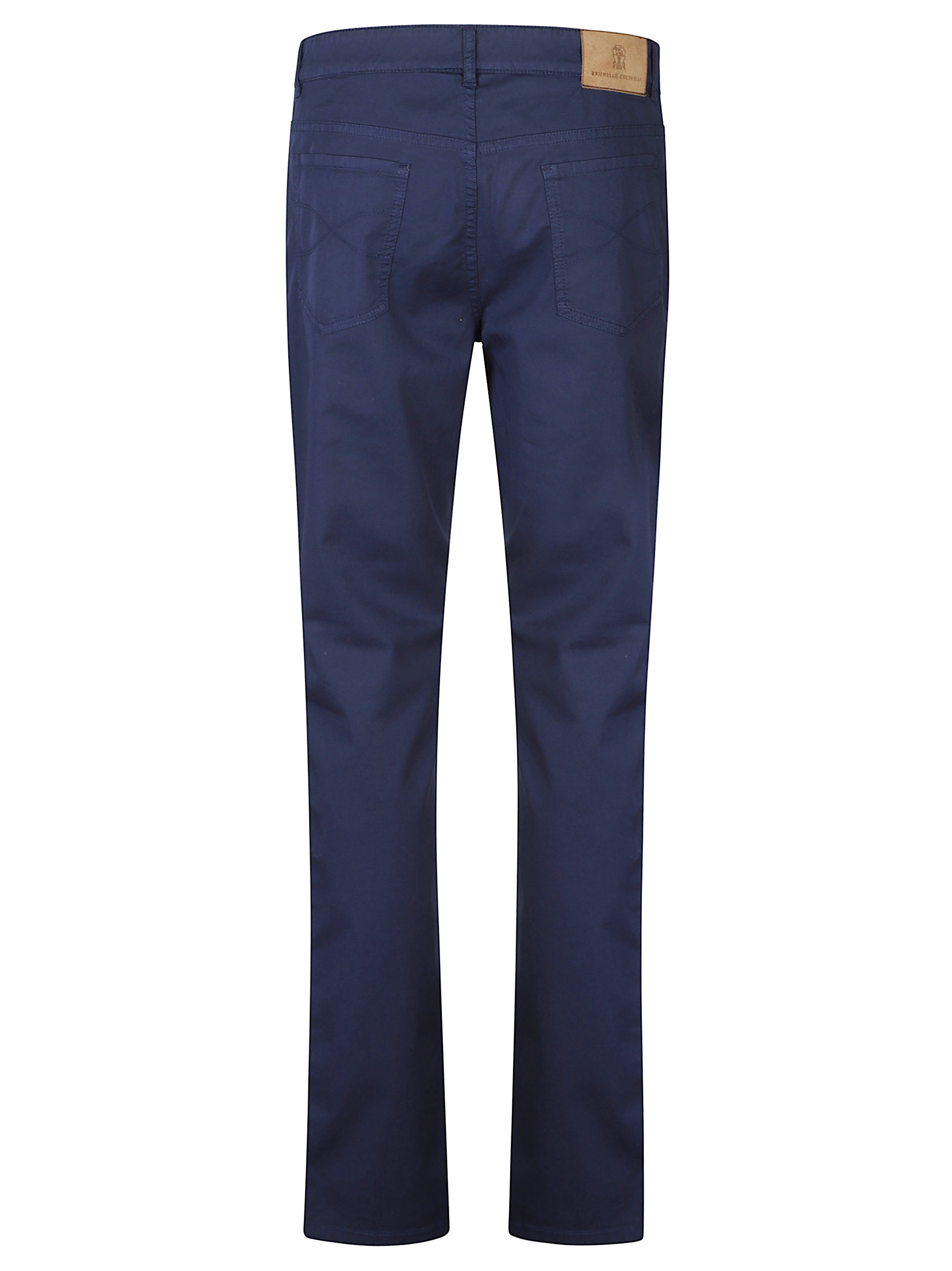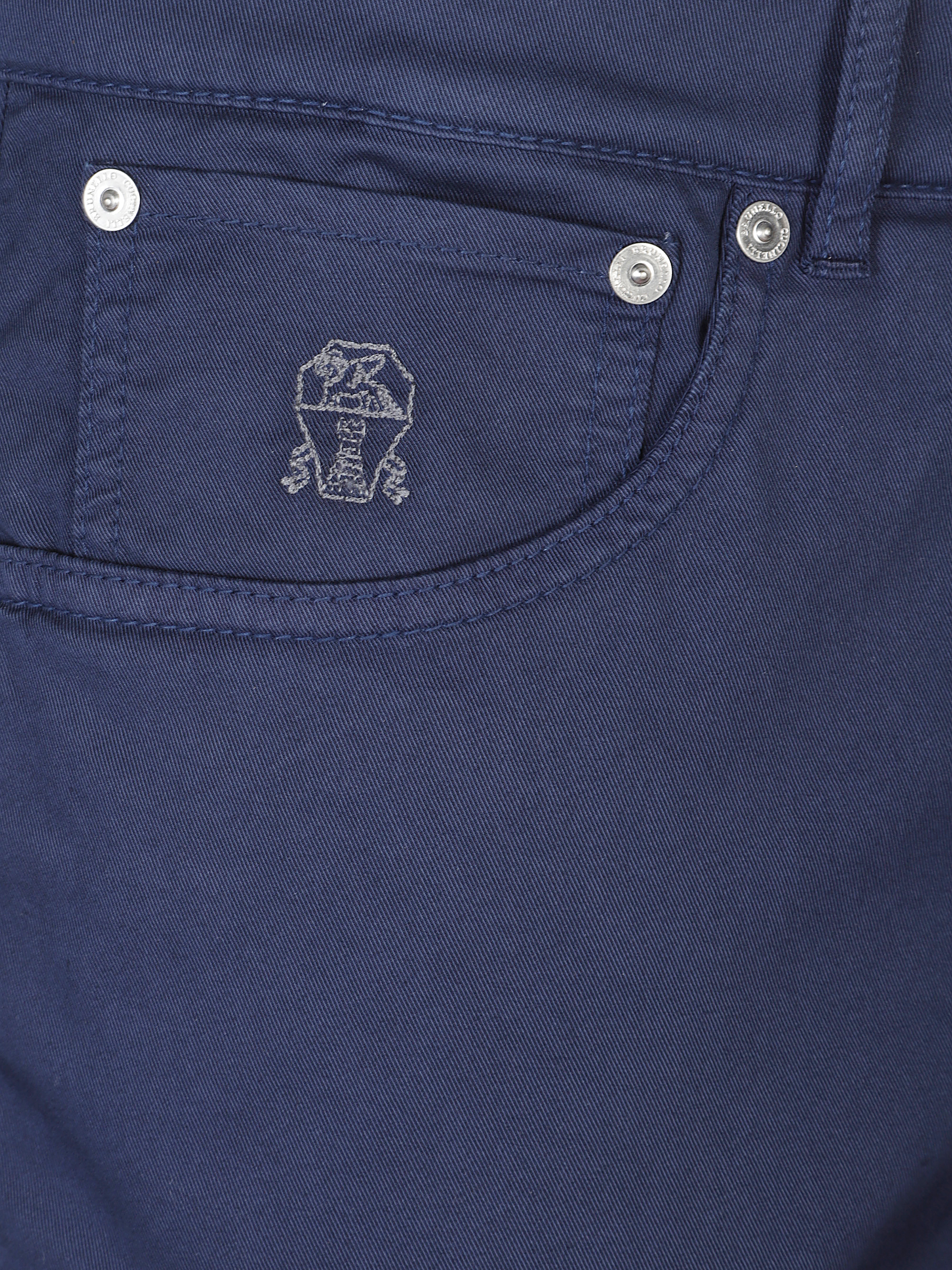 BRUNELLO CUCINELLI blue cotton trousers with logo, featuring a straight leg, zip and button fastening and embroidered logo on the pocket.