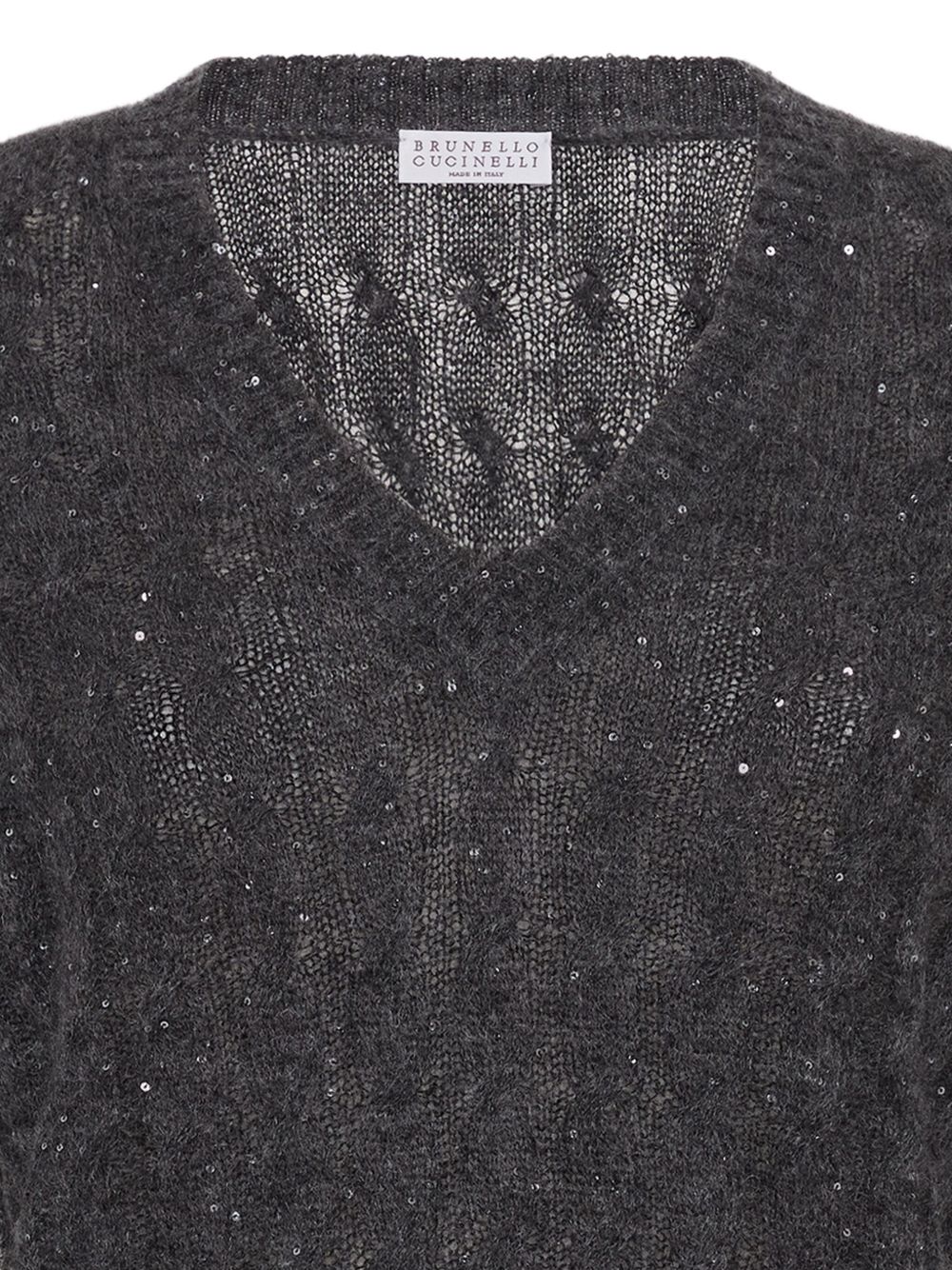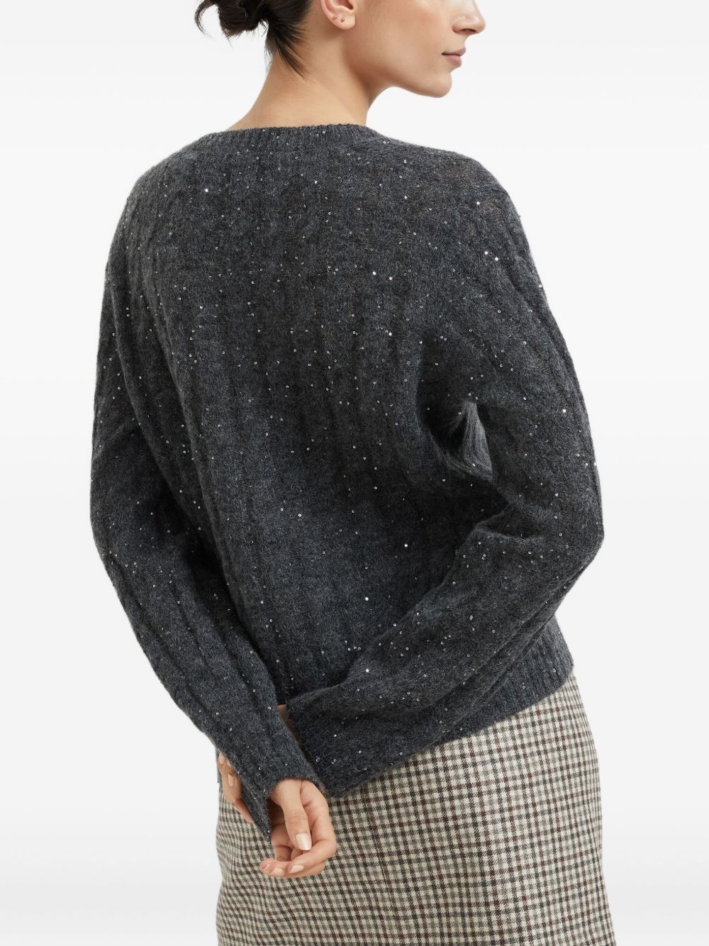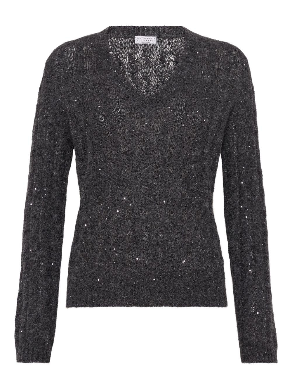 BRUNELLO CUCINELLI anthracite grey cable knit wool sweater with glitter, V-neck and ribbed edges