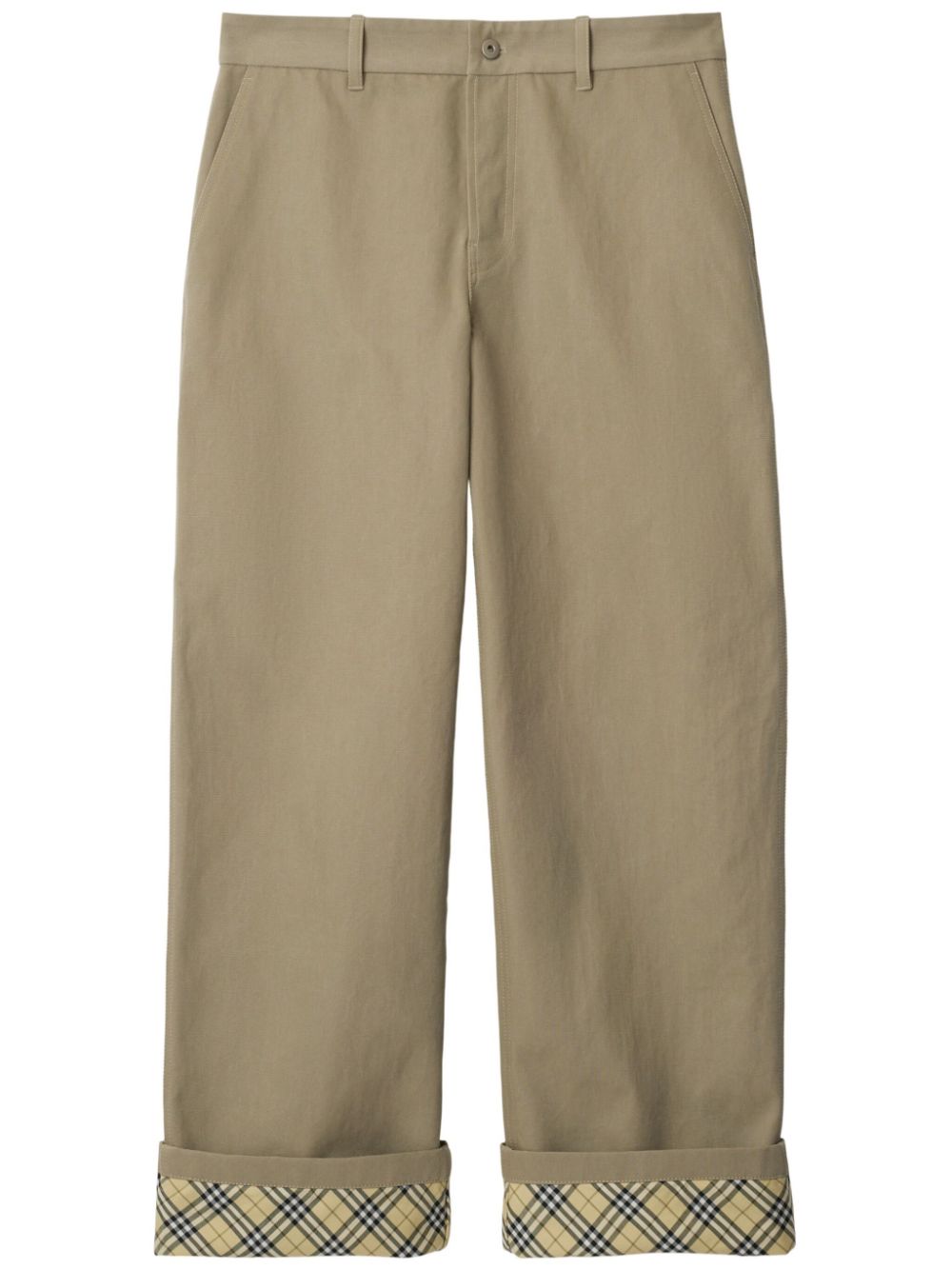 Relaxed-fit trousers by BURBERRY in sand-coloured cotton with side bellows pockets, logo on the back, patch pockets on the back, checked lining, cuffed hem, wide leg and concealed zip and button fastening.