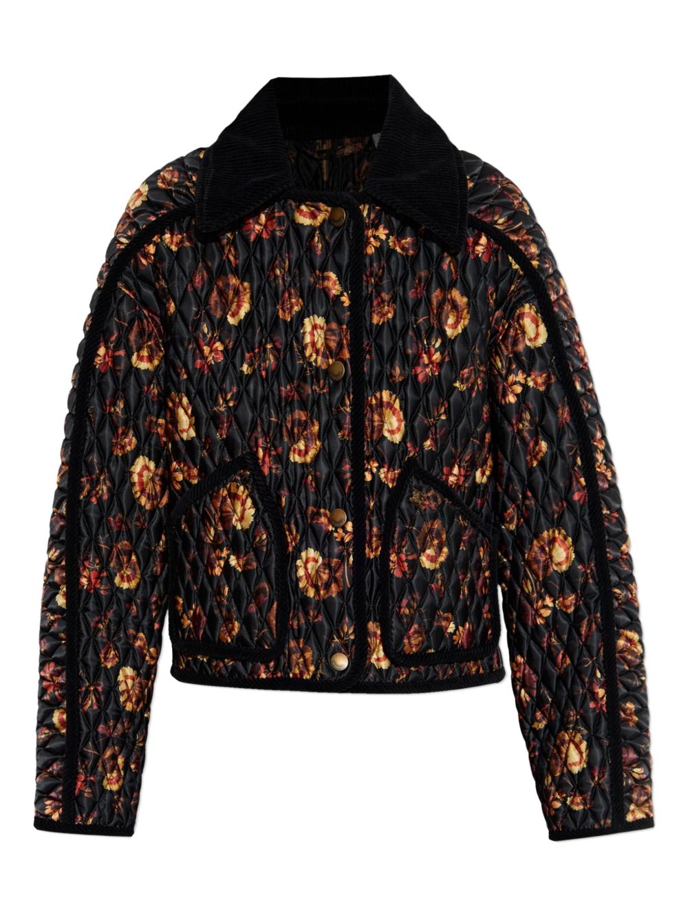 BURBERRY Floriston jacket in multicolor nylon, featuring corduroy trims, geranium print, snap button fastening and metallic equestrian knight motif on the pocket.