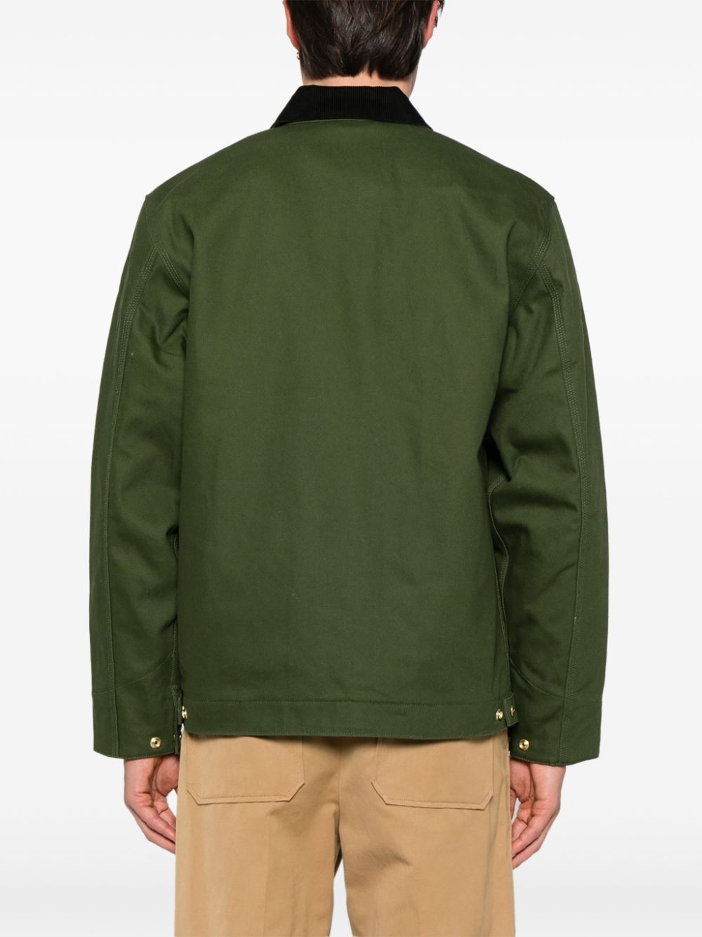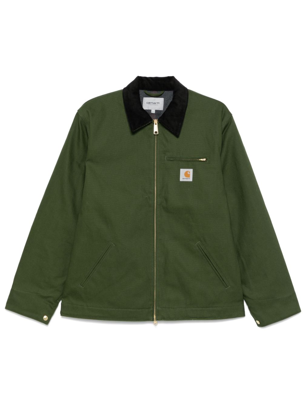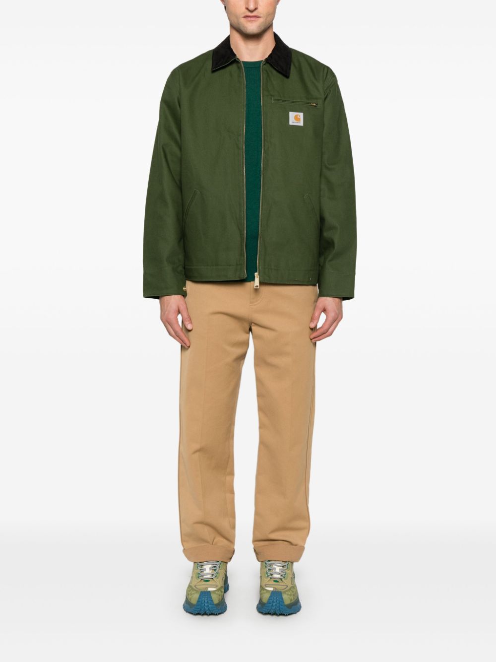 Detroit jacket by CARHARTT WIP in forest green cotton with ribbed collar, zip pocket on the chest, diagonal side pockets, full lining and double-slider zip front fastening.