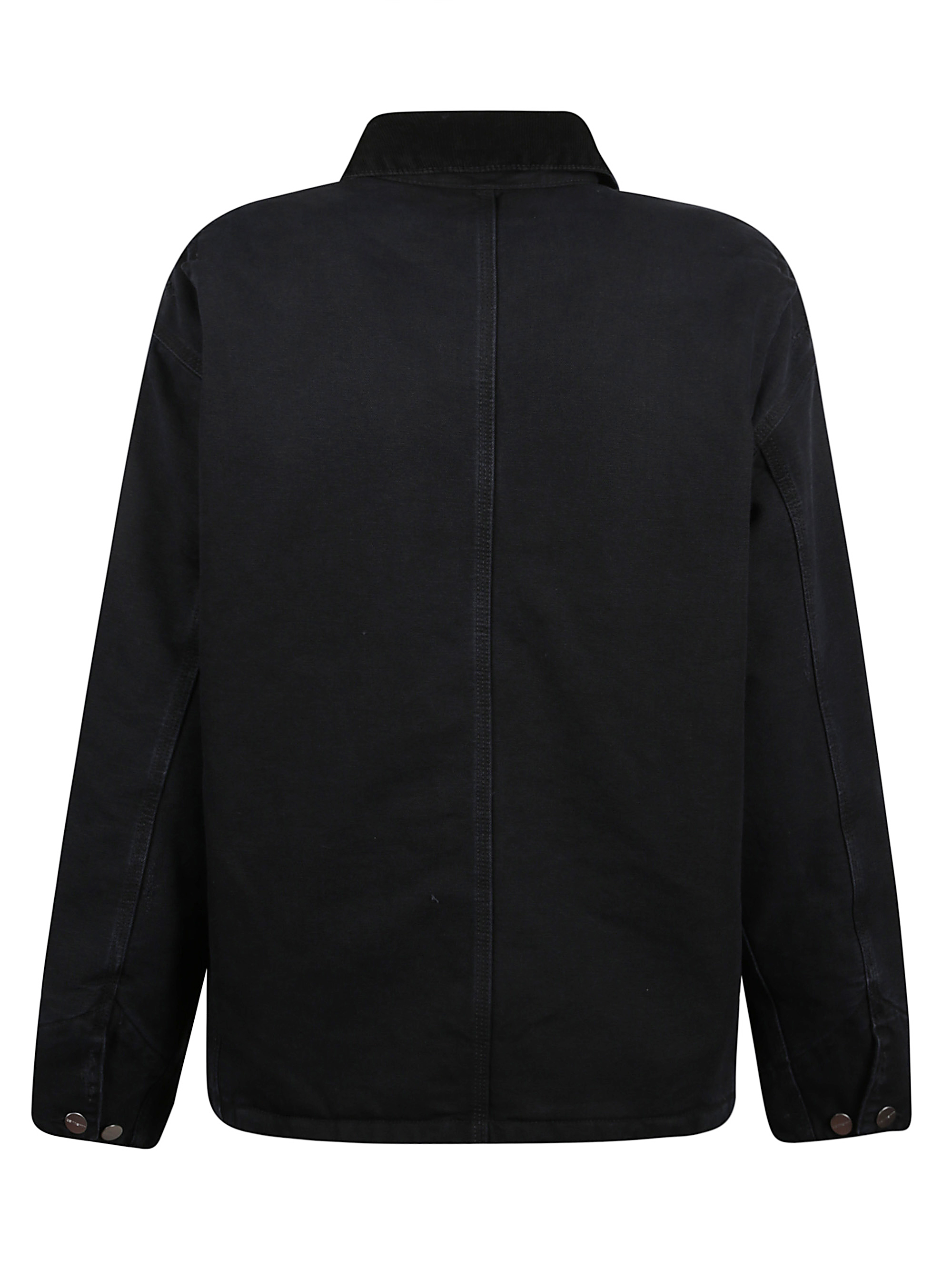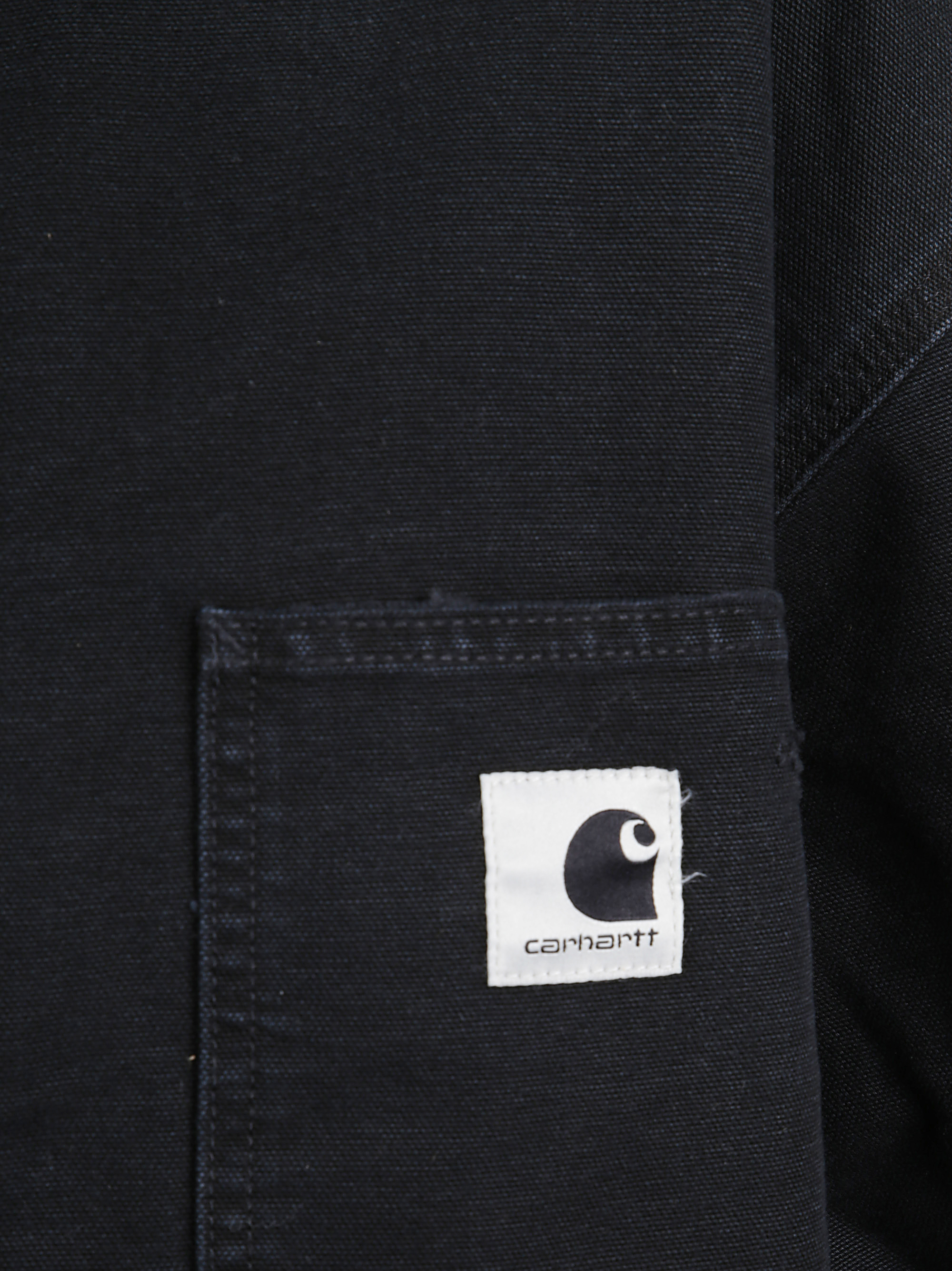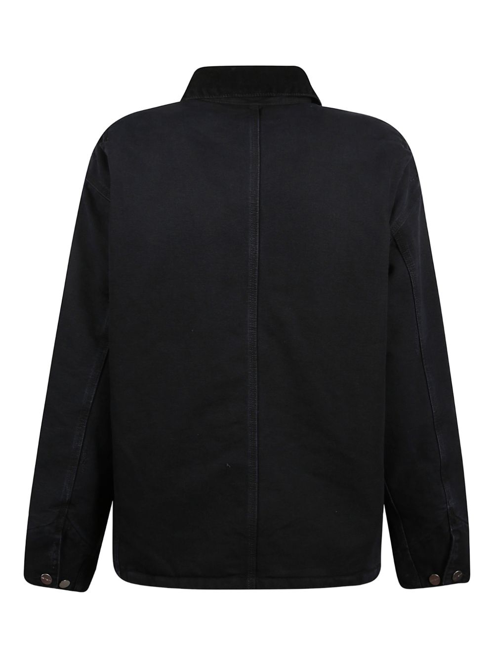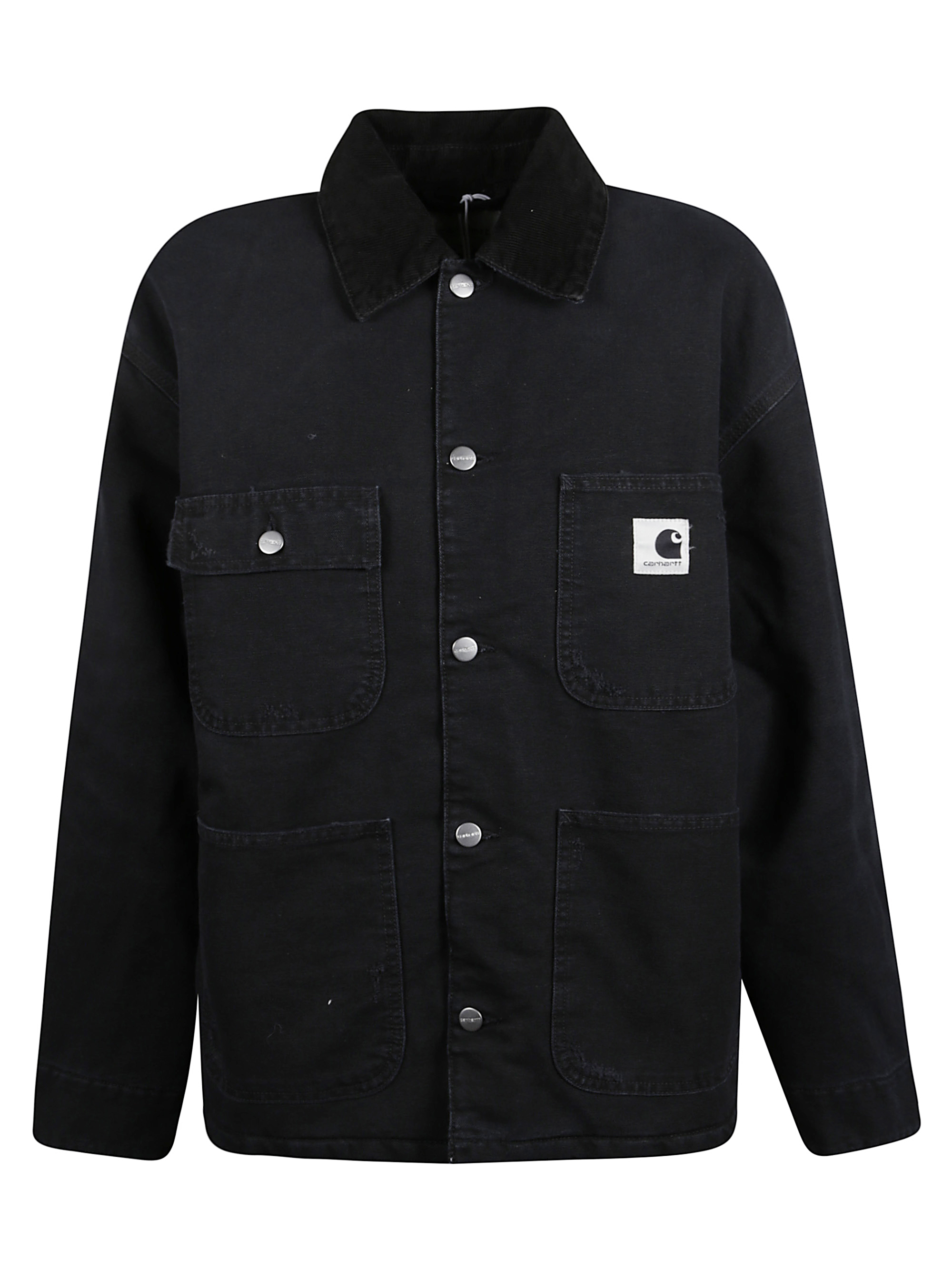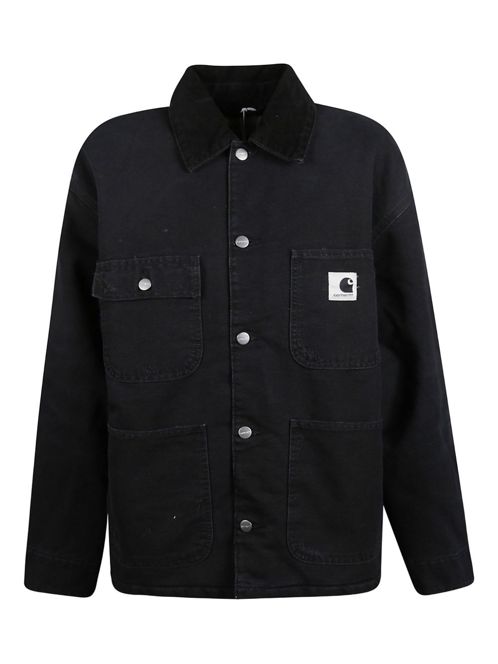 CARHARTT WIP black cotton Michigan jacket with an oversized fit, collar, patch pockets, logo patch, and button closure.