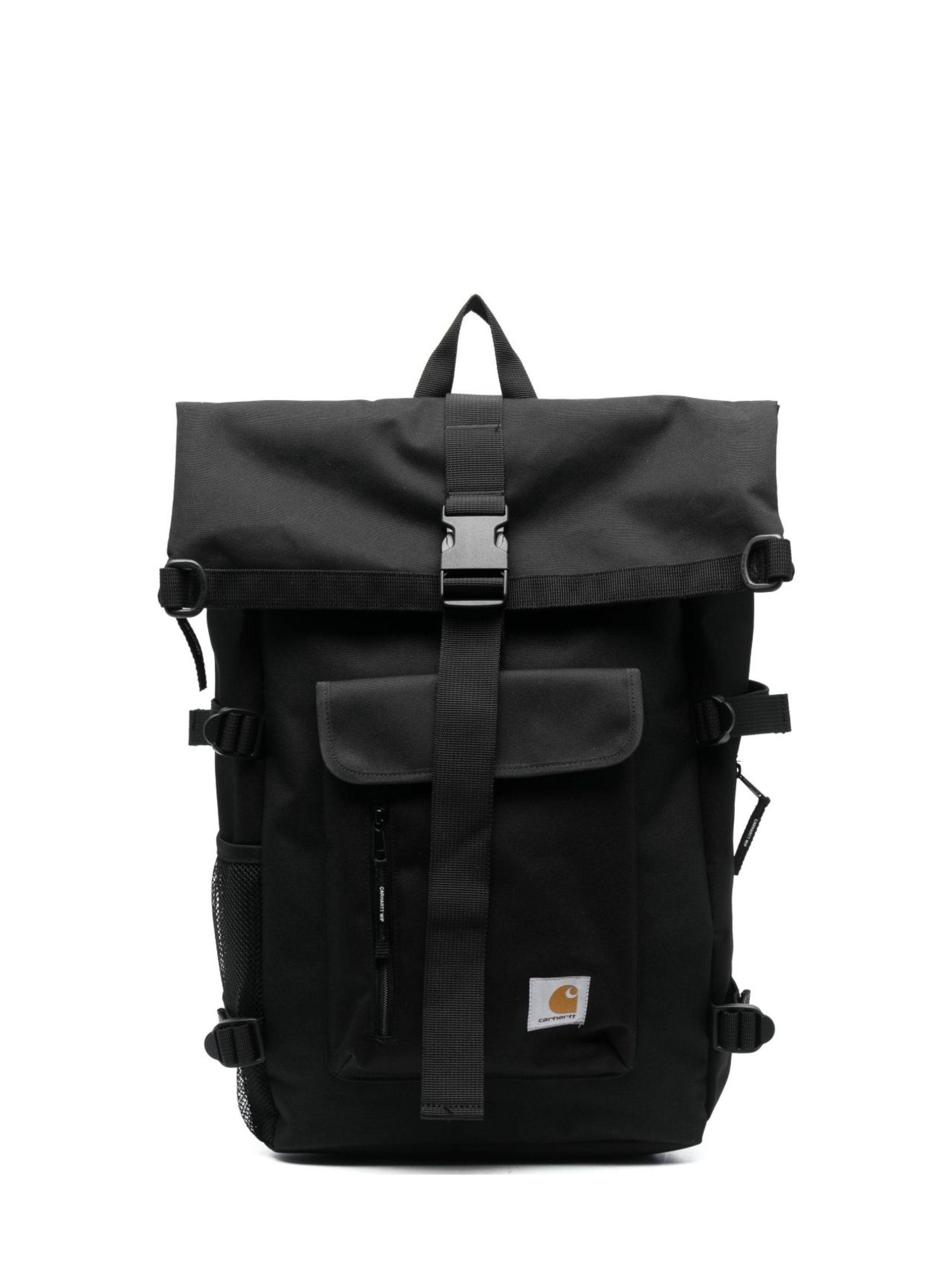 CARHARTT WIP Philis backpack in black waterproof, featuring a main compartment with zip and flap closure, padded internal pocket, side compression straps and adjustable padded shoulder straps.