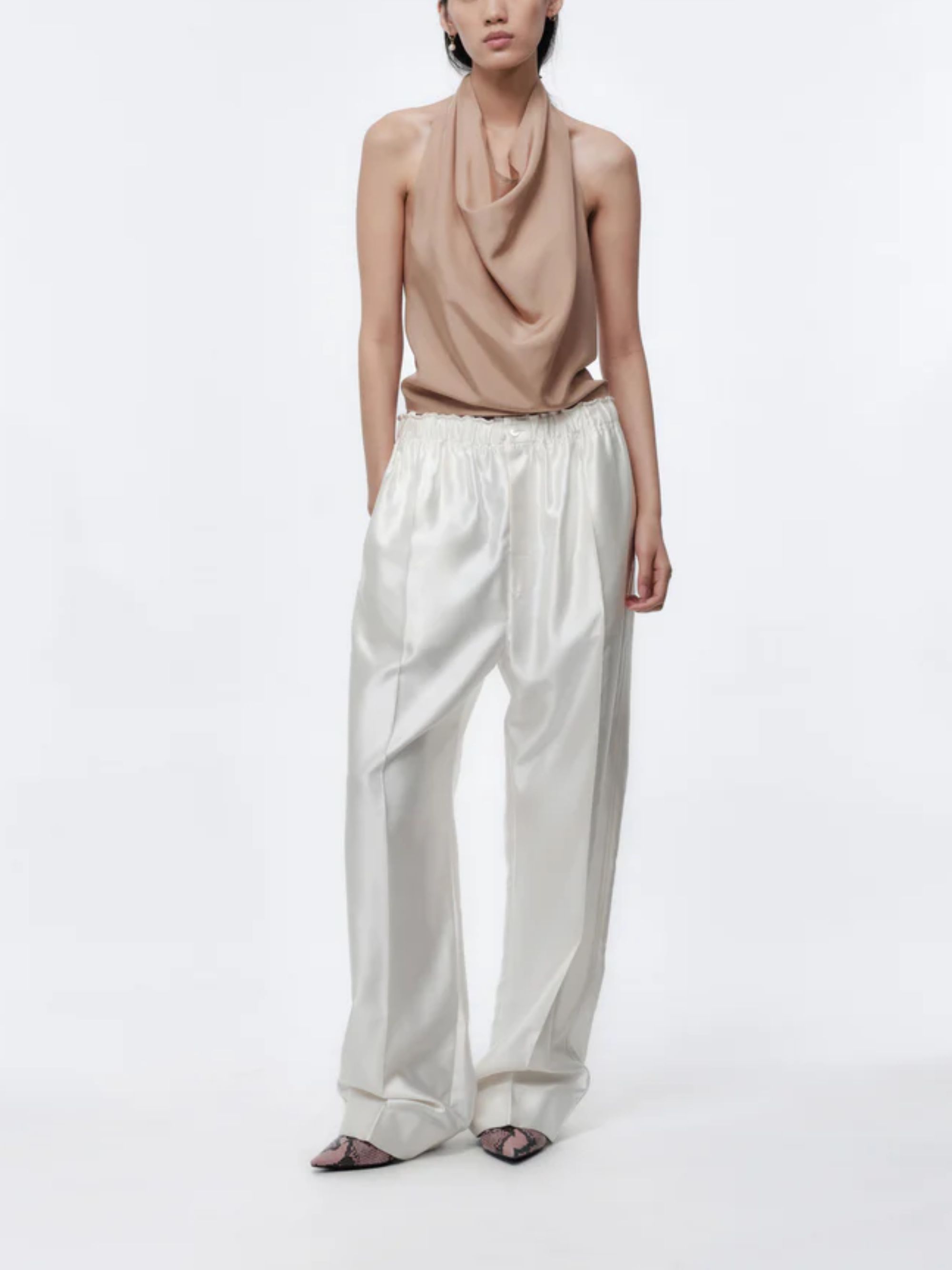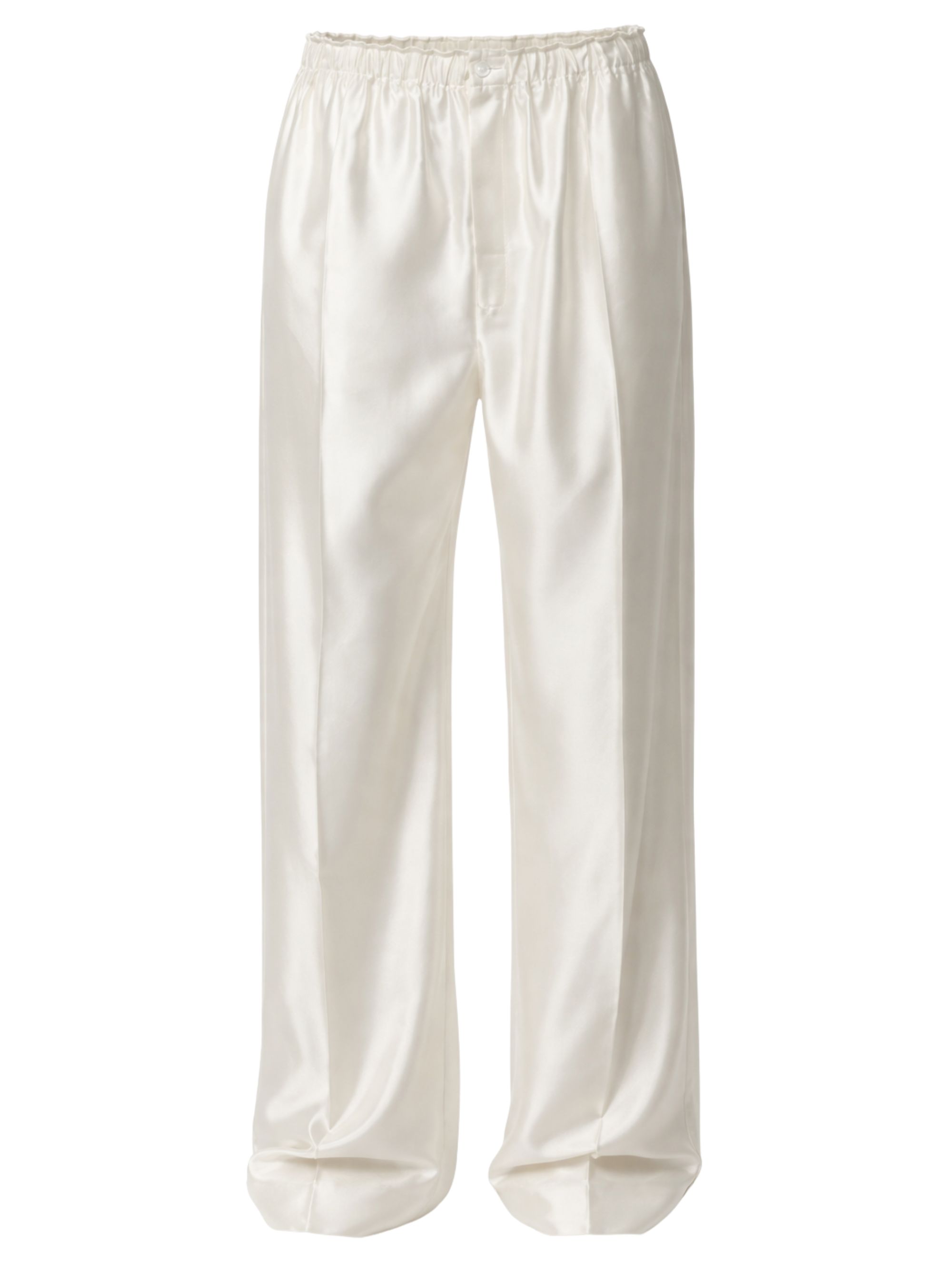 Carven high-waisted white cotton satin pants featuring a relaxed fit and an elastic drawstring waist.
