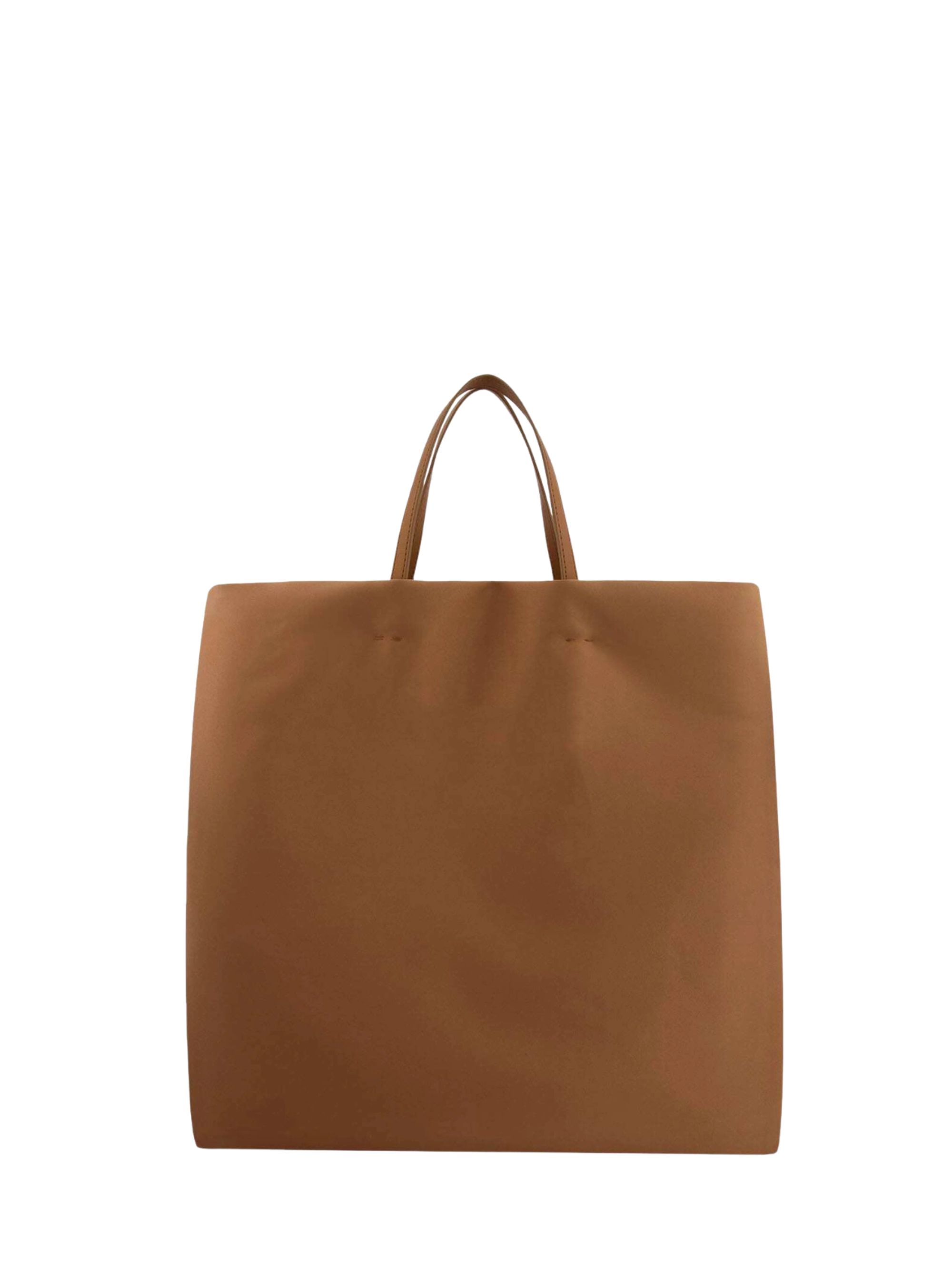 Jeanne bag by CARVEN in camel-colored matte satin with leather handles, lightly padded, lined, an internal pocket, and an embroidered logo. Dimensions: 40x40x8 cm.