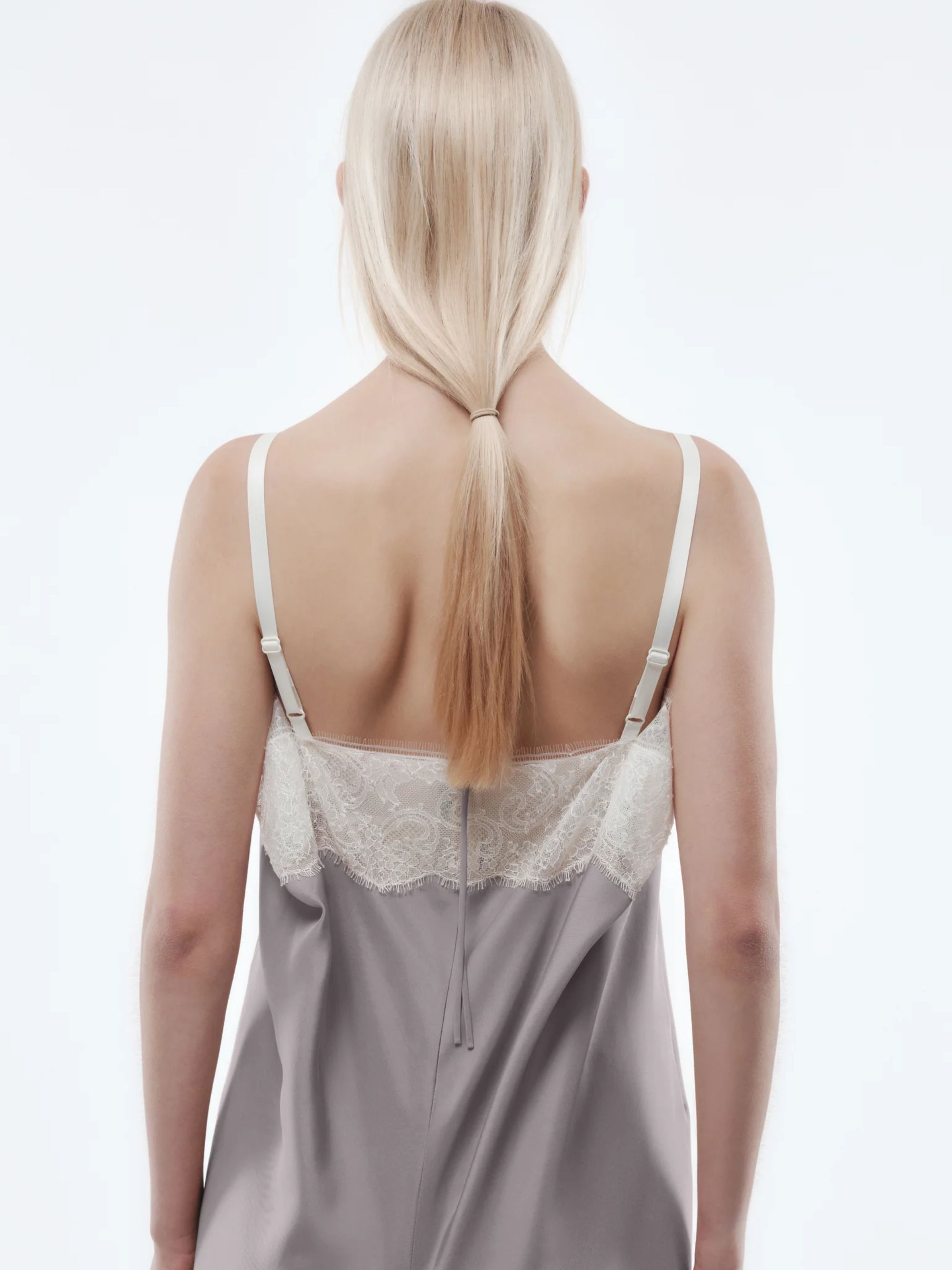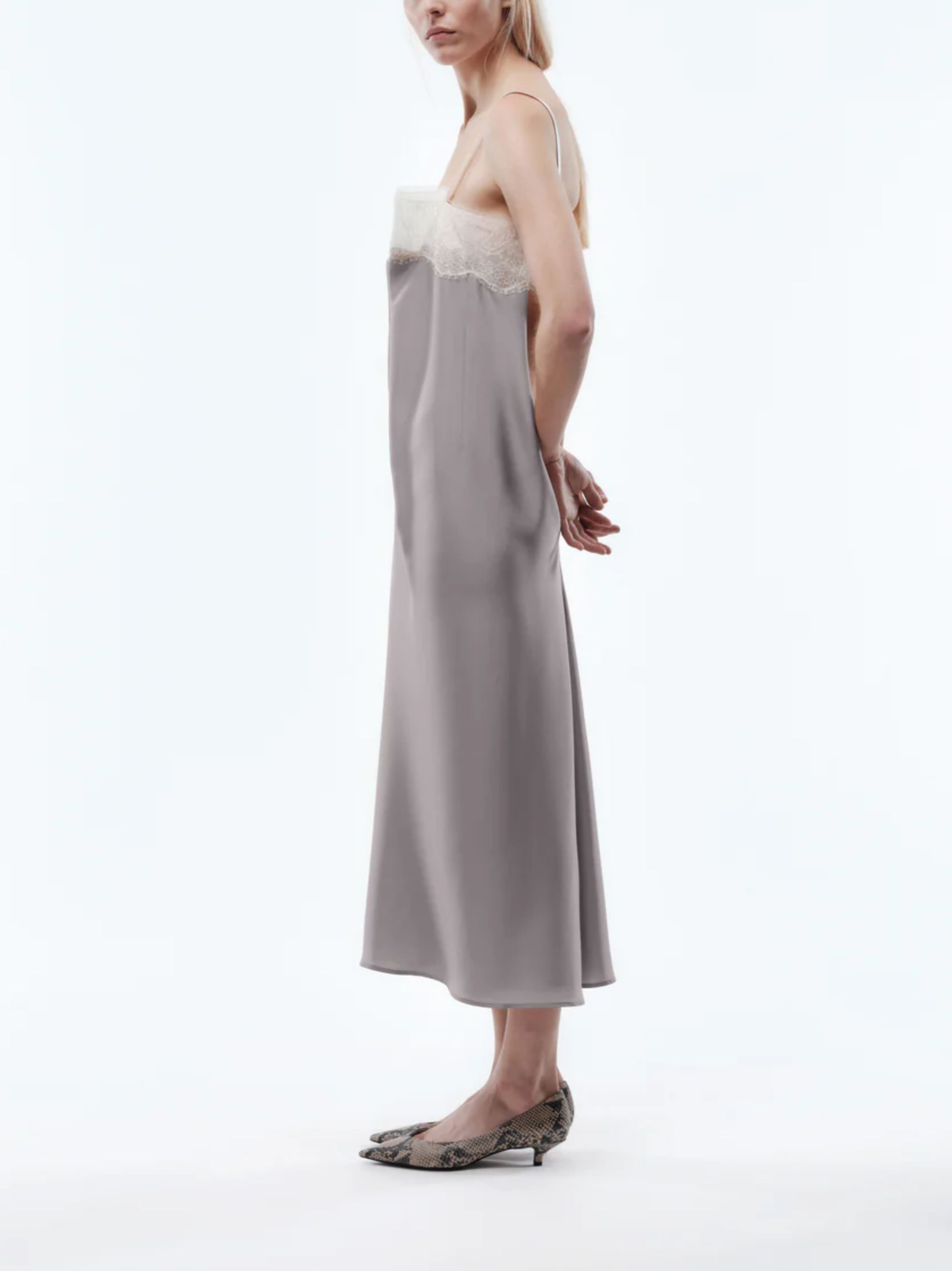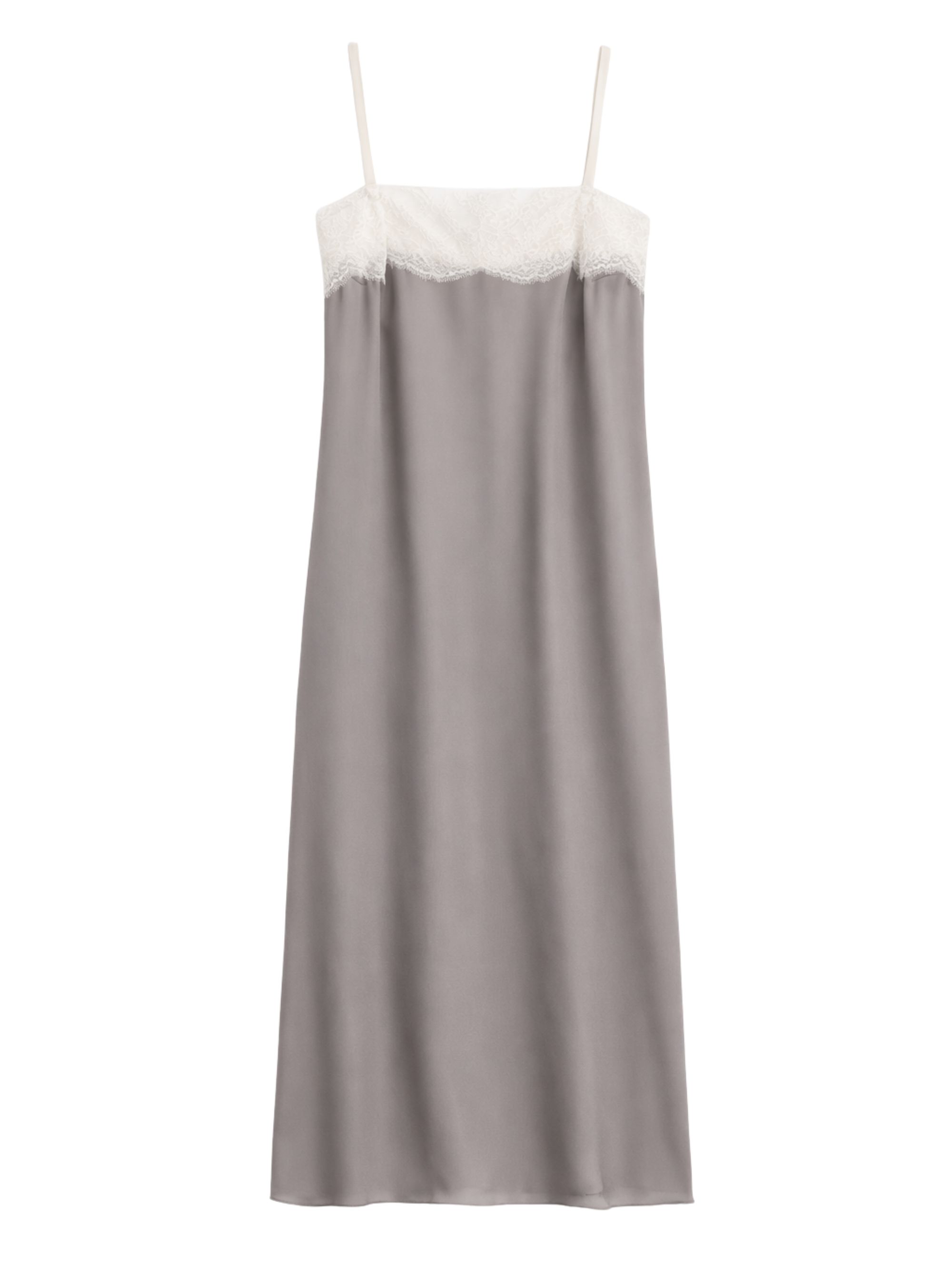 CARVEN grey silk slip dress embellished with Chantily lace, featuring pleats on the chest, an organza bralette and thin shoulder straps.