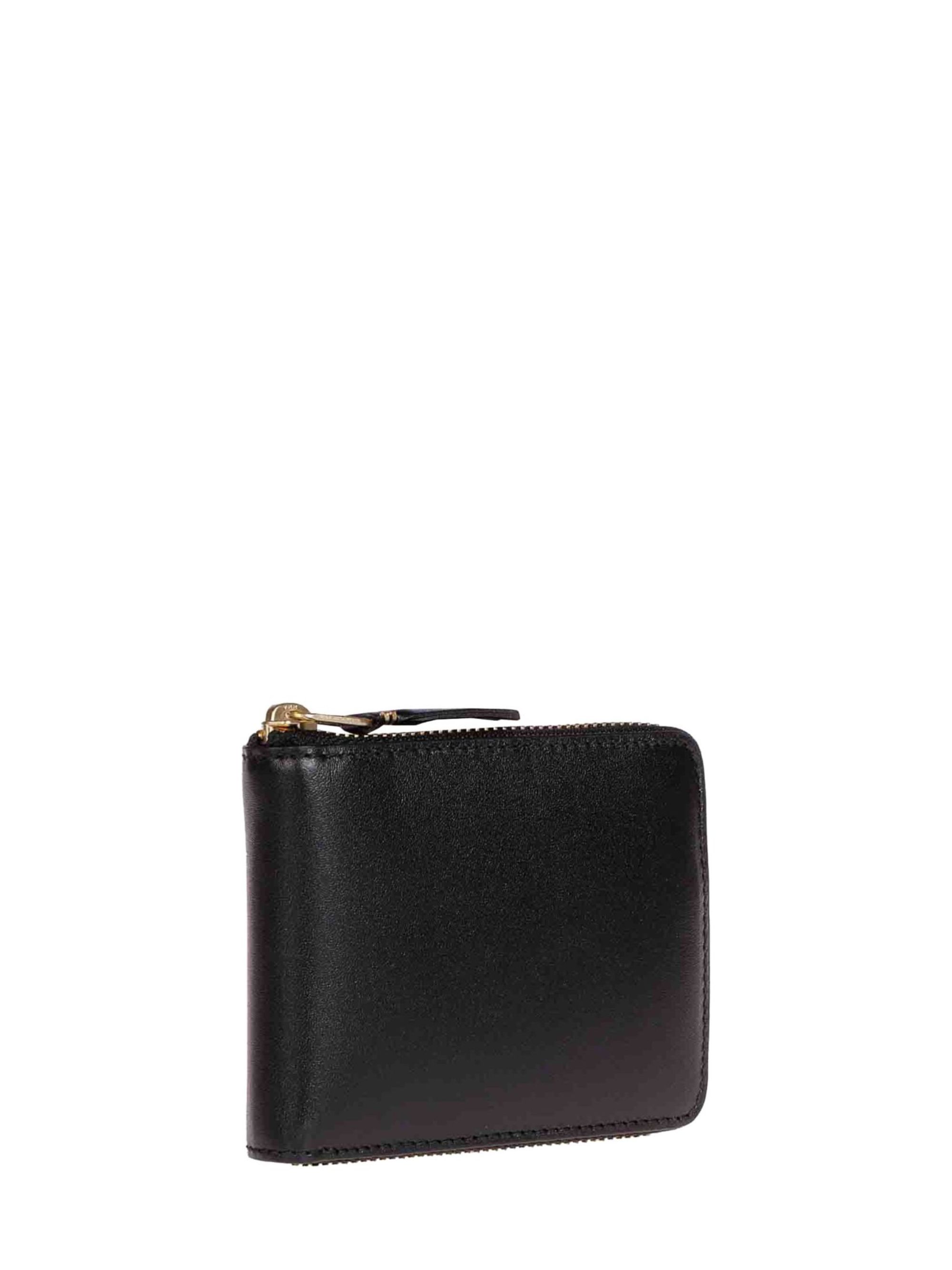 Classic Line wallet by COMME DES GARÇONS WALLET in black leather, featuring a zip closure, a single compartment, card slots and gold-tone hardware.