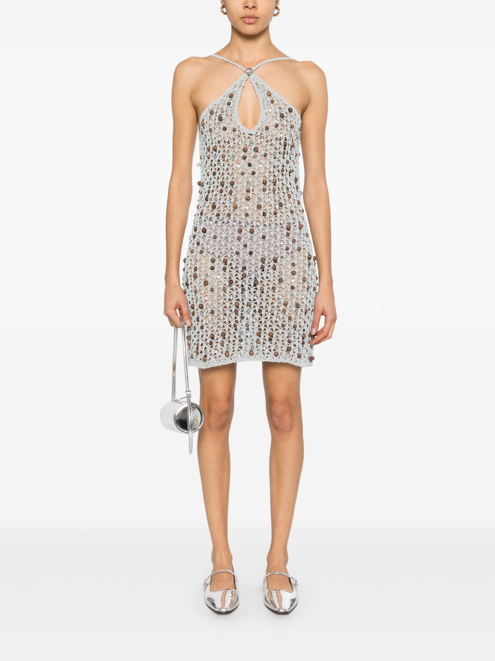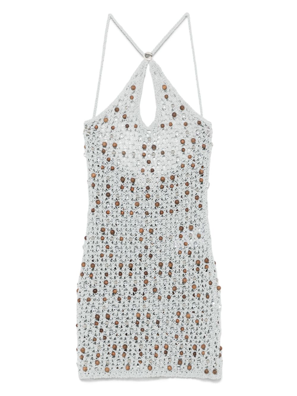 Short dress with grey COPERNI decoration in cotton and wood, American neckline, crossover front and open back.