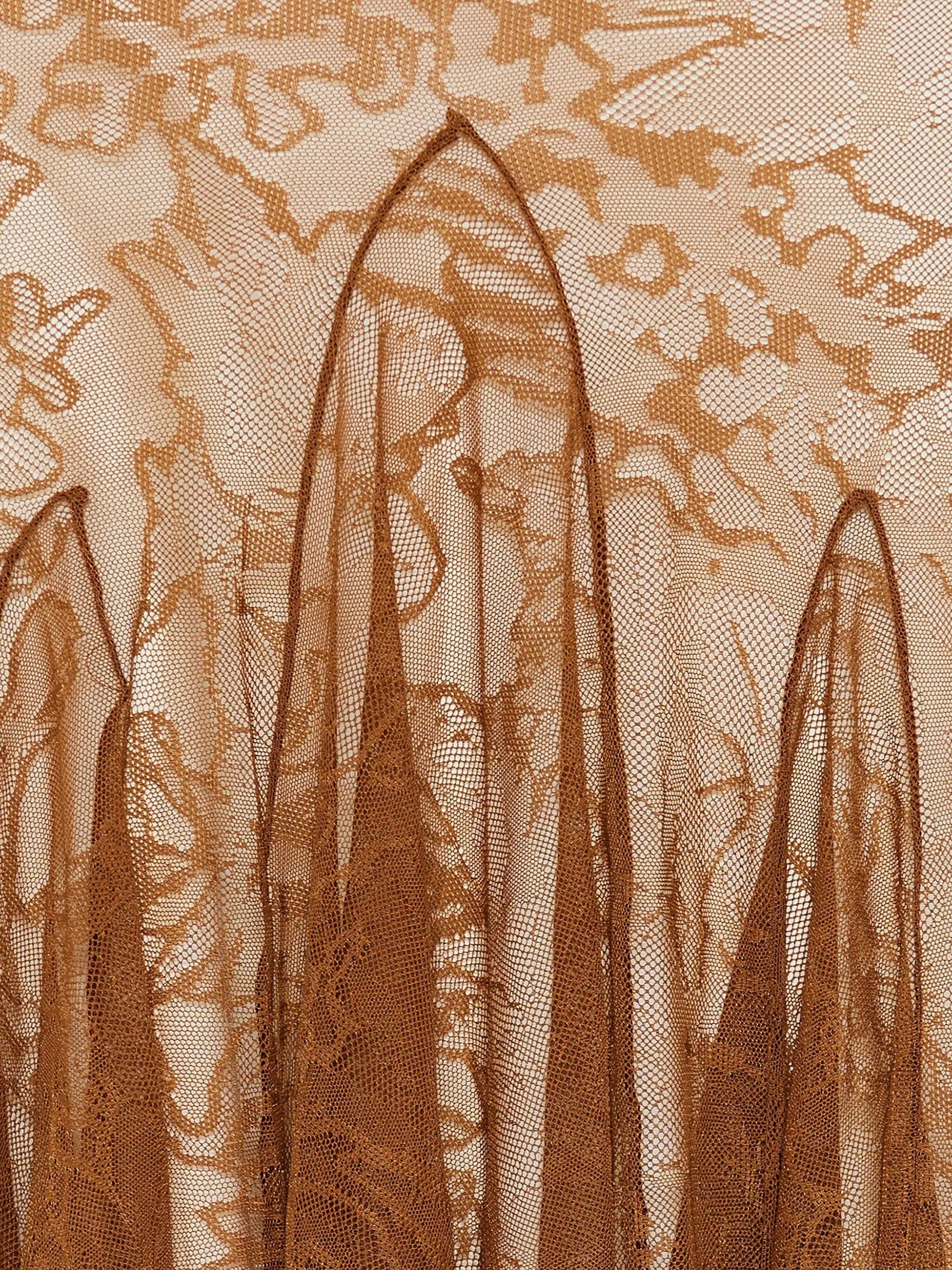 Brown DAVID KOMA maxi skirt in floral lace with fishtail hem and zip fastening.