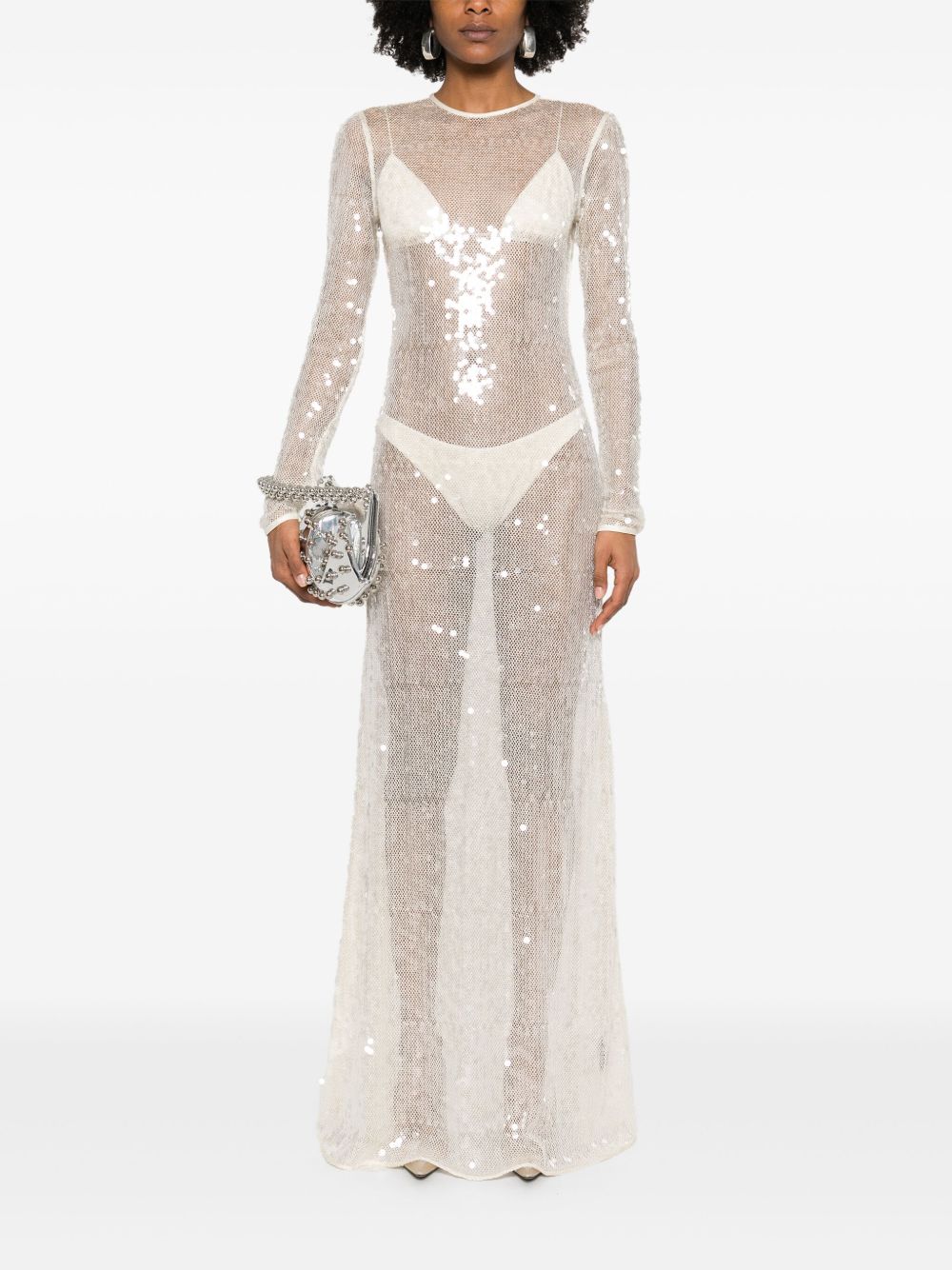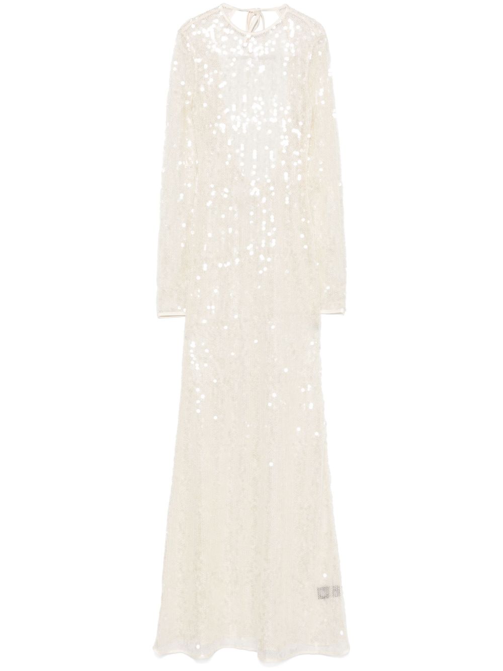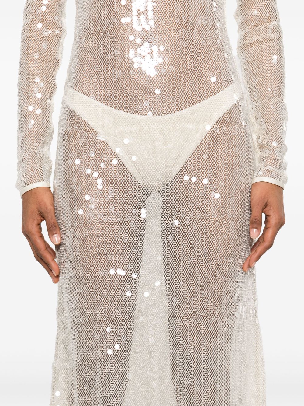 Sequin dress by DAVID KOMA in light beige with mesh design, open back, back knot fastening and concealed side zip fastening.
