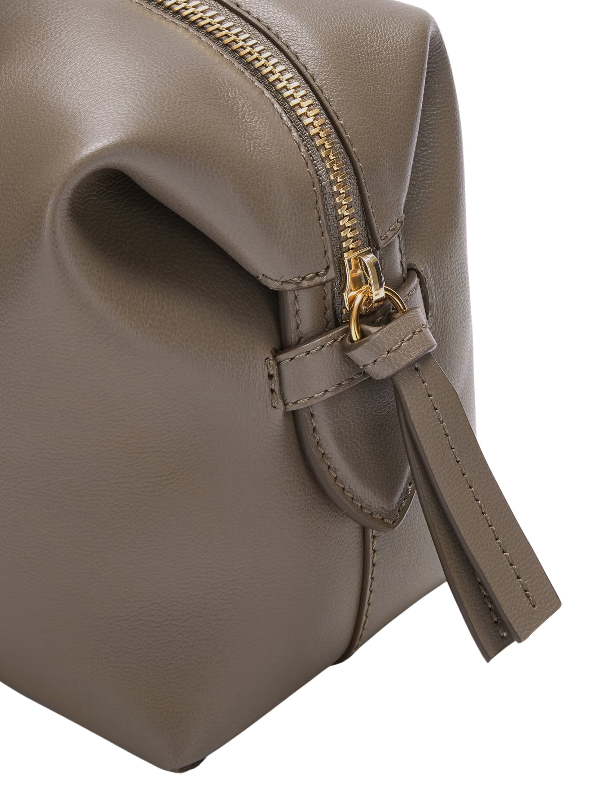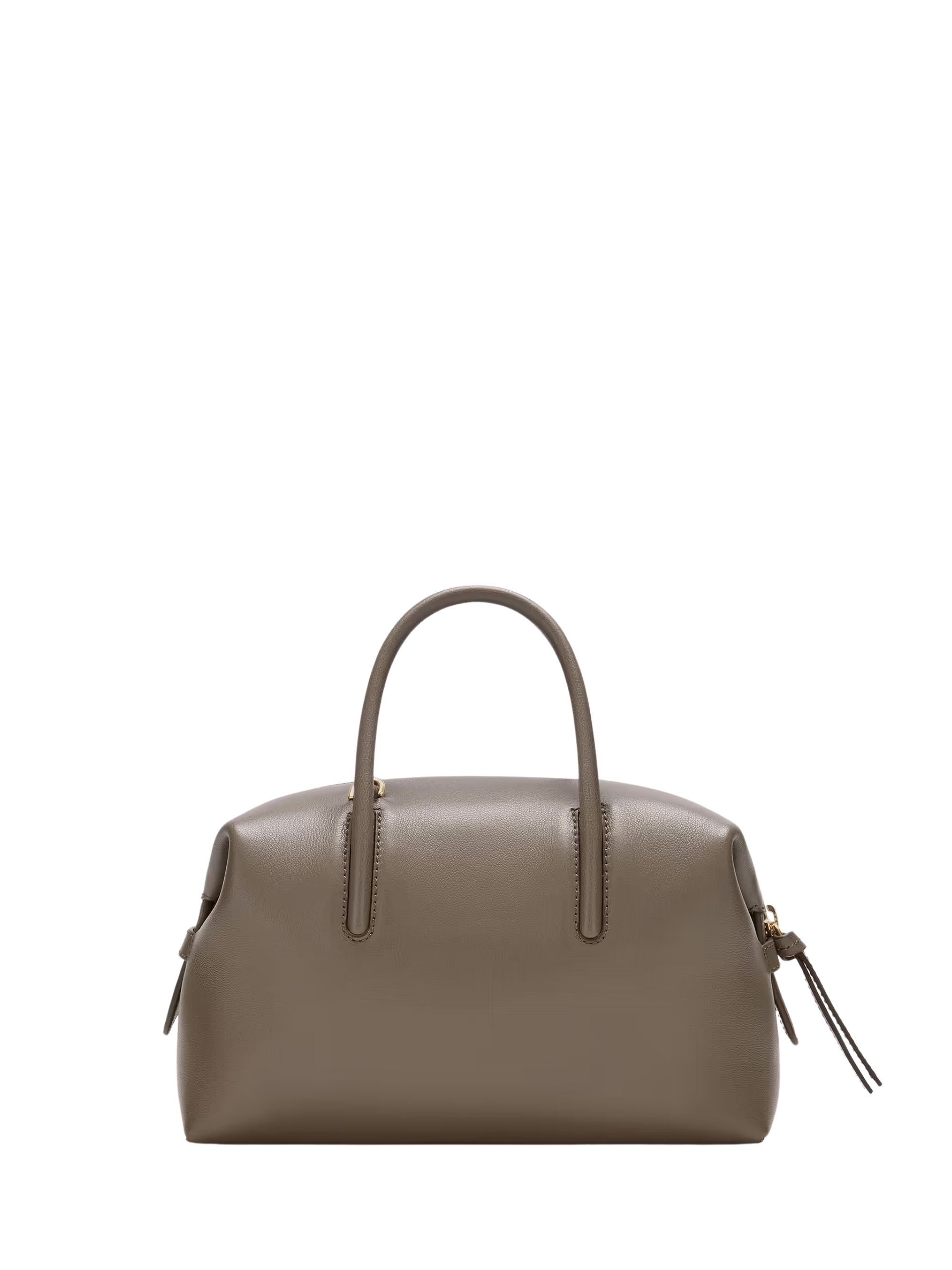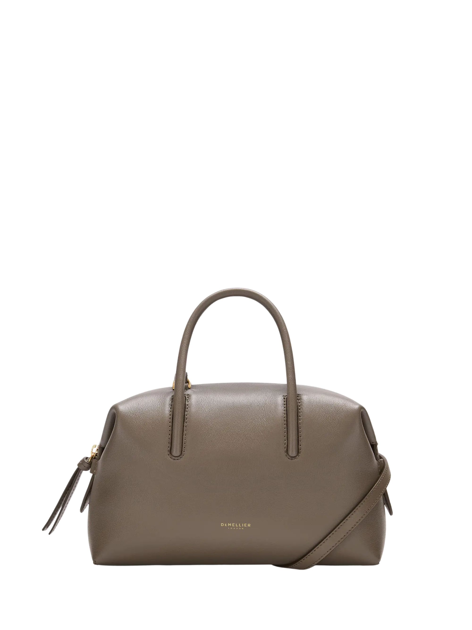 The Small Stockholm bag by DEMELLIER in grey leather, featuring zip closure, removable shoulder strap, logo on the front, two tubular handles and large main compartment.
