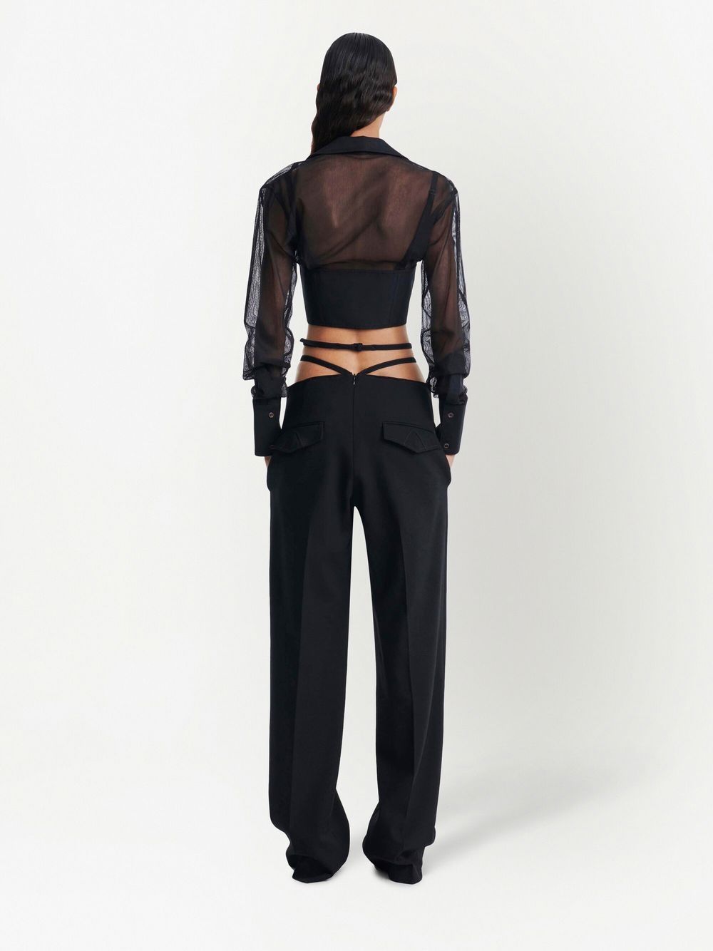 Black corset shirt by DION LEE with a corset style, semi sheer inserts, oversized collar, long sleeves and front eyelet fastening.