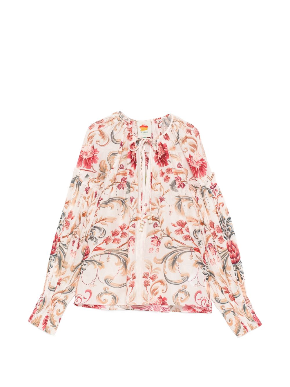 FARM RIO multicolor floral print shirt in cotton, featuring a round neck, long sleeves, pleated cuffs and button and lace fastening.