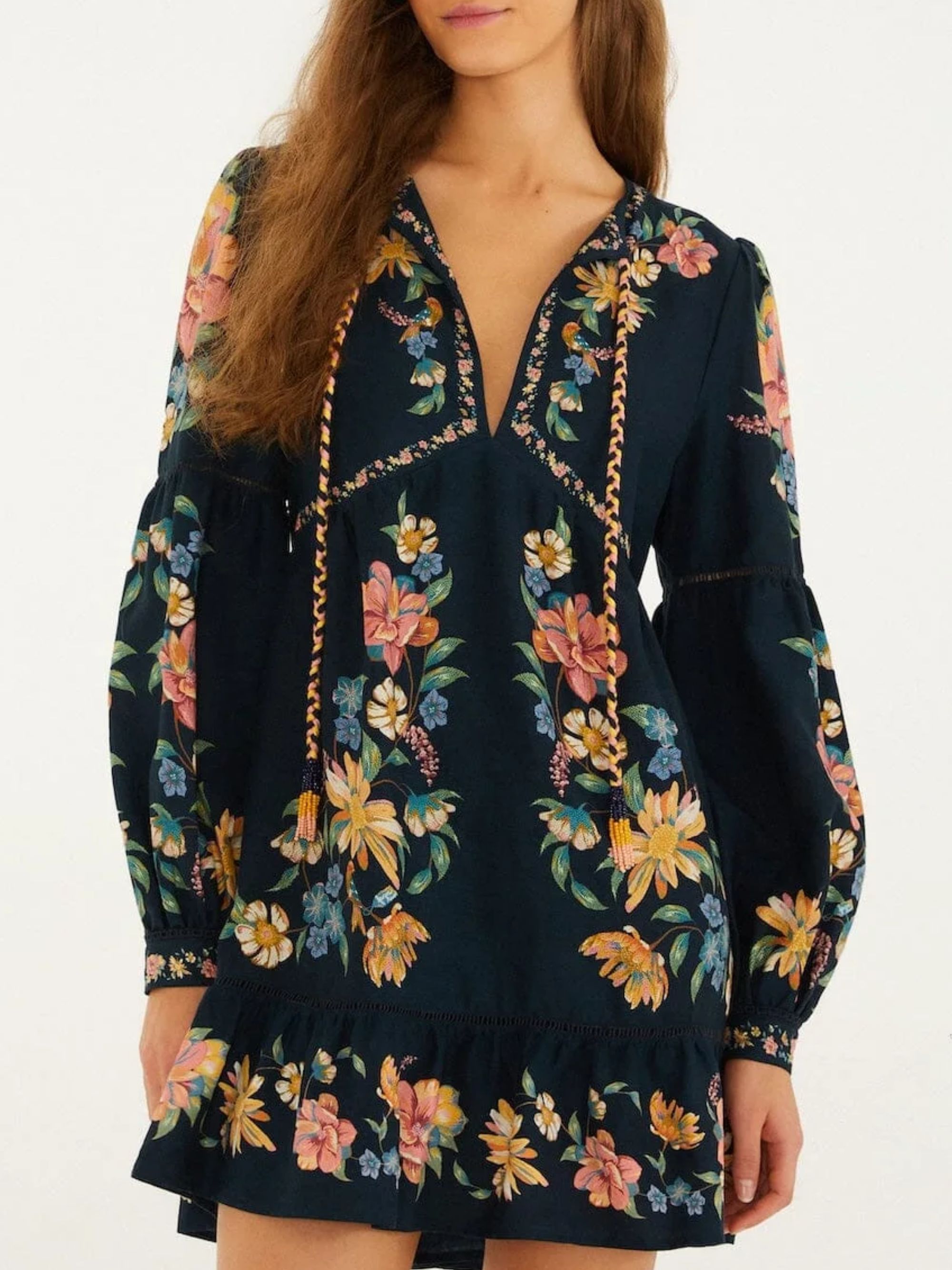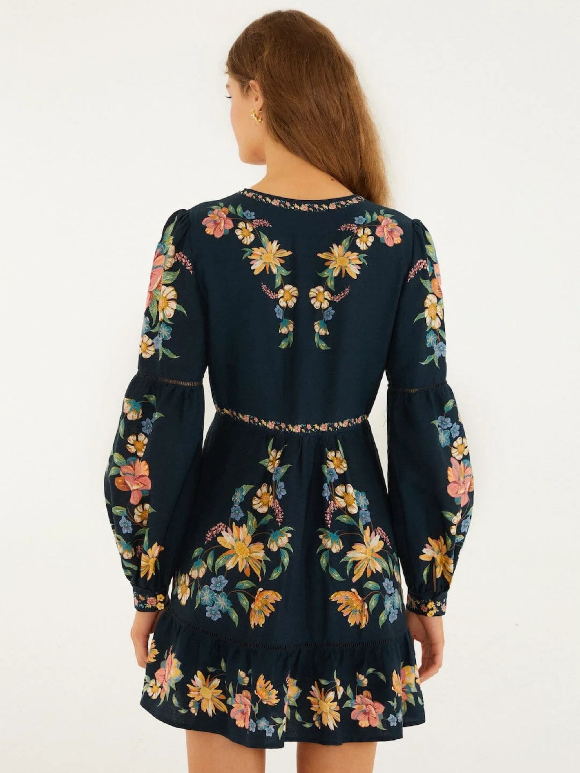 Maira Floral mini dress by FARM RIO in blue linen and viscose, featuring long sleeves, a floral motif and a lace-up neck fastening.