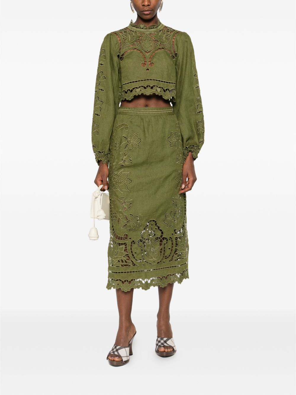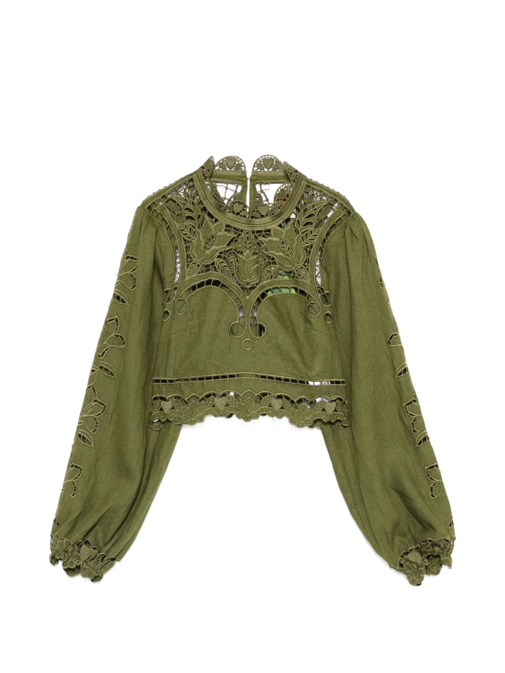 Majestic Garden Richelieu shirt by FARM RIO in green linen, featuring Richelieu embroidery, lace trim, long sleeves and a button fastening on the back.