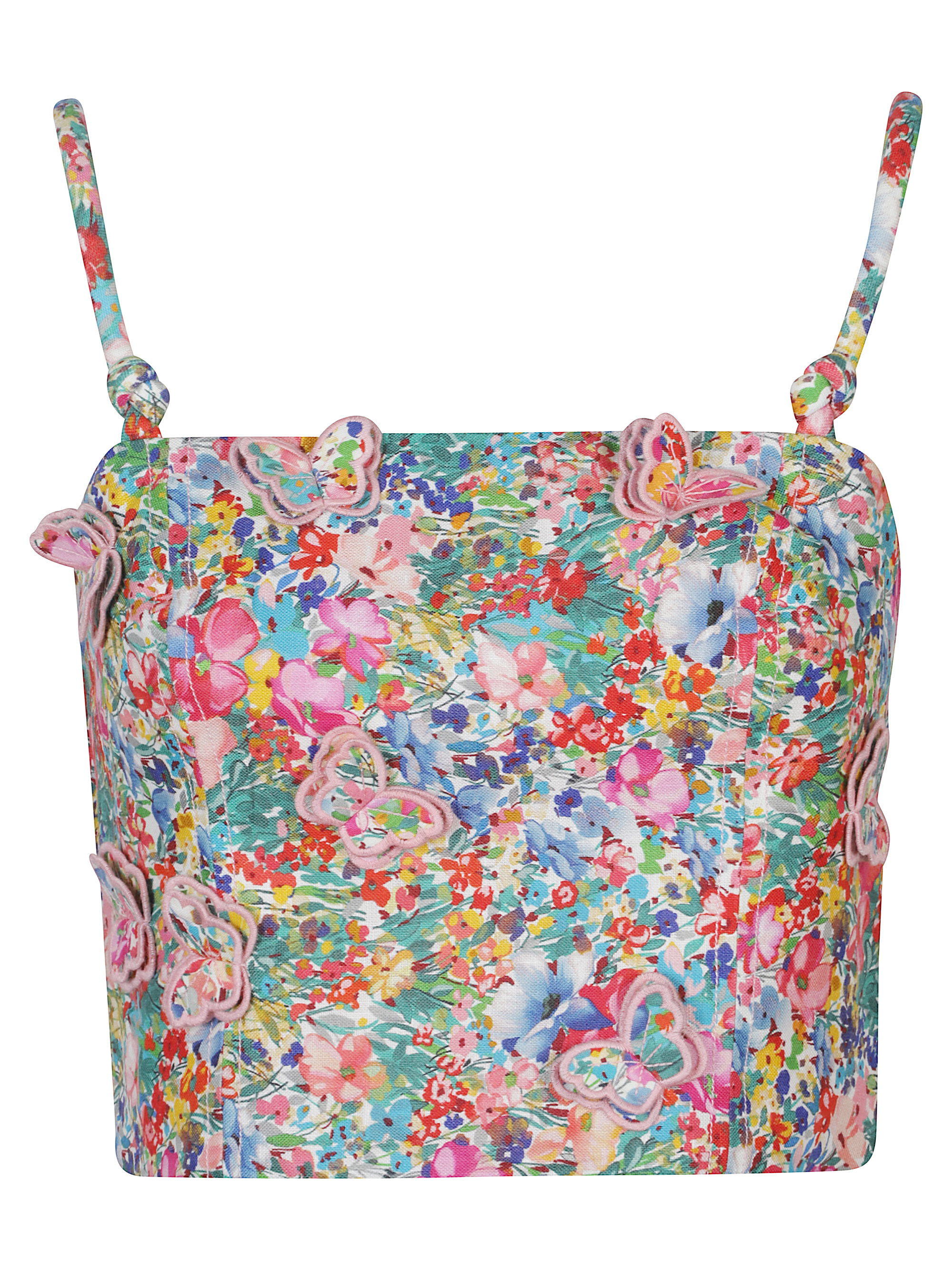 Peasant Floral Top by FARM RIO in multicolor linen, featuring a floral motif, removable shoulder straps, butterfly appliques and a hidden back zip fastening.