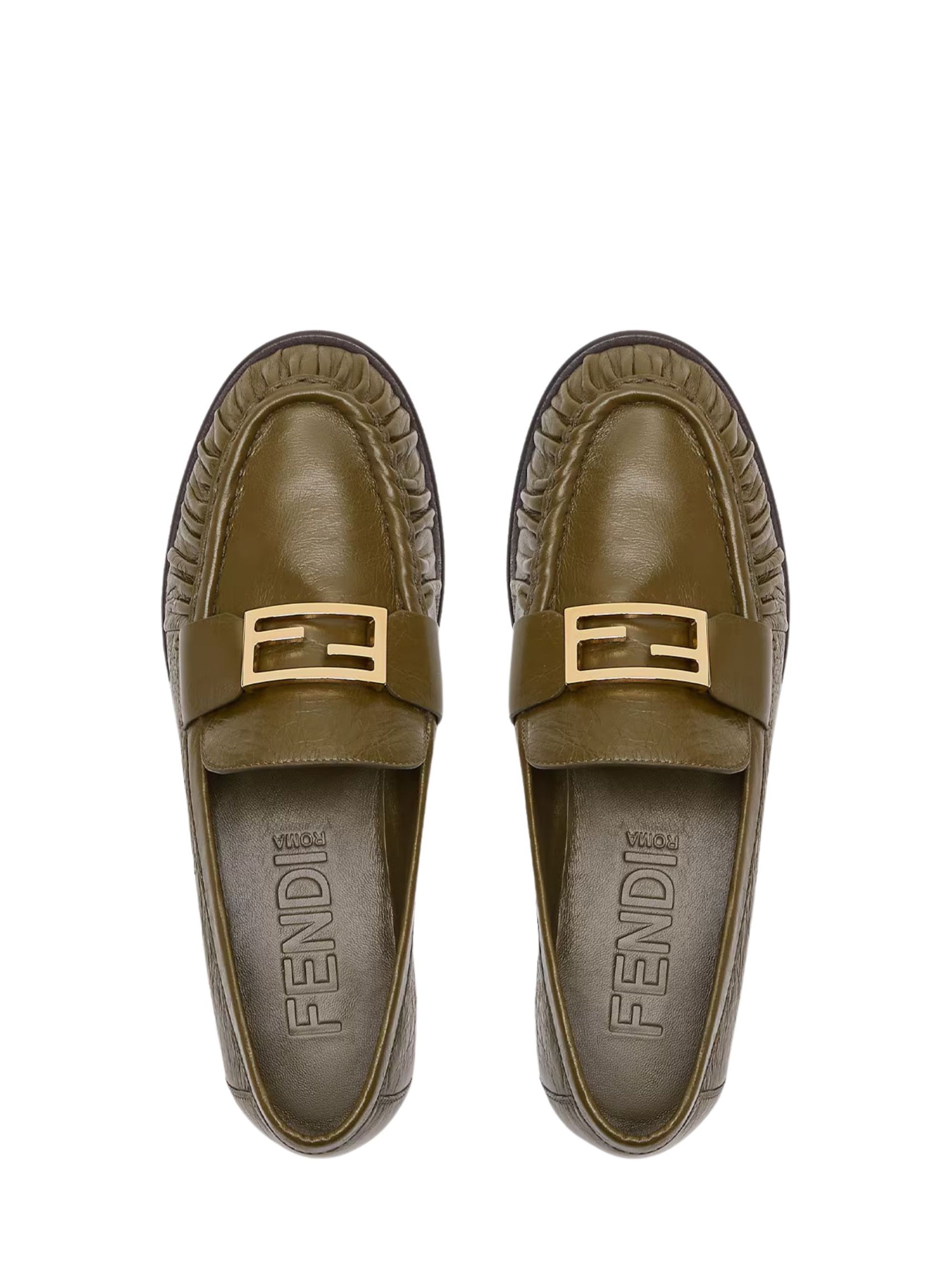 FENDI Baguette loafer in green leather, featuring a rounded toe, FF Baguette accessory on the vamp, curled vamp, leather sole with non-slip rubber insole and flexible bag construction.