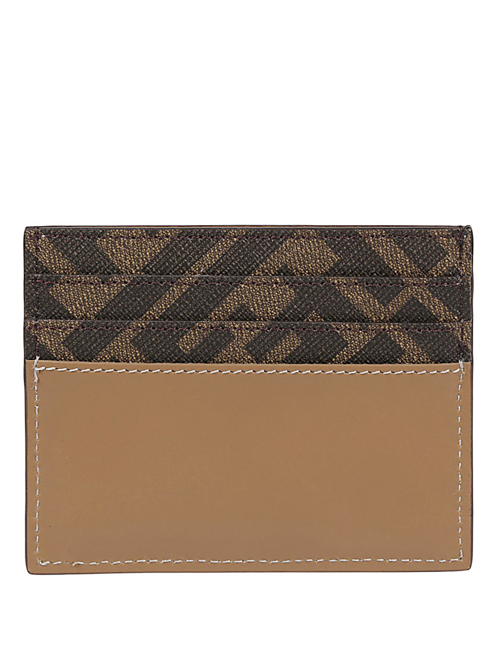 Card holder with brown FENDI logo, characterized by logo on the front, 4 card slots, monogram texture.