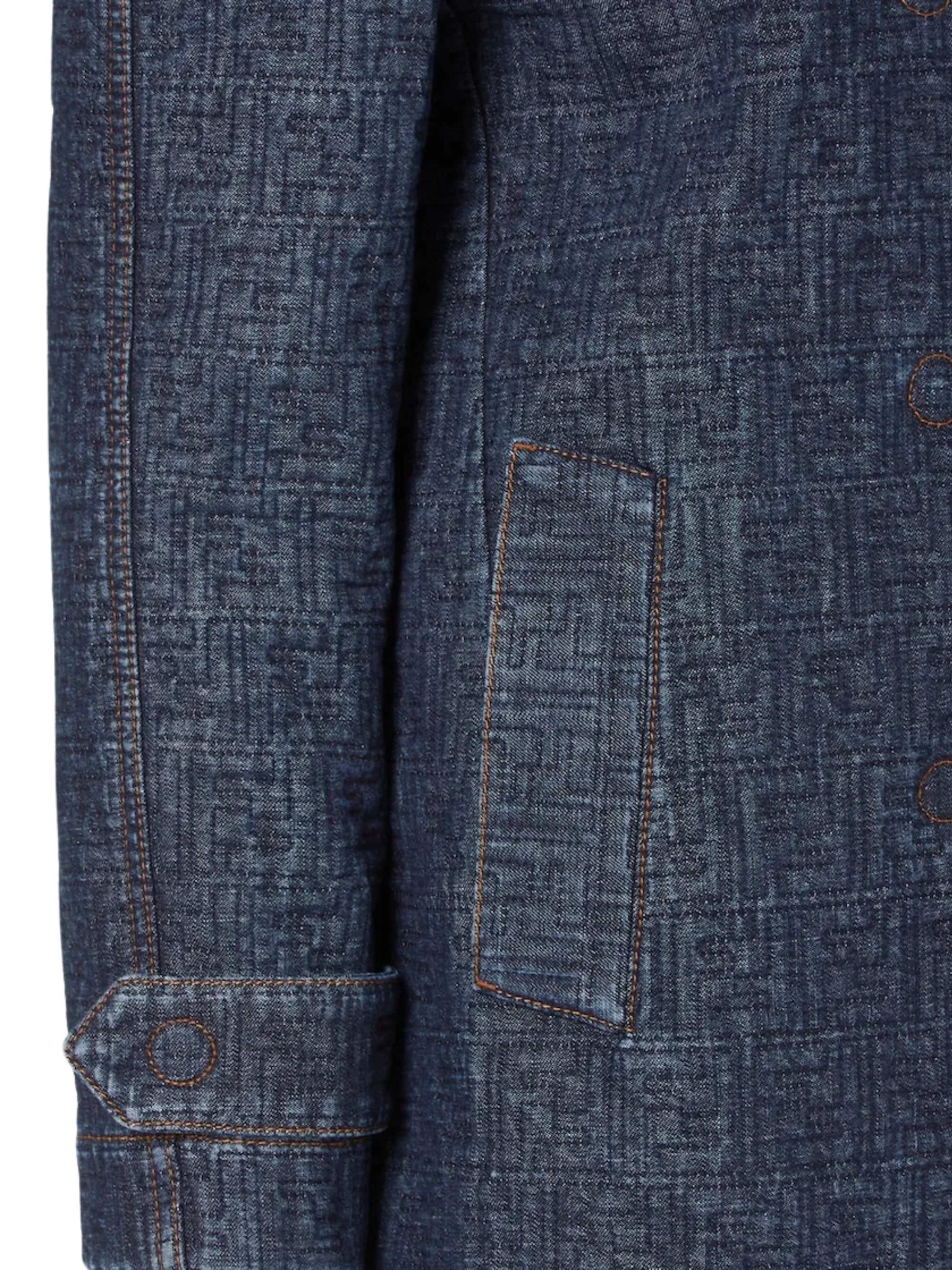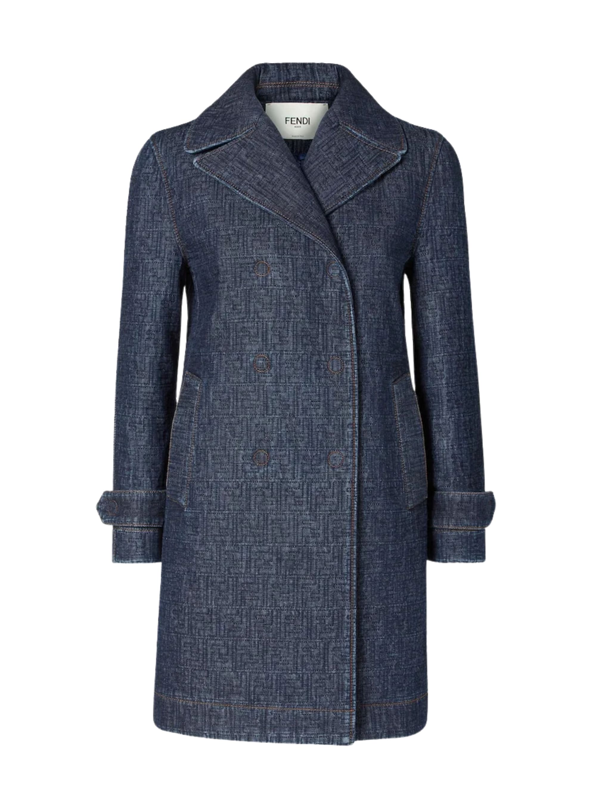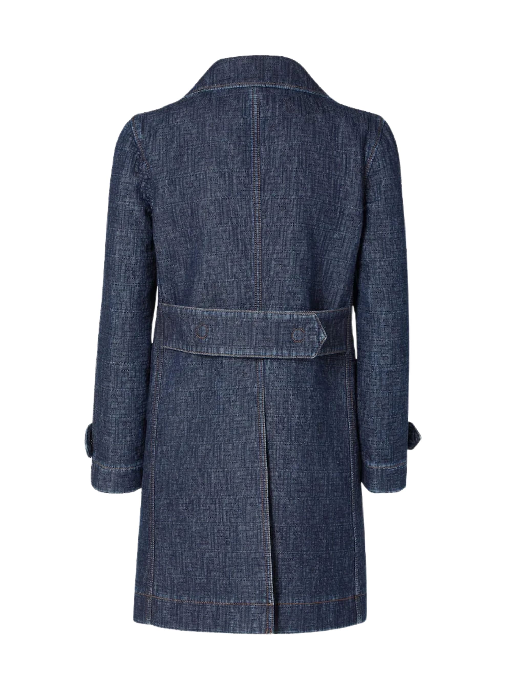 FENDI double-breasted midi jacket in blue cotton denim, featuring a lapel collar, sleeves with toggles on the cuffs, welt pockets, front button fastening, all-over quilted FF motif and contrasting topstitching.