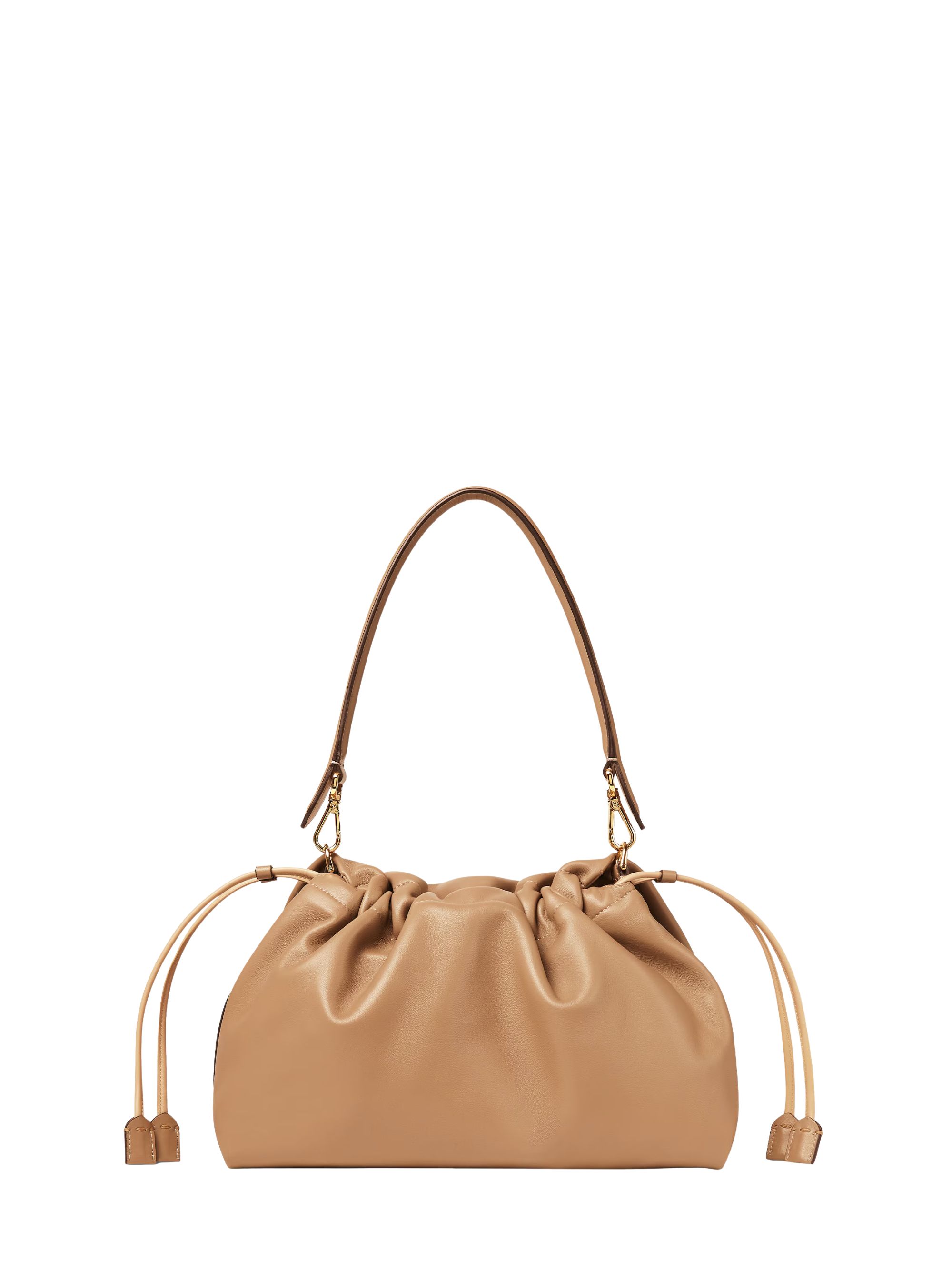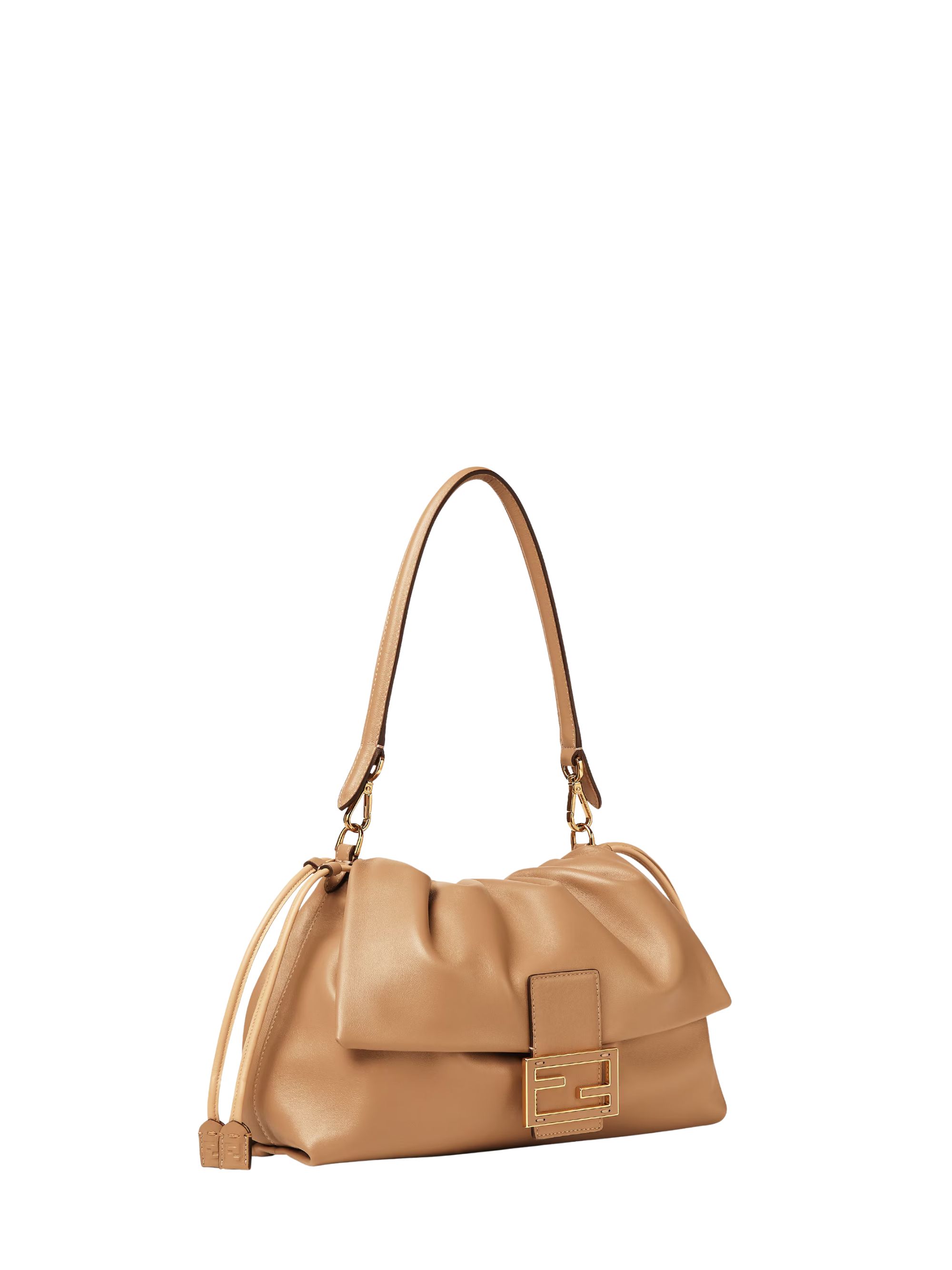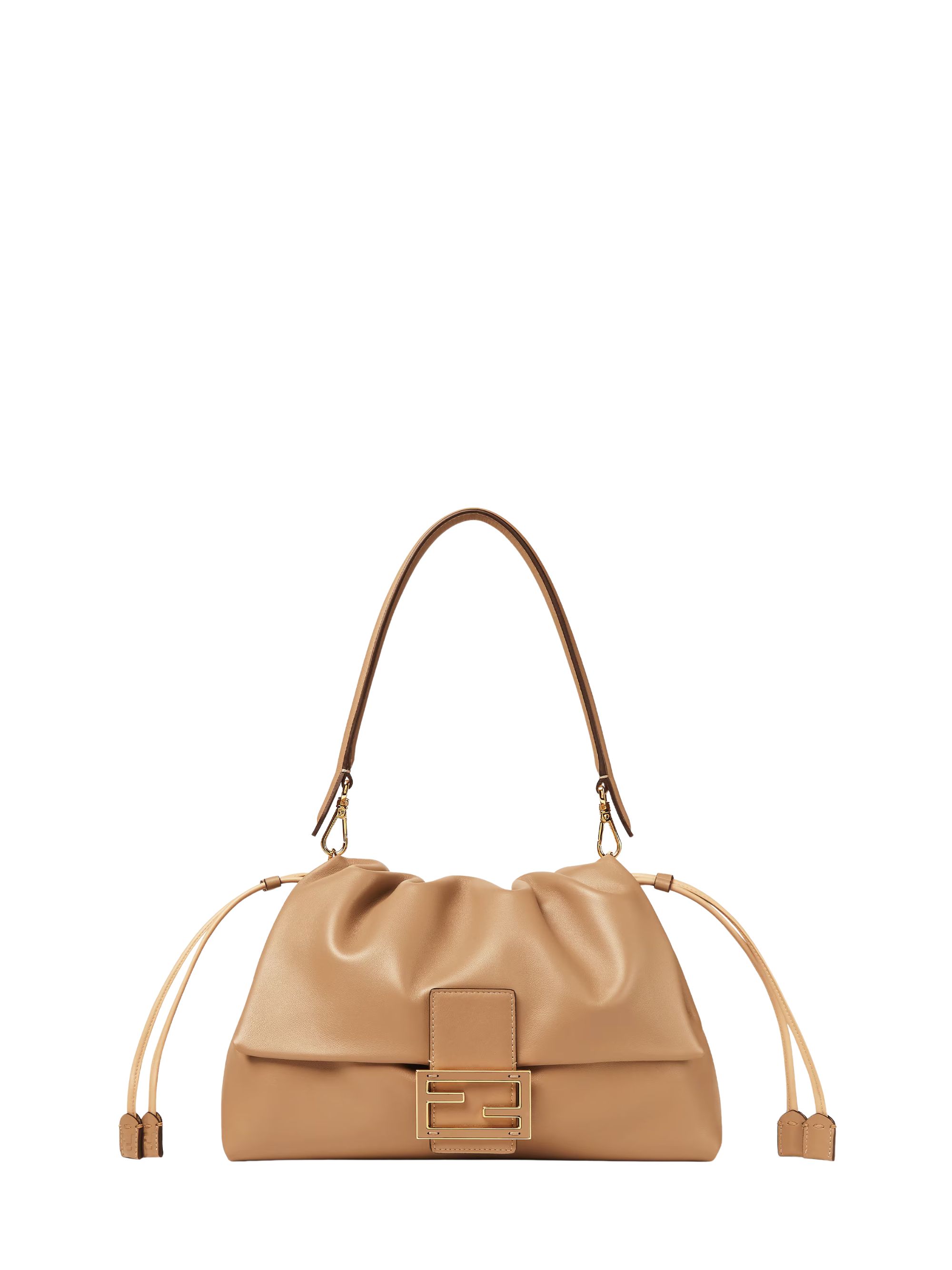 FENDI large Mamma Baguette bag in brown nappa leather, featuring an FF drawstring closure, leather straps, a front flap with a magnetic button, gold-tone hardware, and a removable handle and shoulder strap. Dimensions: 31.5 x 22 x 12 cm.