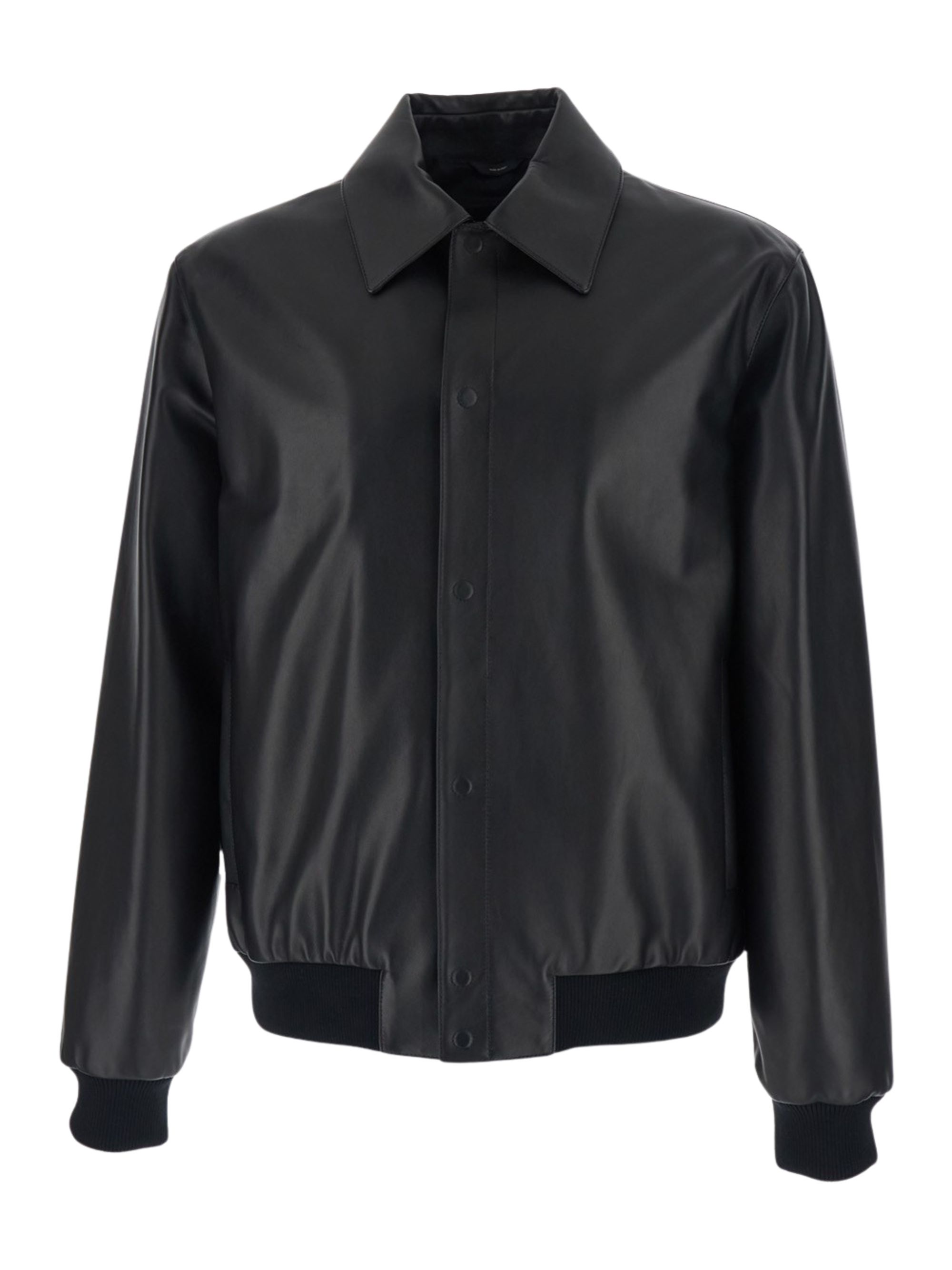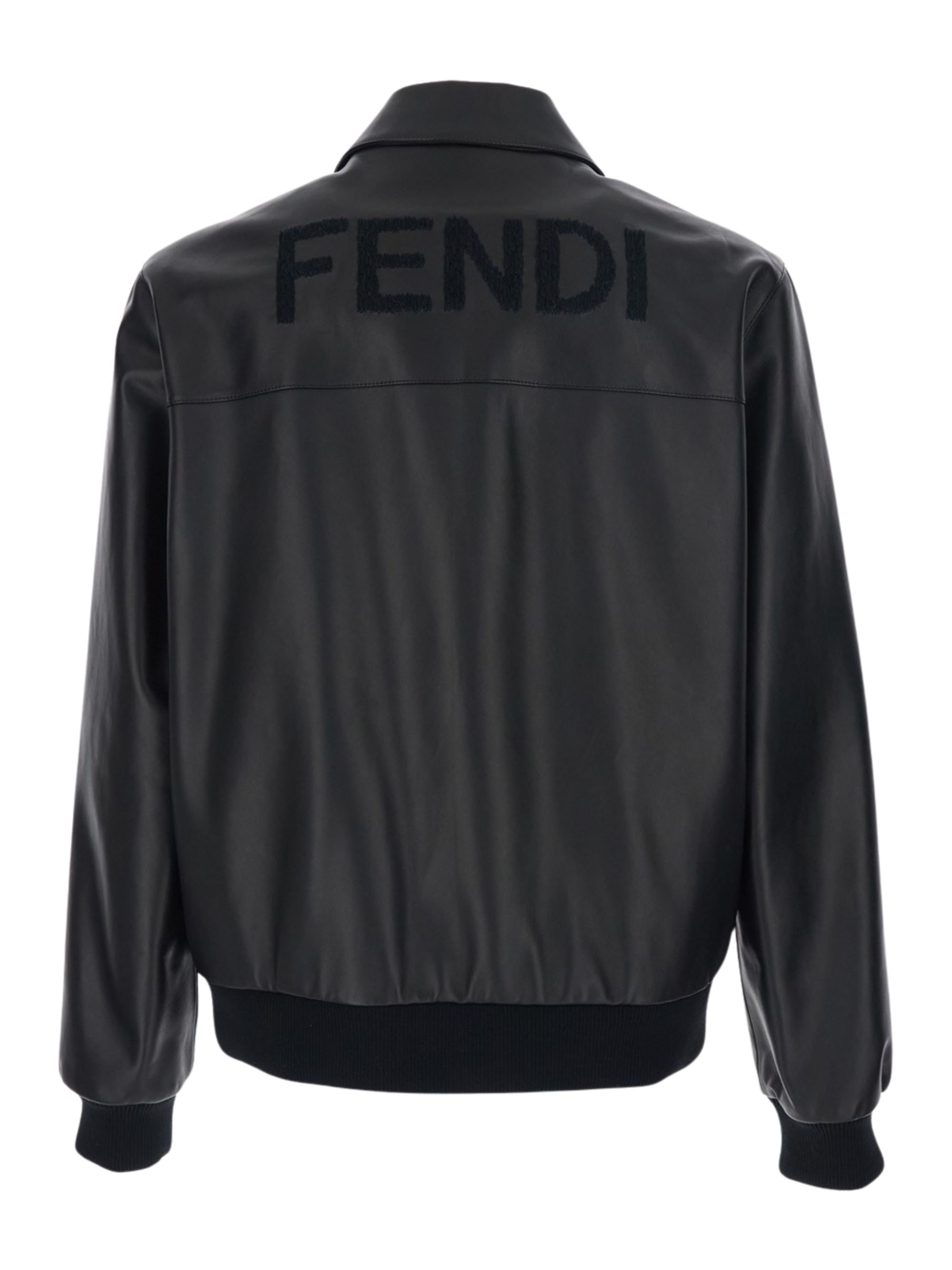 Black leather blouson jacket by FENDI, featuring a shirt collar, elastic ribbed cuffs and hem, side vertical welt pockets, hidden front fastening and maxi Fendi lettering embroidered on the back.