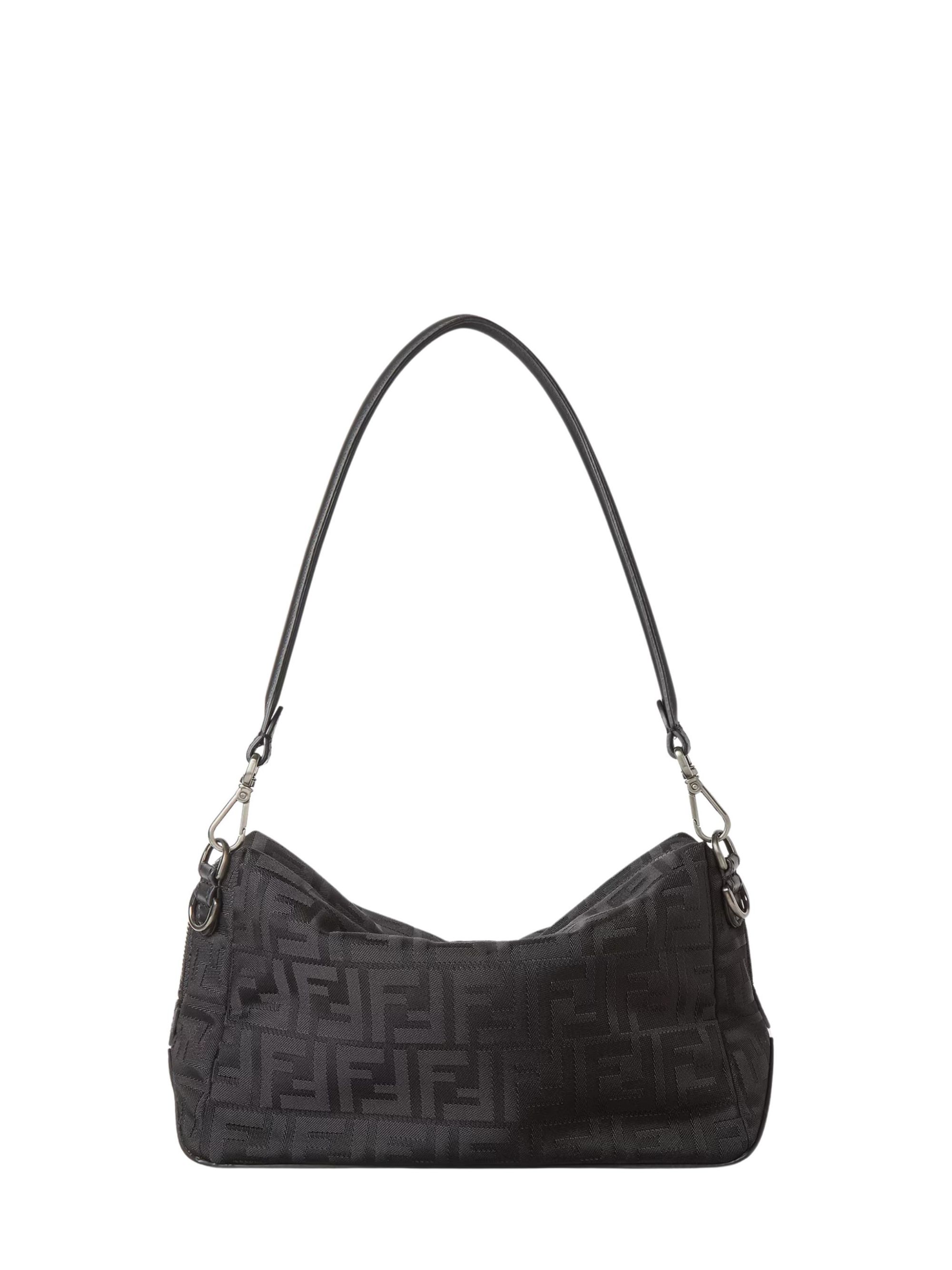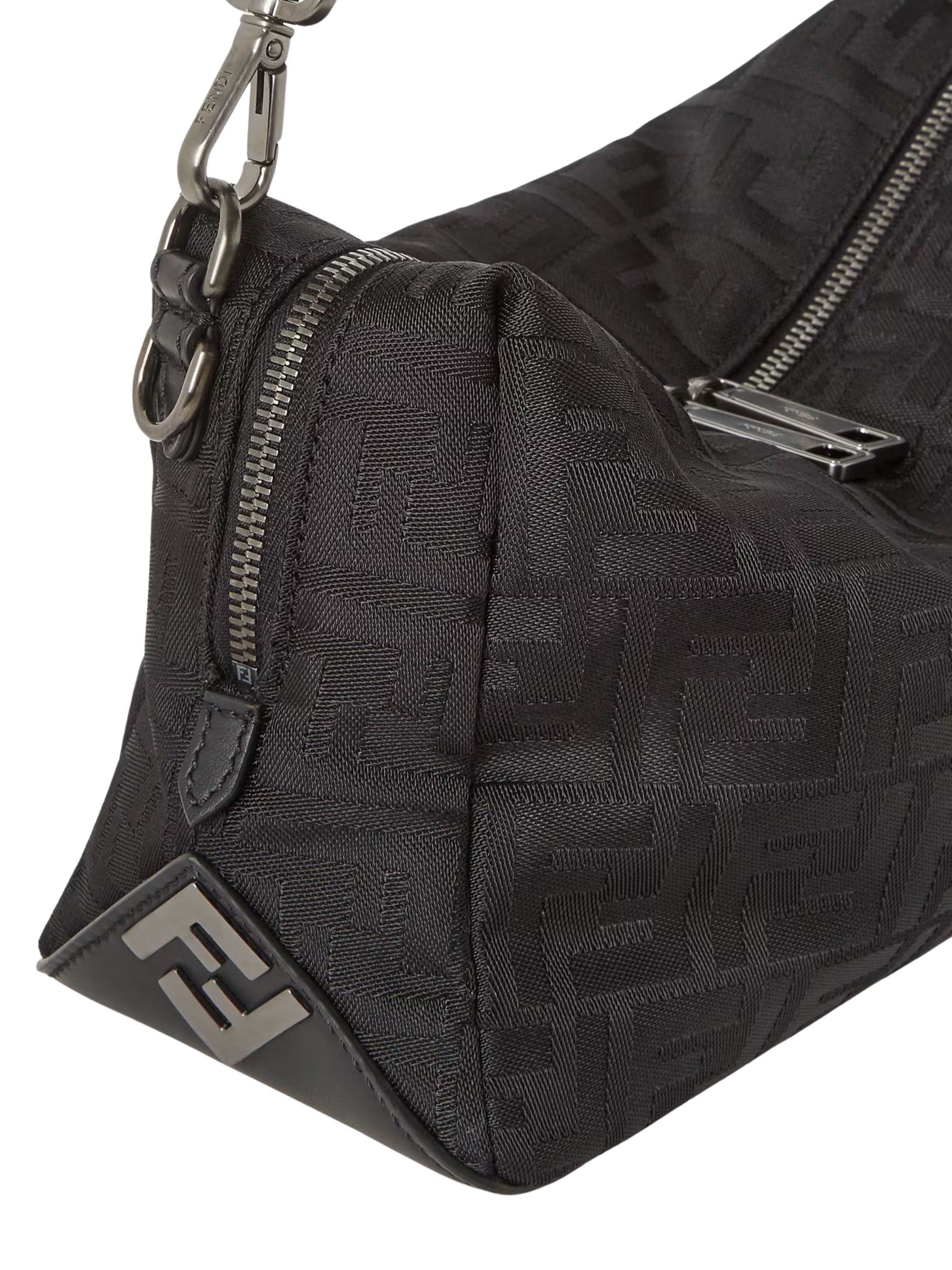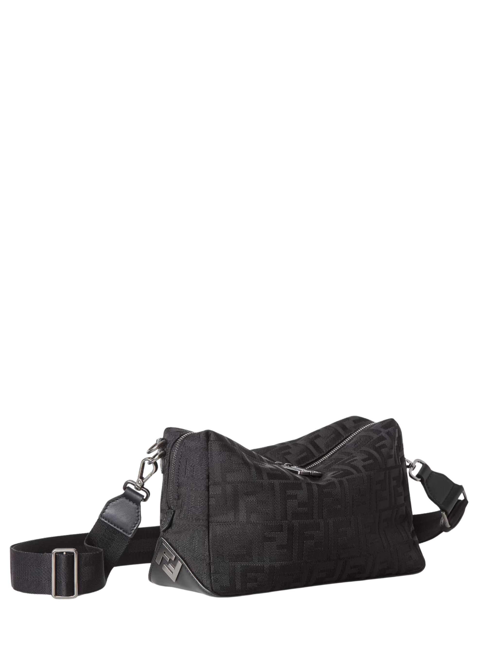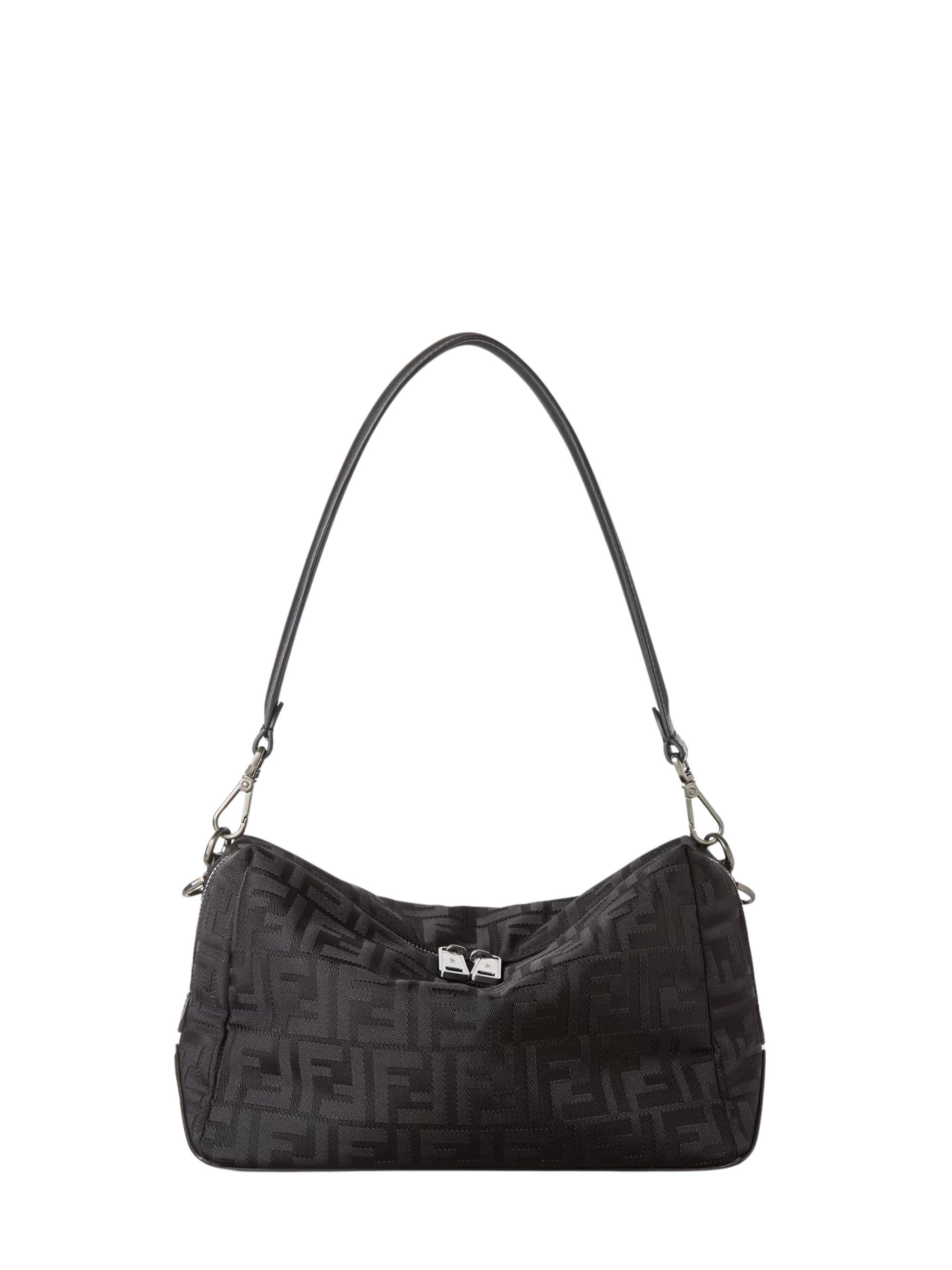 FENDI Lui Medium Squared FF bag in black leather and nylon, featuring a two-way zip closure, metal FF appliques on the corners, a leather handle, and a removable shoulder strap.