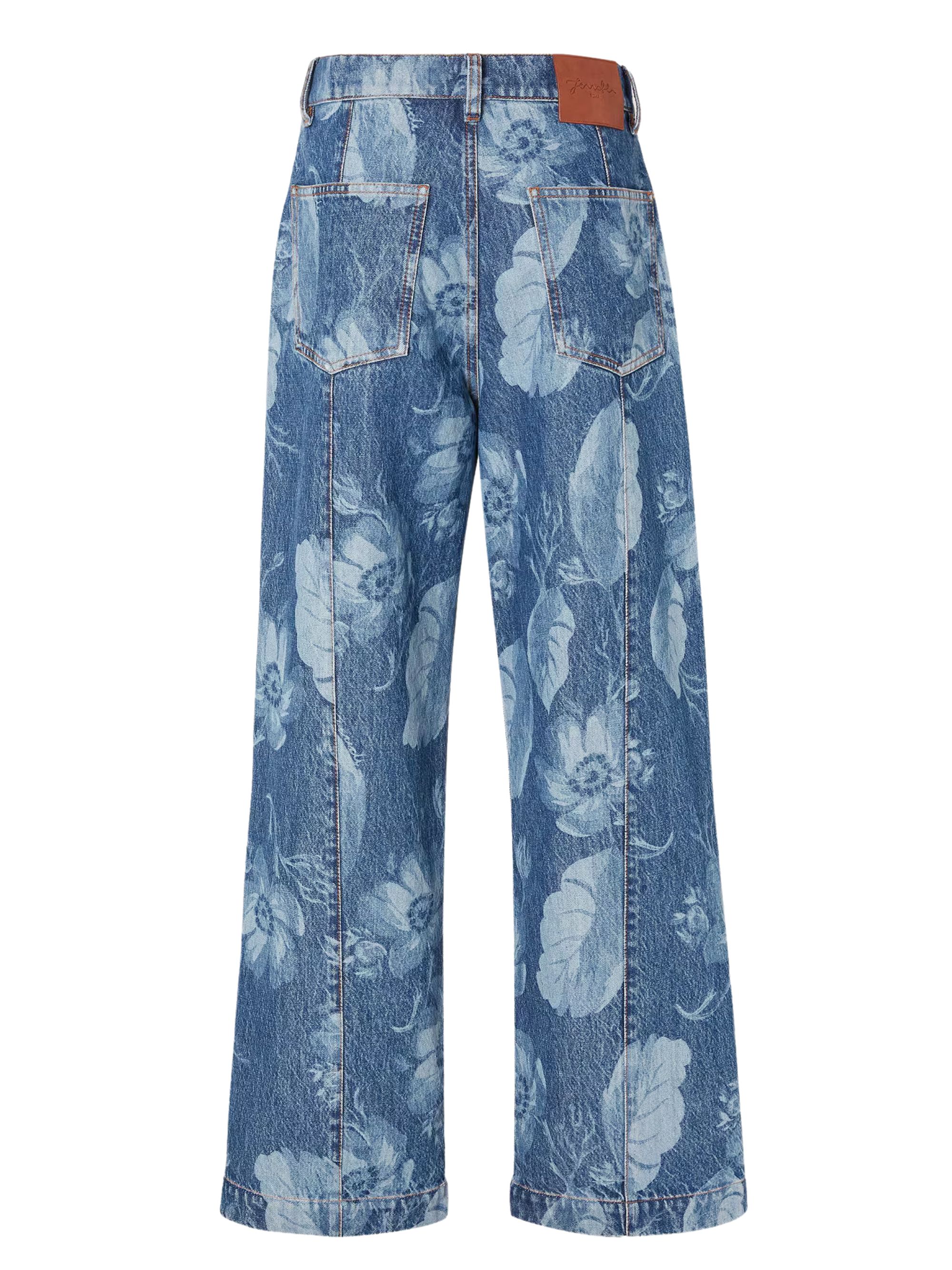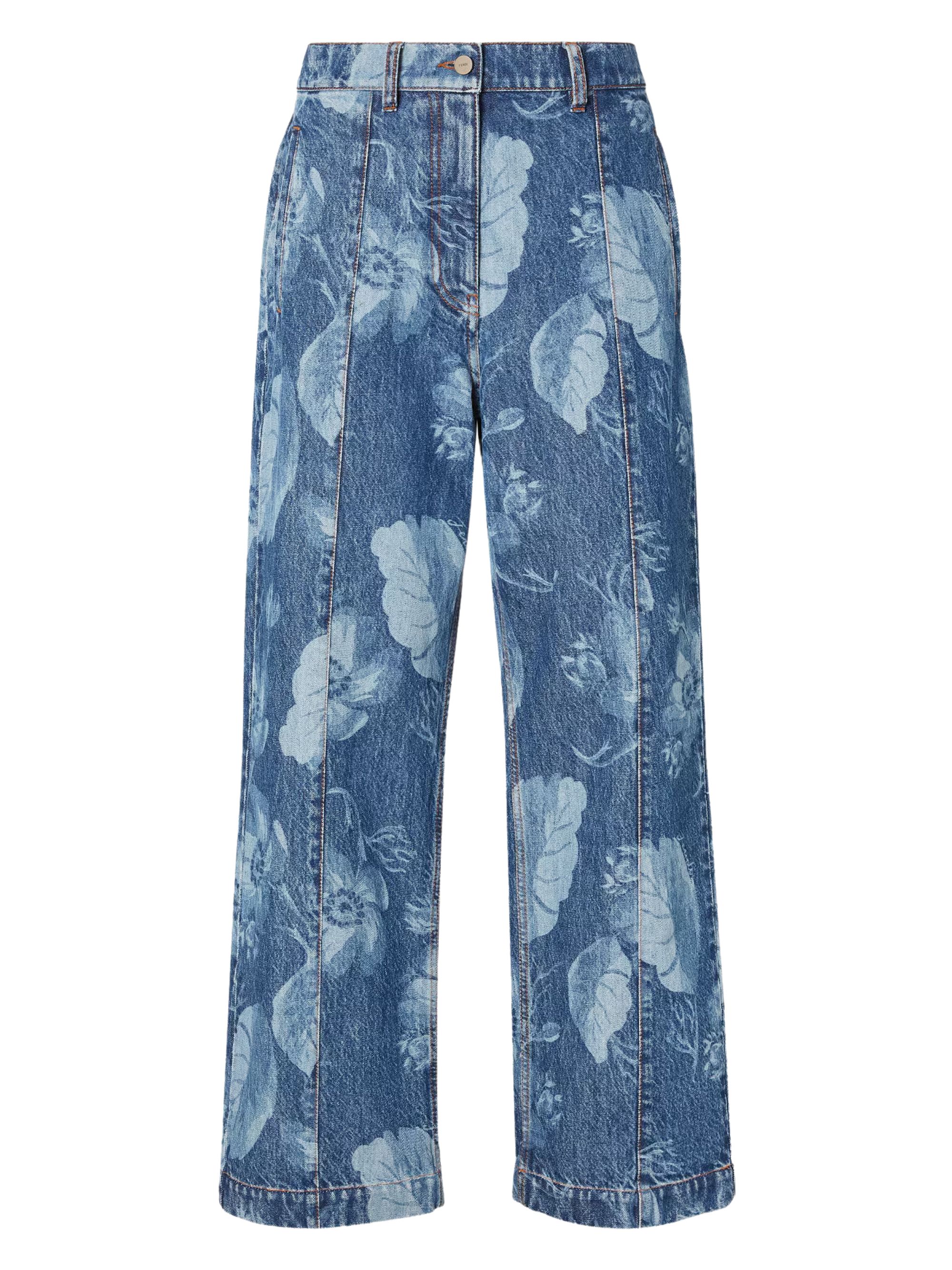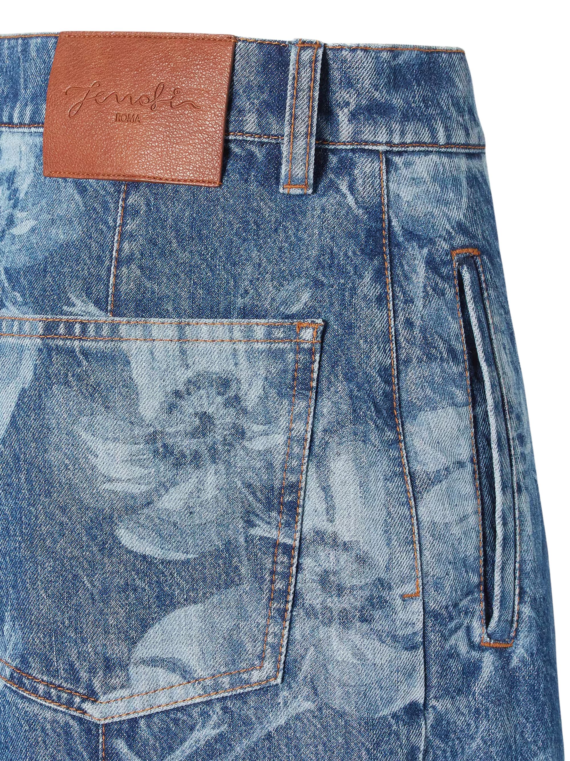 Regular-fit jeans by FENDI in blue cotton denim with crease stitched on the leg, side welt pockets and back pockets, featuring an all-over laser-cut Sea Garden motif in contrast, tobacco-coloured stitching and a concealed zip fastening with logo tack butt