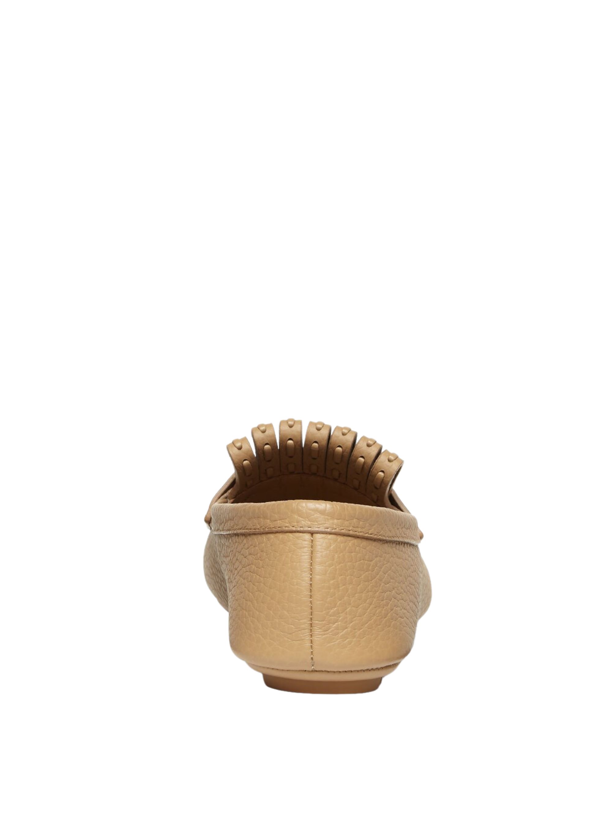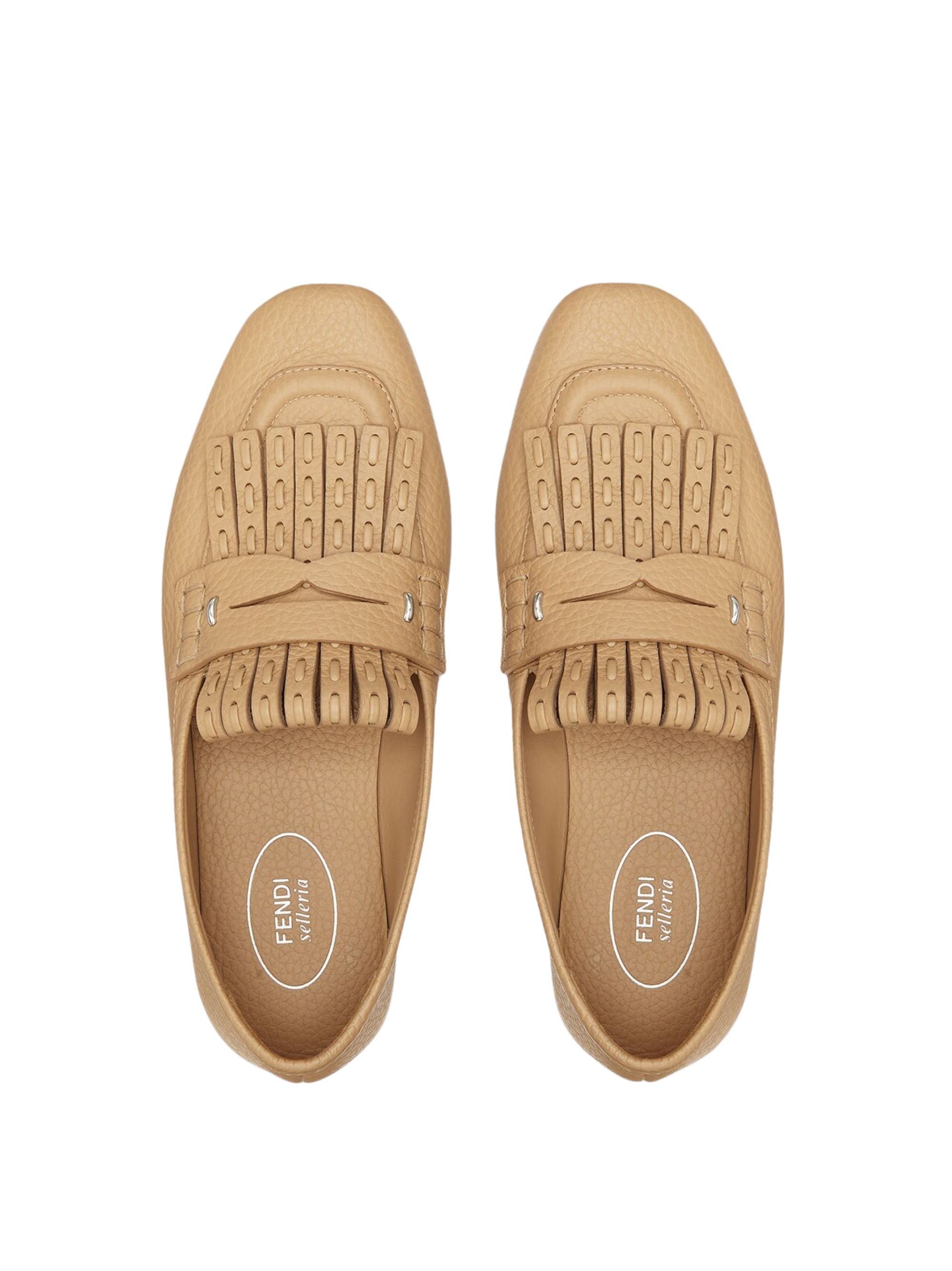 FENDI Selleria moccasin in beige leather with metallic stitching, a fringe detail with tone-on-tone macro stitching, and a flexible rubber outsole with pebbles.