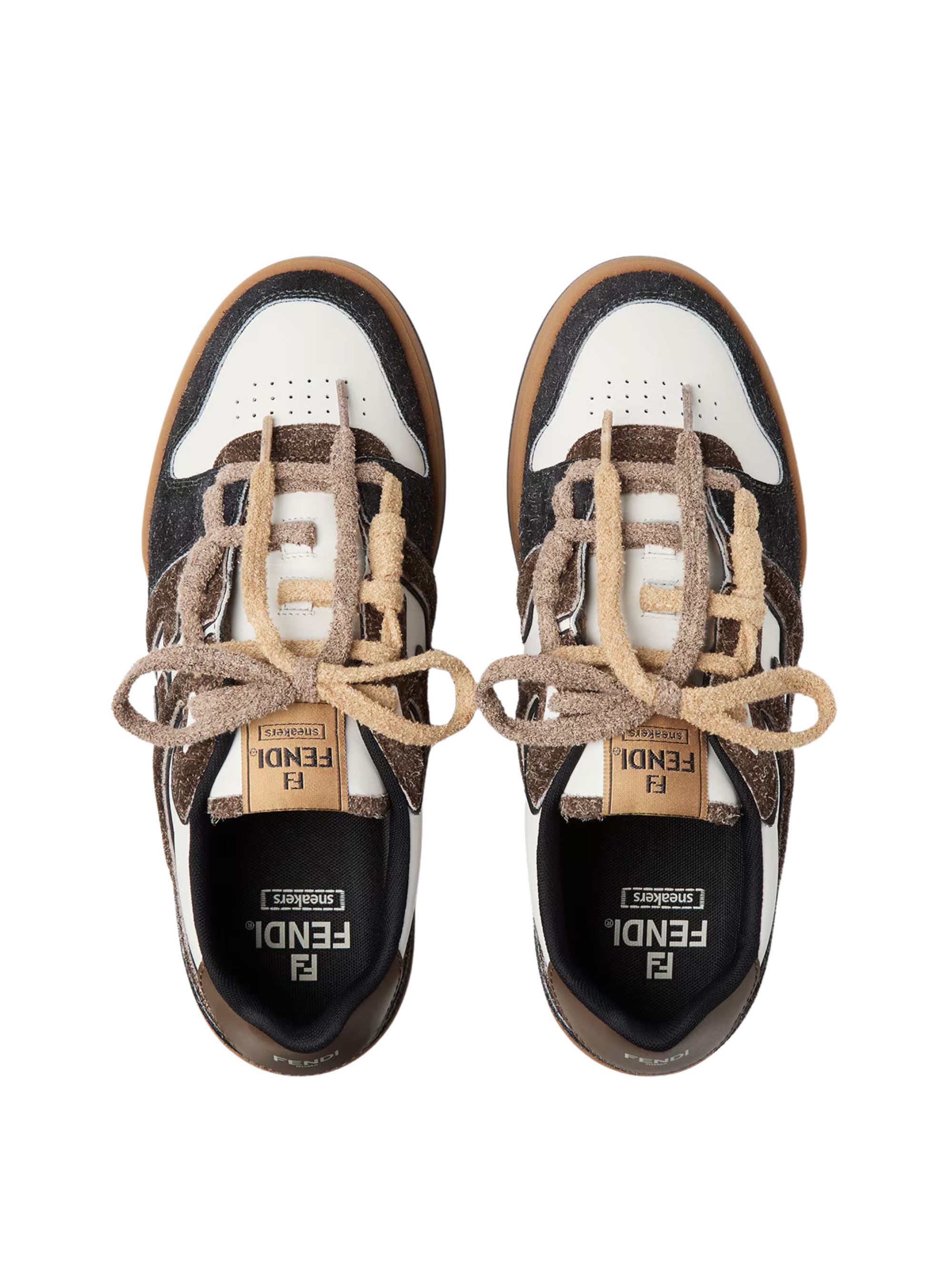 FENDI Match Trainers sneaker in white and brown leather and suede, featuring FF motif on the sides, sponge laces, rubber sole and side logo.