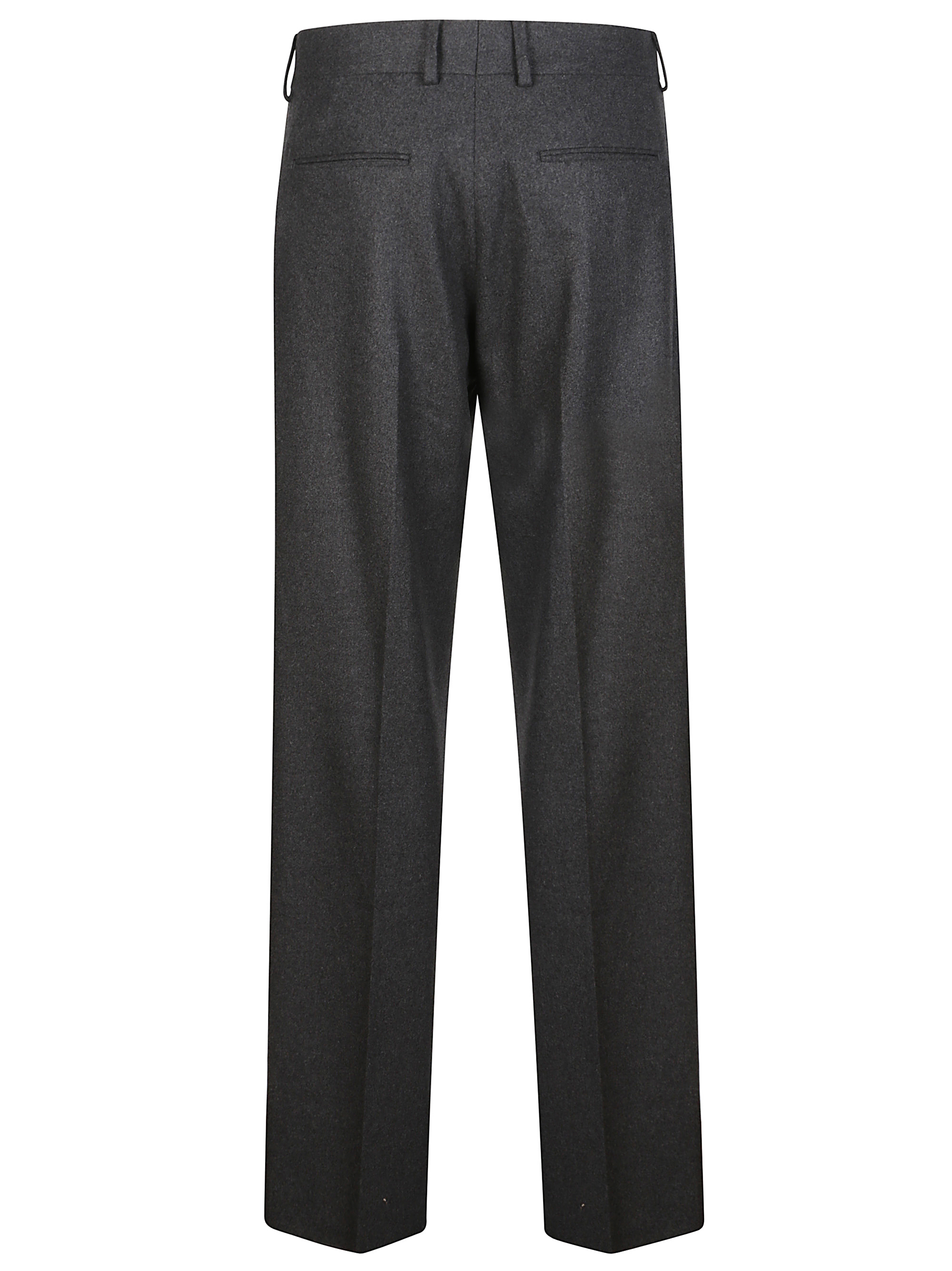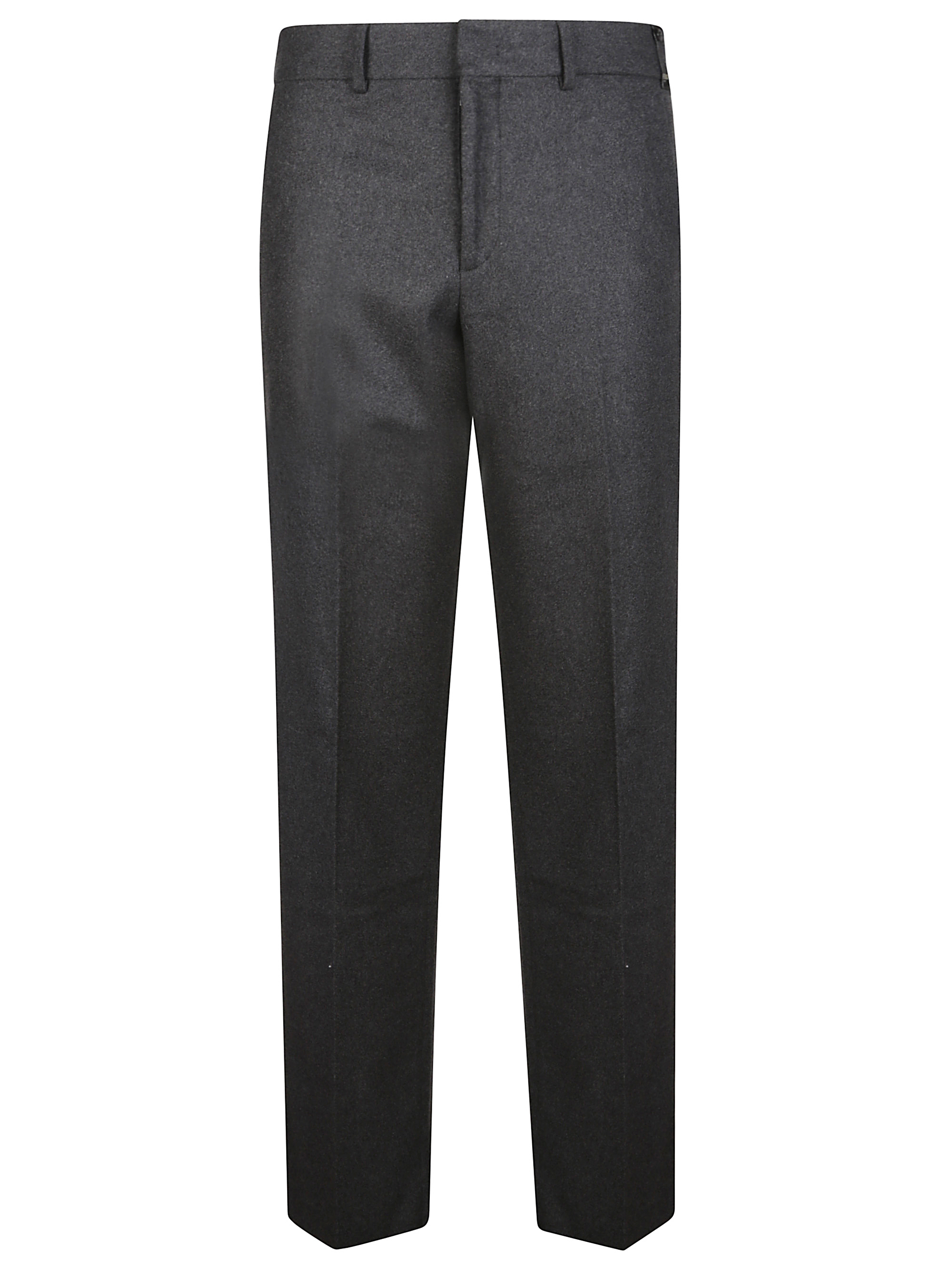 Tailored trousers by FENDI in dark grey cashmere blend with mélange effect, belt loops, hidden diagonal side and back pockets, pressed crease, straight fit and hidden front fastening with button, hook and zip.