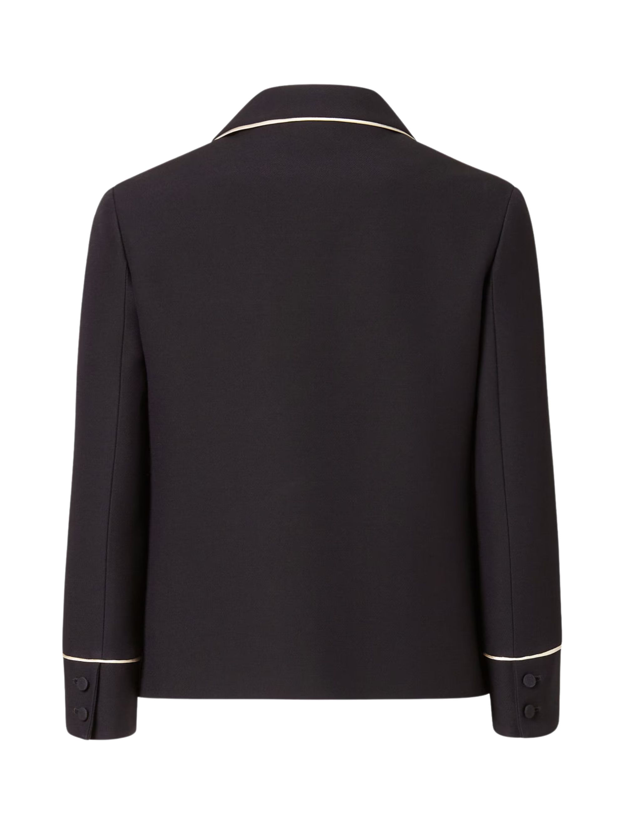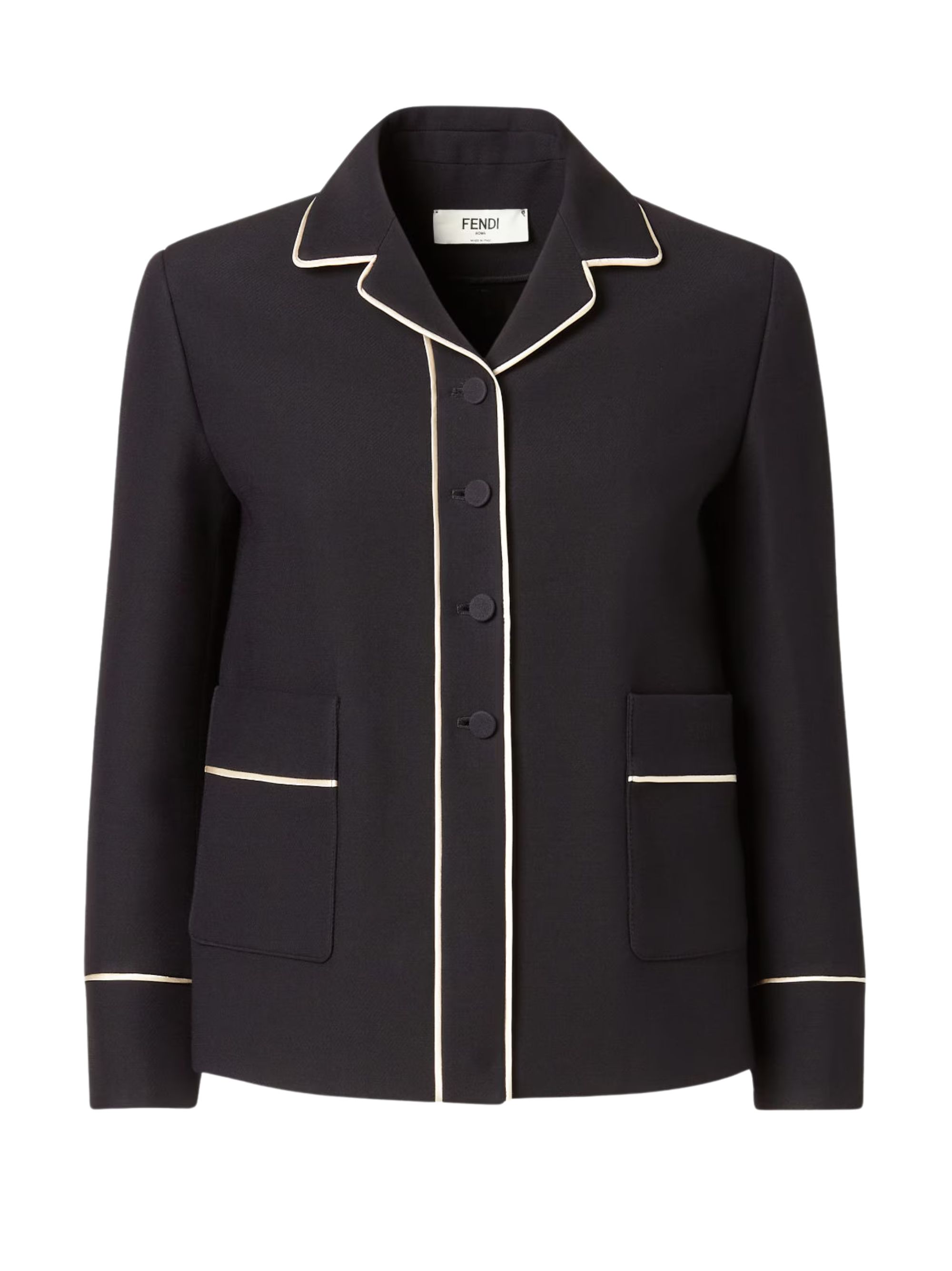 Black wool and silk jacket by FENDI, featuring a pyjama collar, long sleeves, patch pockets on the front, a fastening with 4 matching covered buttons and finished with contrasting piping.
