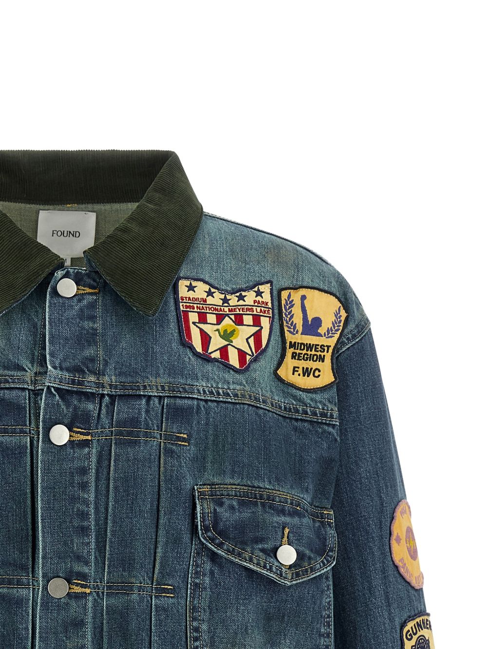 Denim jacket by FOUND featuring applique patches, a velvet shirt collar, long sleeves, and a button closure.