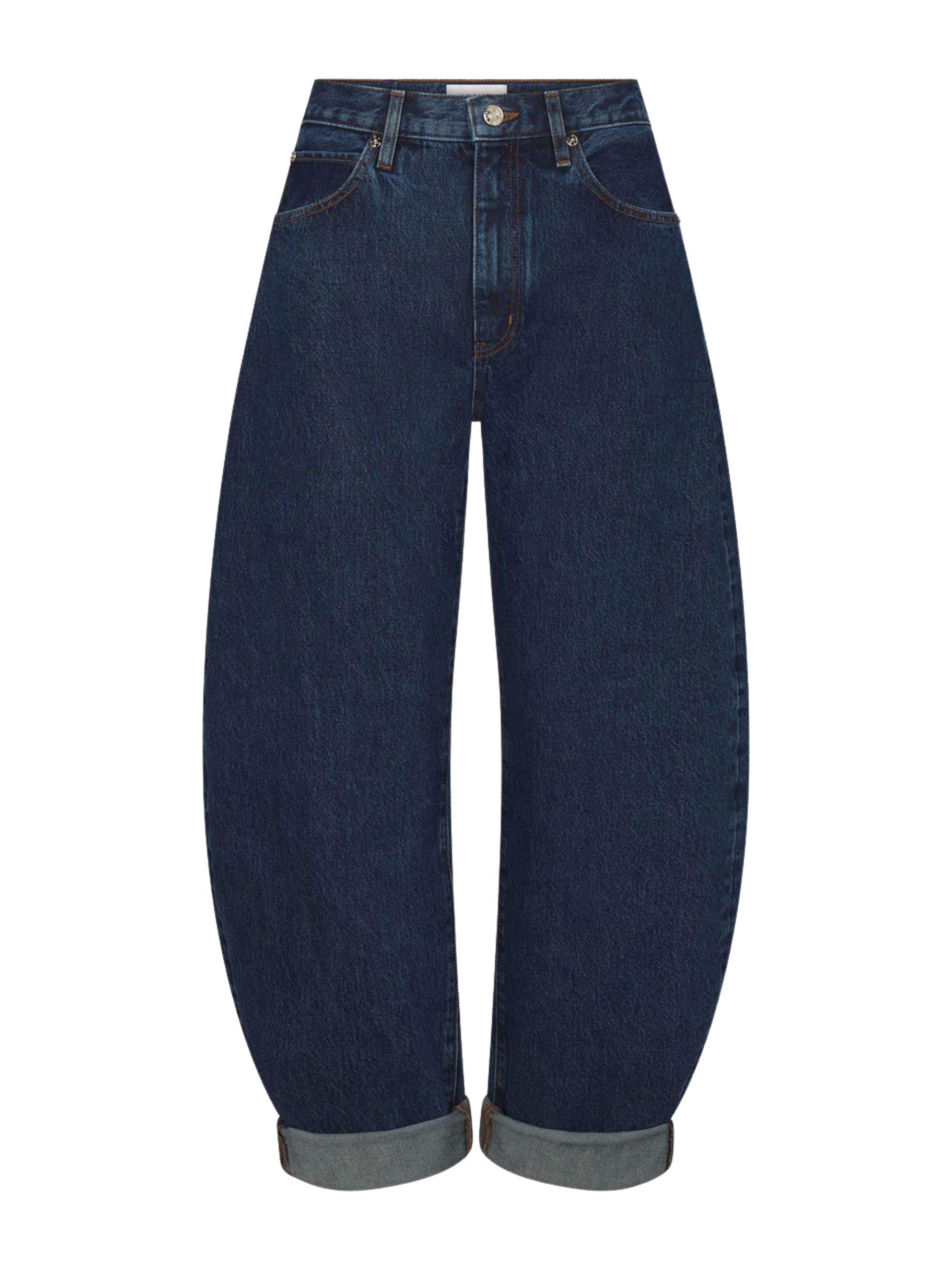 The Bubble jeans by FRAME in blue cotton, featuring a high waist, round leg, 5 pockets, belt loops and button and zip fastening.
