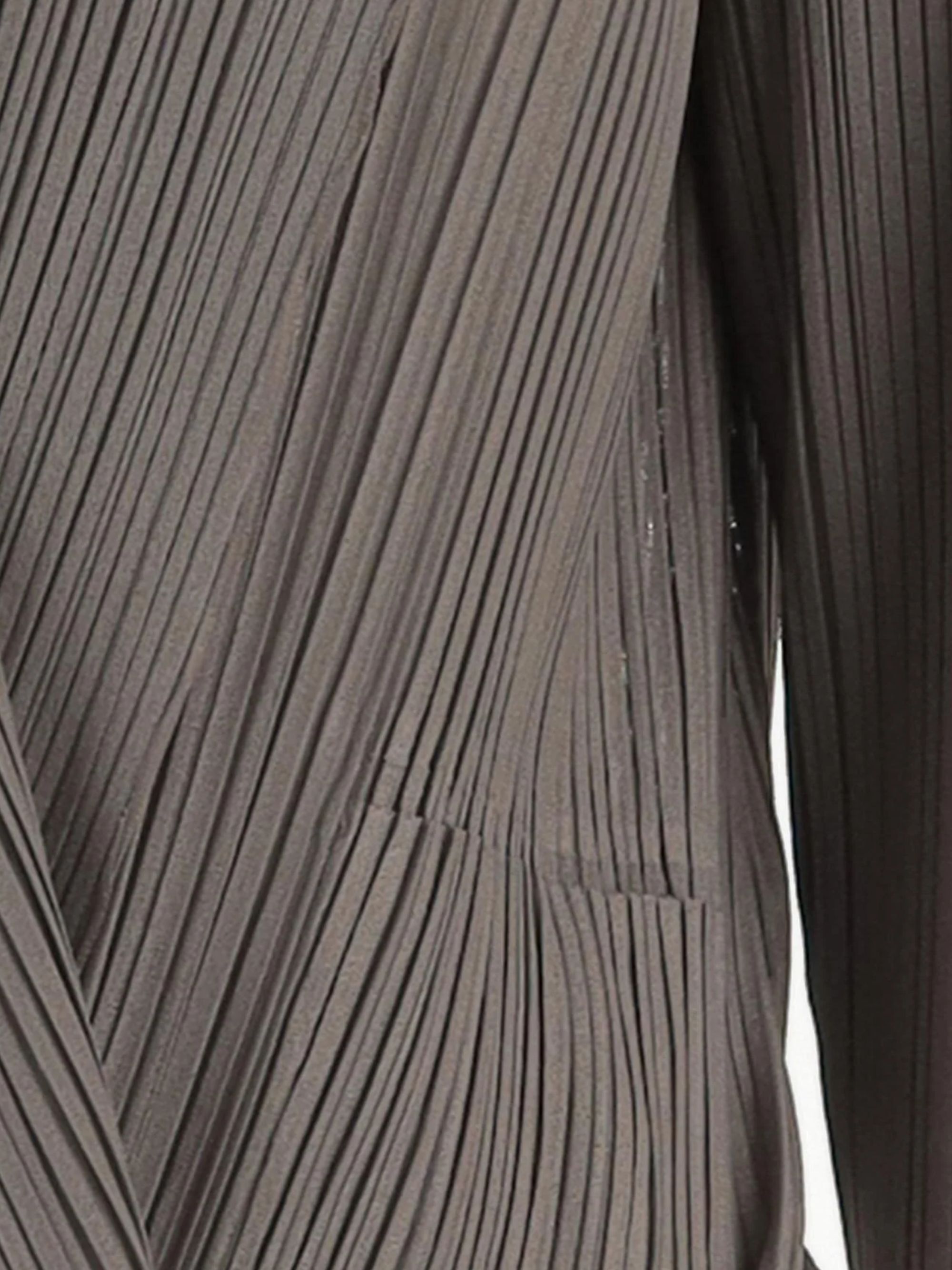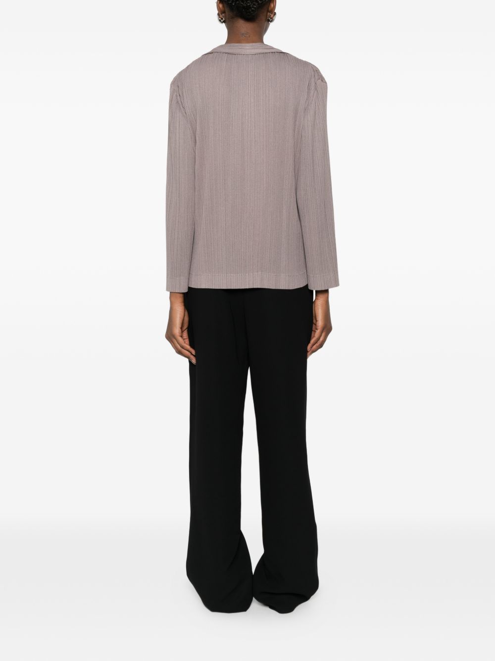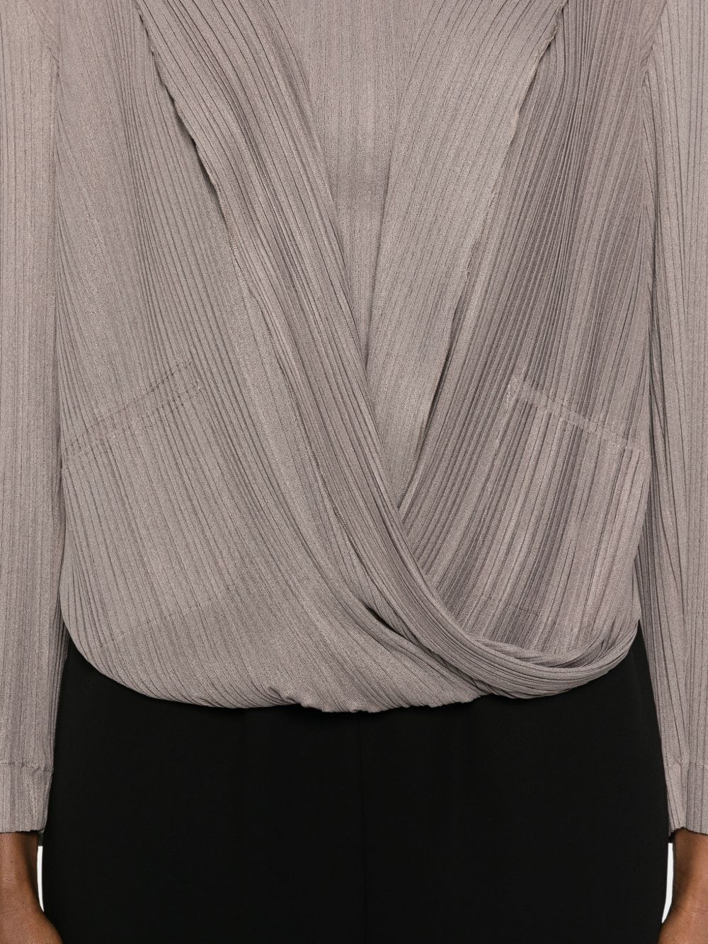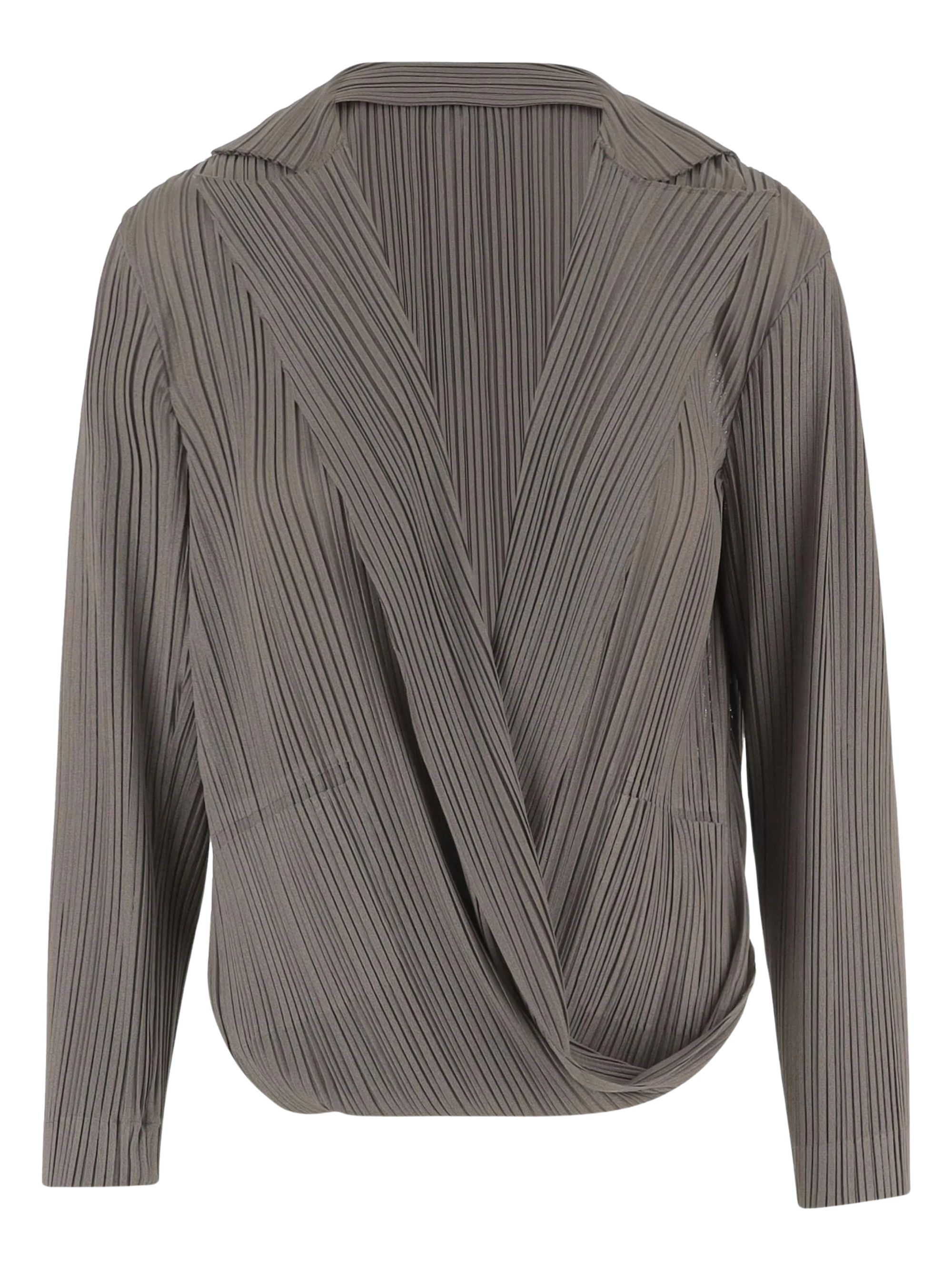 Brown pleated jersey shirt by GIORGIO ARMANI, featuring notched lapels, asymmetrical fastening and long sleeves.